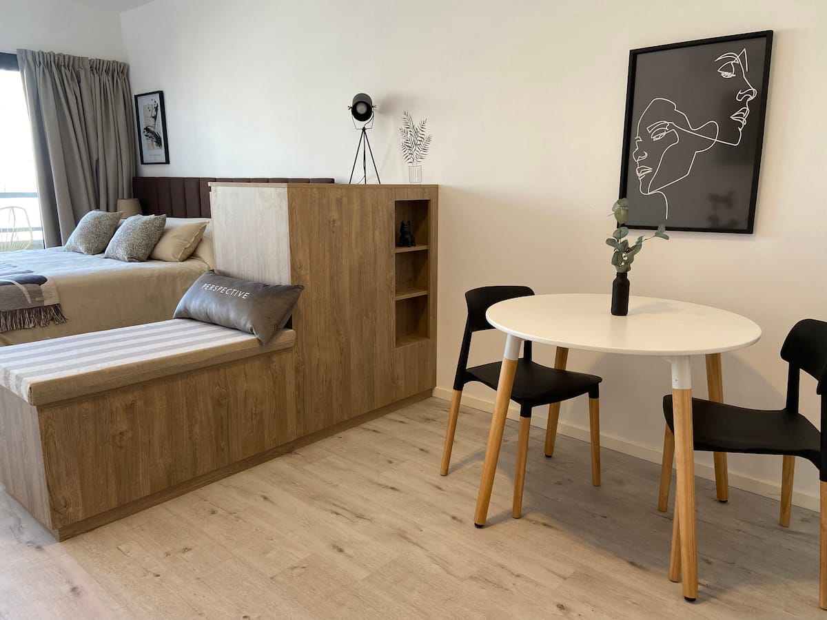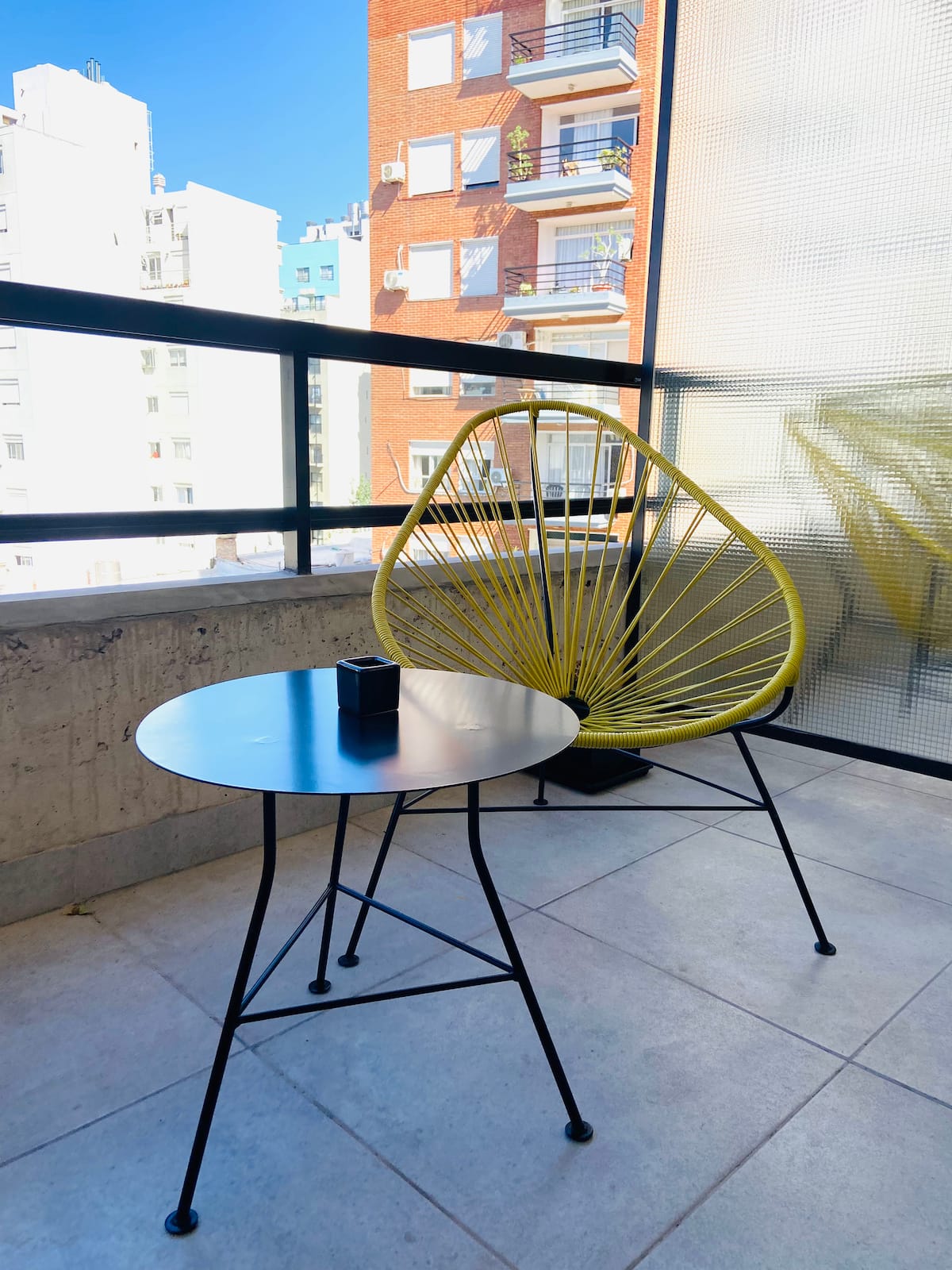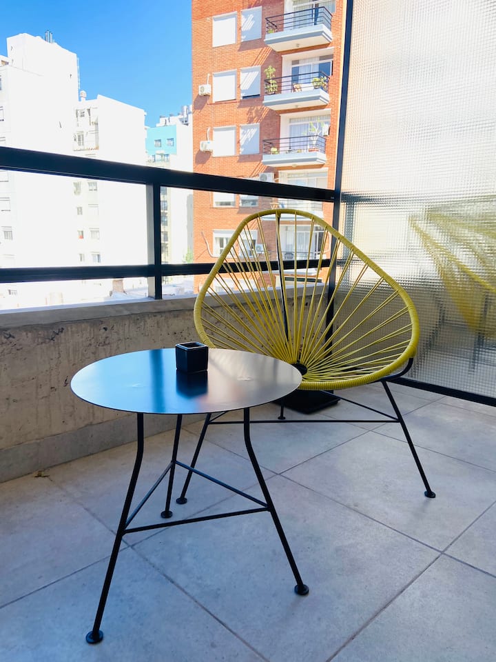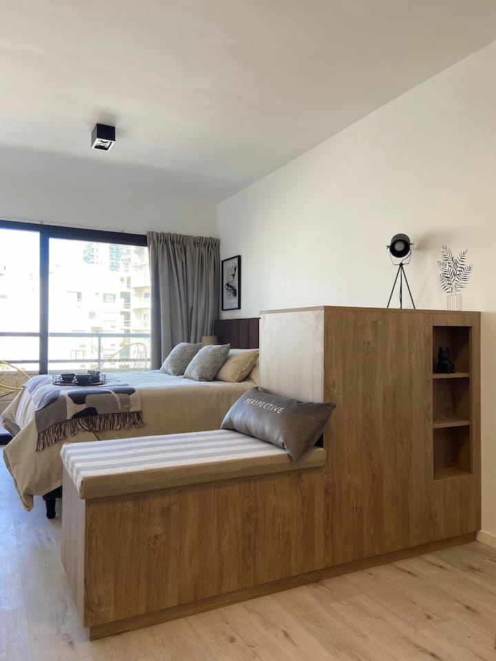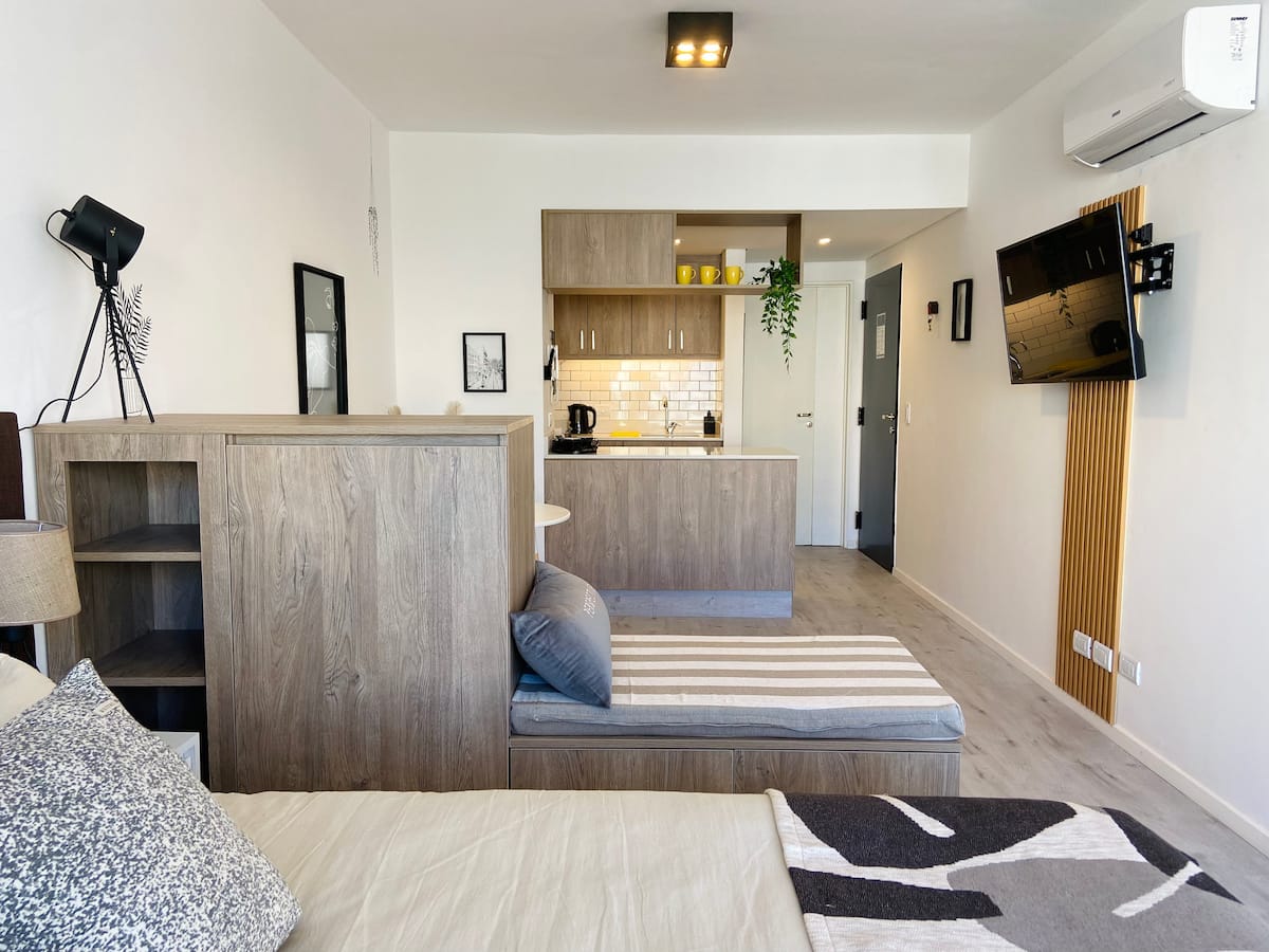 Modern studio apartment. The listing describes a large, bright unit with all necessary conditions for a stay. The surrounding area is described as having bars, theatres, shopping and tango dance venues.