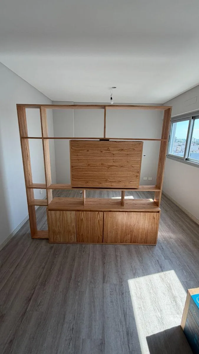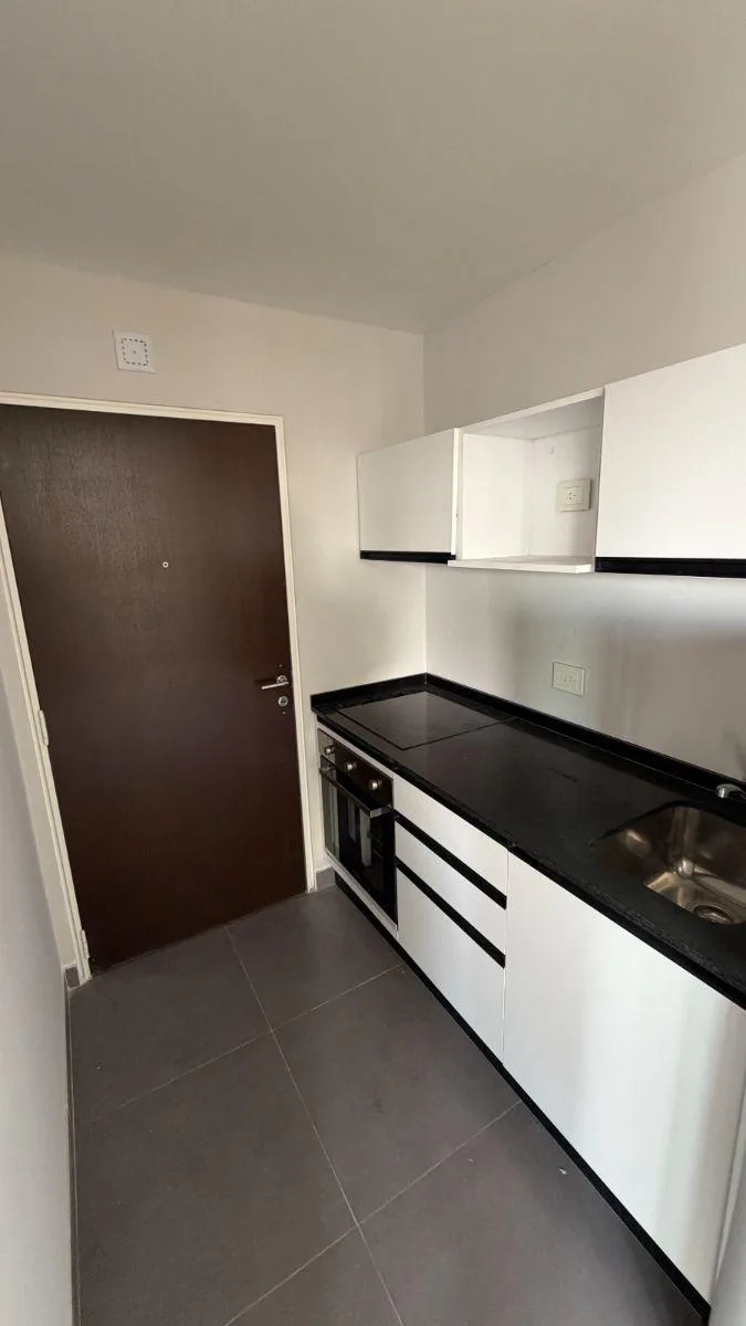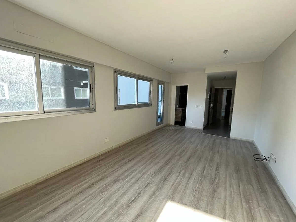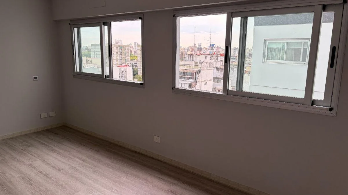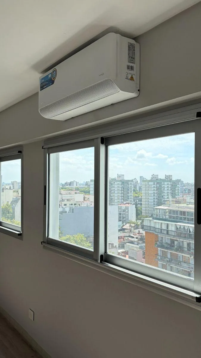 Studio apartment on Av. Díaz Vélez, 12th floor. 32 m² covered plus 4 m² balcony, with integrated kitchen and a full bathroom with vanity. Two exterior windows allow the layout to be divided into a two-room unit. The unit has electric built-in oven, an electric cooktop and extractor, individual radiant-floor heating with room-level regulation, and a split air-conditioning system. The building offers access courtyard, security booth, three elevators, assigned parking spaces, storage room, bicycle