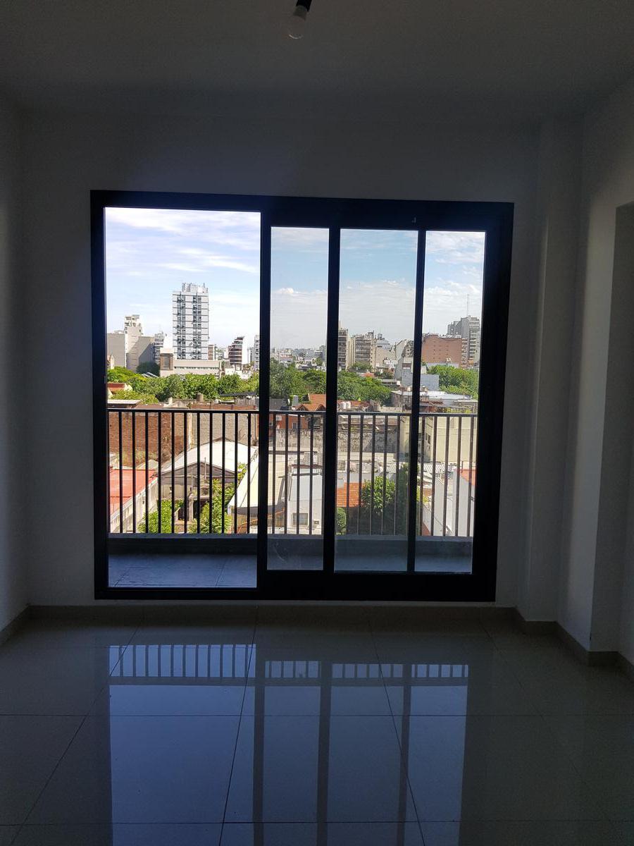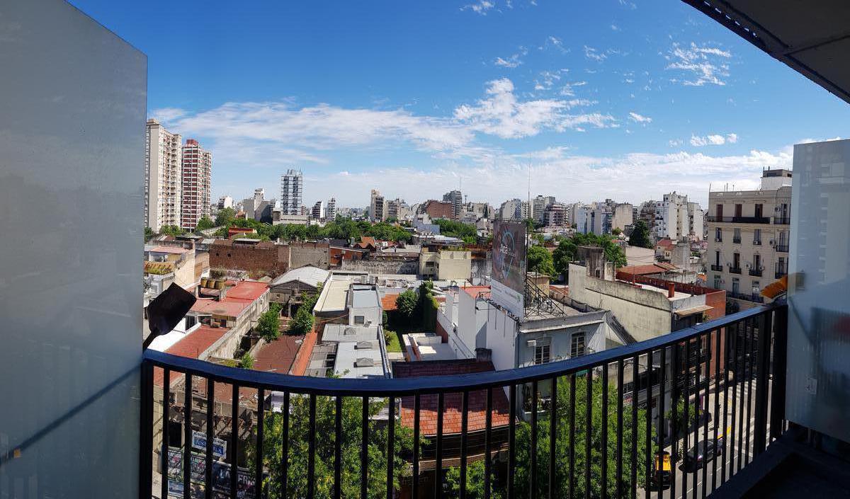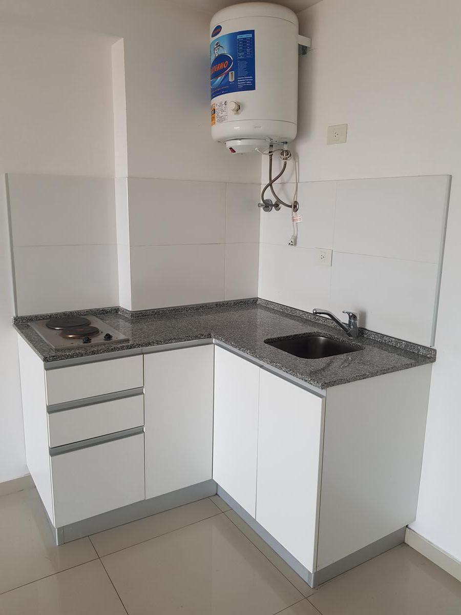 Studio apartment on Av Independencia 3355, street-facing with a front balcony. Porcelain-tile flooring, electric water heater, two-burner cooktop, and base kitchen units; full bathroom. The building has a 24-hour security service and amenities including two pools, a communal room (SUM), grills, gym, and laundry.