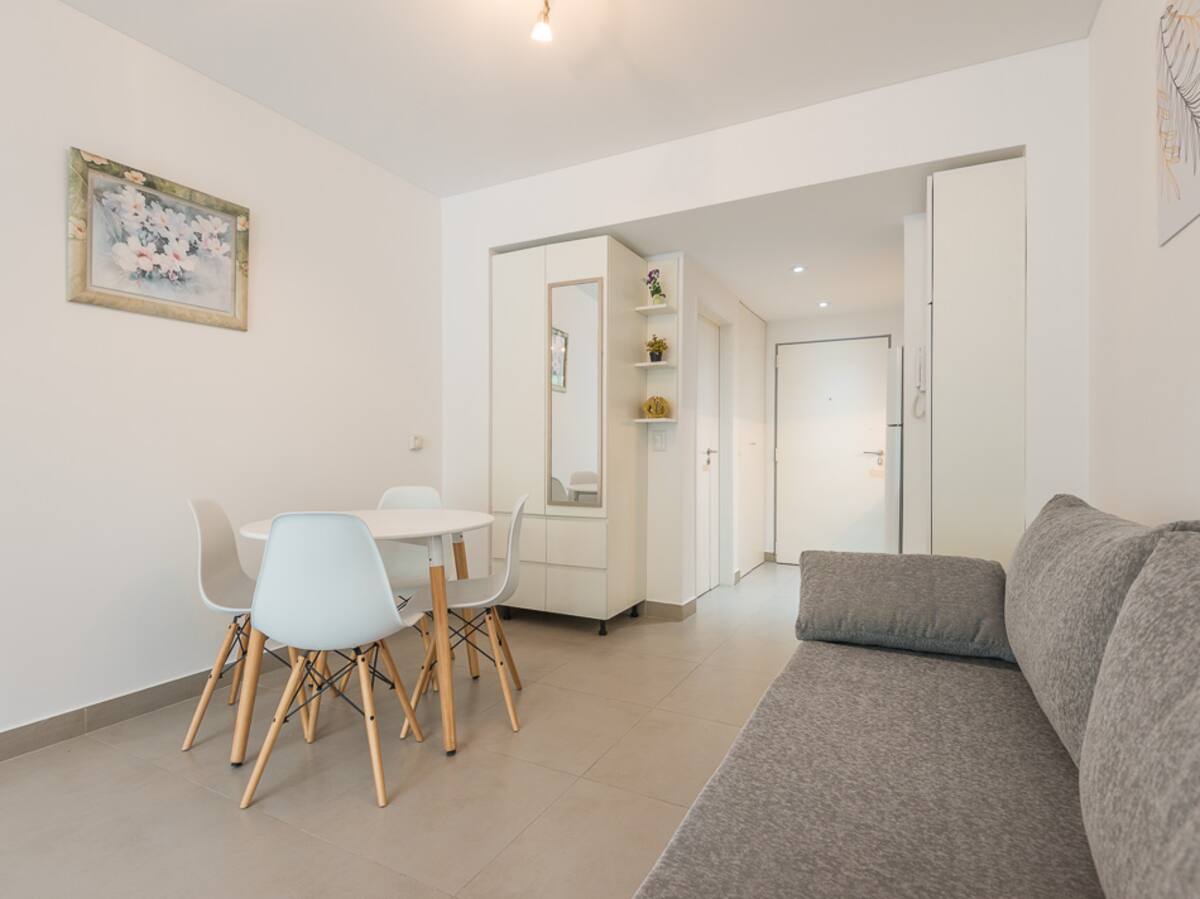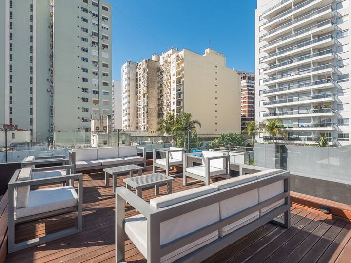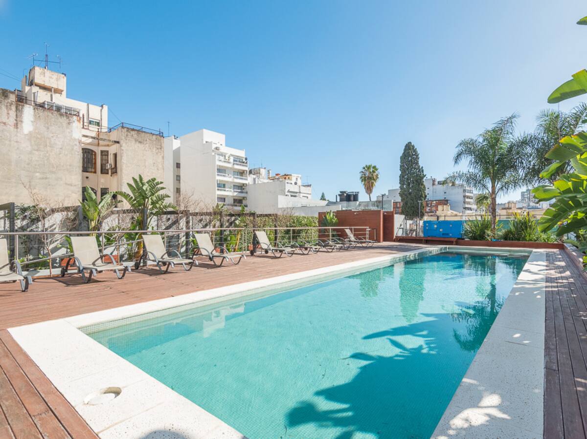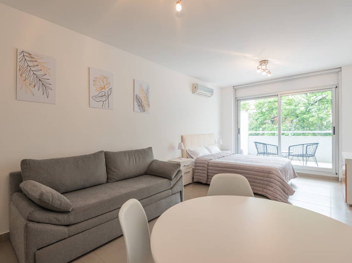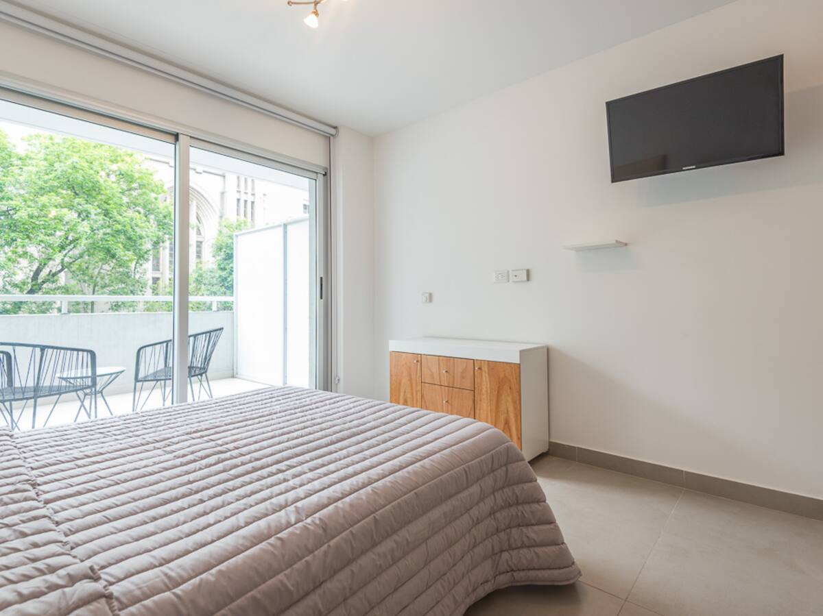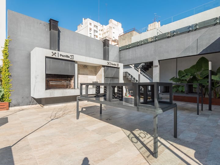 Equipped studio apartment in Almagro on Av. Rivadavia, close to transport and medical institutions. It has a double bed and a single sofa bed, a dining table with chairs, a kitchen with a refrigerator with freezer, a full bathroom, and a balcony. Cable TV and Wi-Fi internet are available. The building has a heated pool, gym, coin-operated laundry, tennis court, garden and a grill, with the grill available for an additional charge.