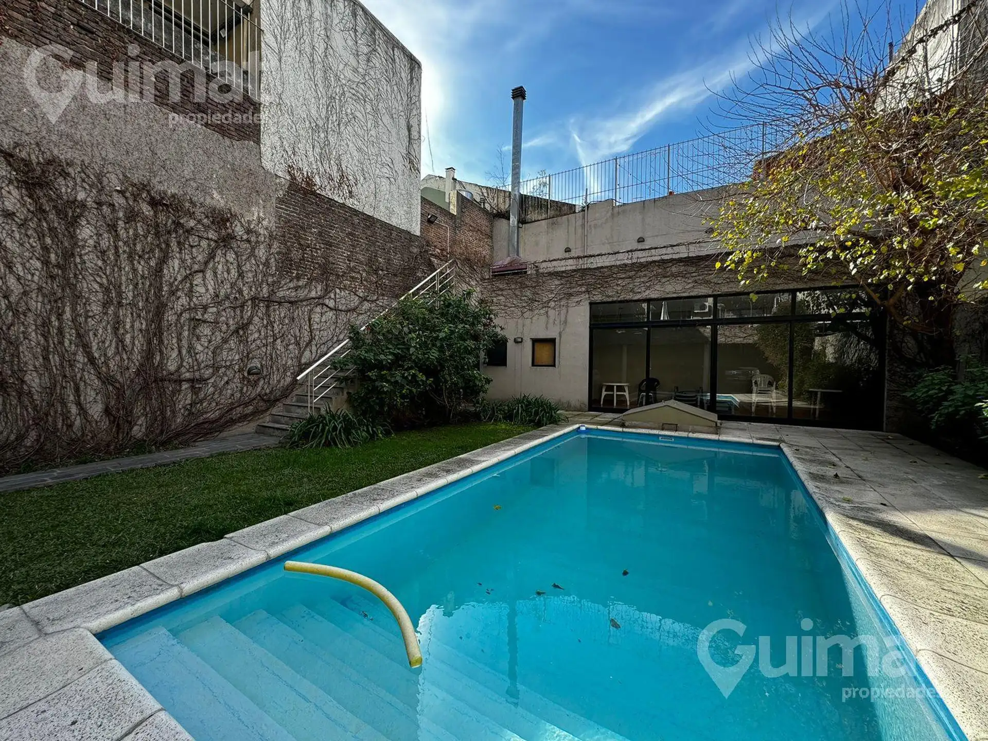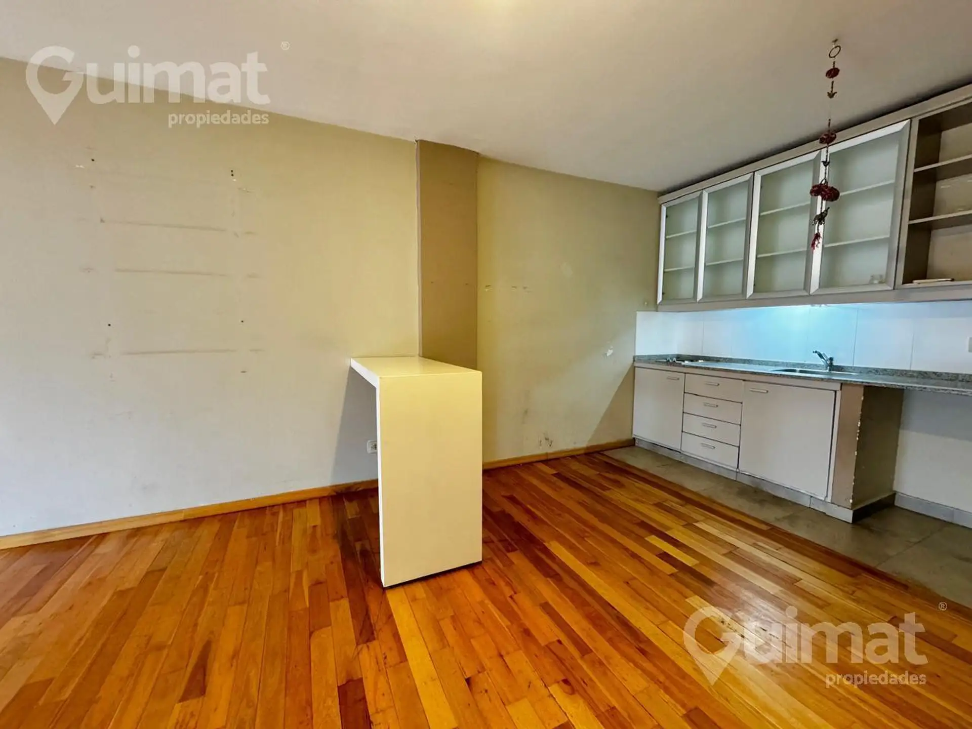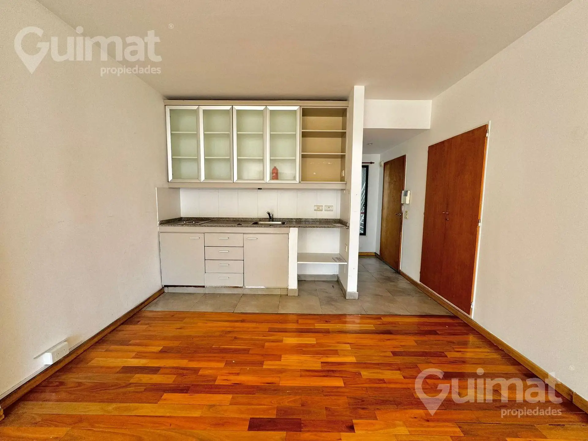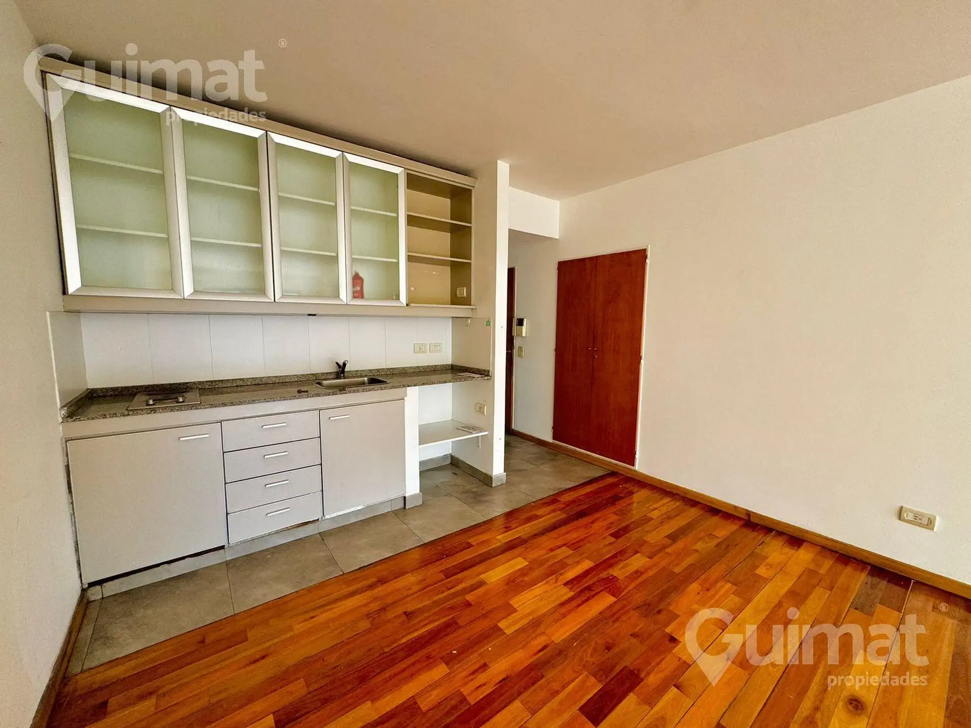Studio apartment of unspecified size, courtyard-facing with an open view and natural light, plus a balcony. Integrated kitchen, full bathroom, and built-in wall closet. The building has amenities including laundry, pool with green areas, grill, and a communal room (SUM), and the unit is suitable for professional use. Located two blocks from Avenida Córdoba, close to several bus lines.