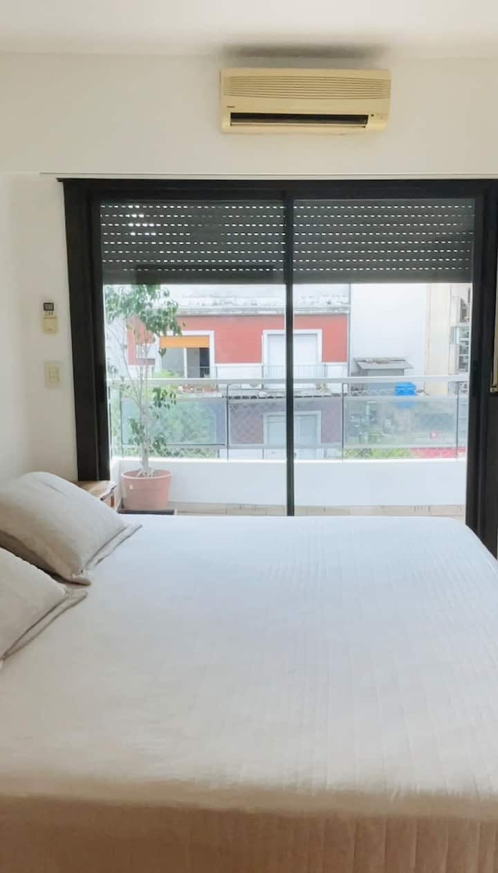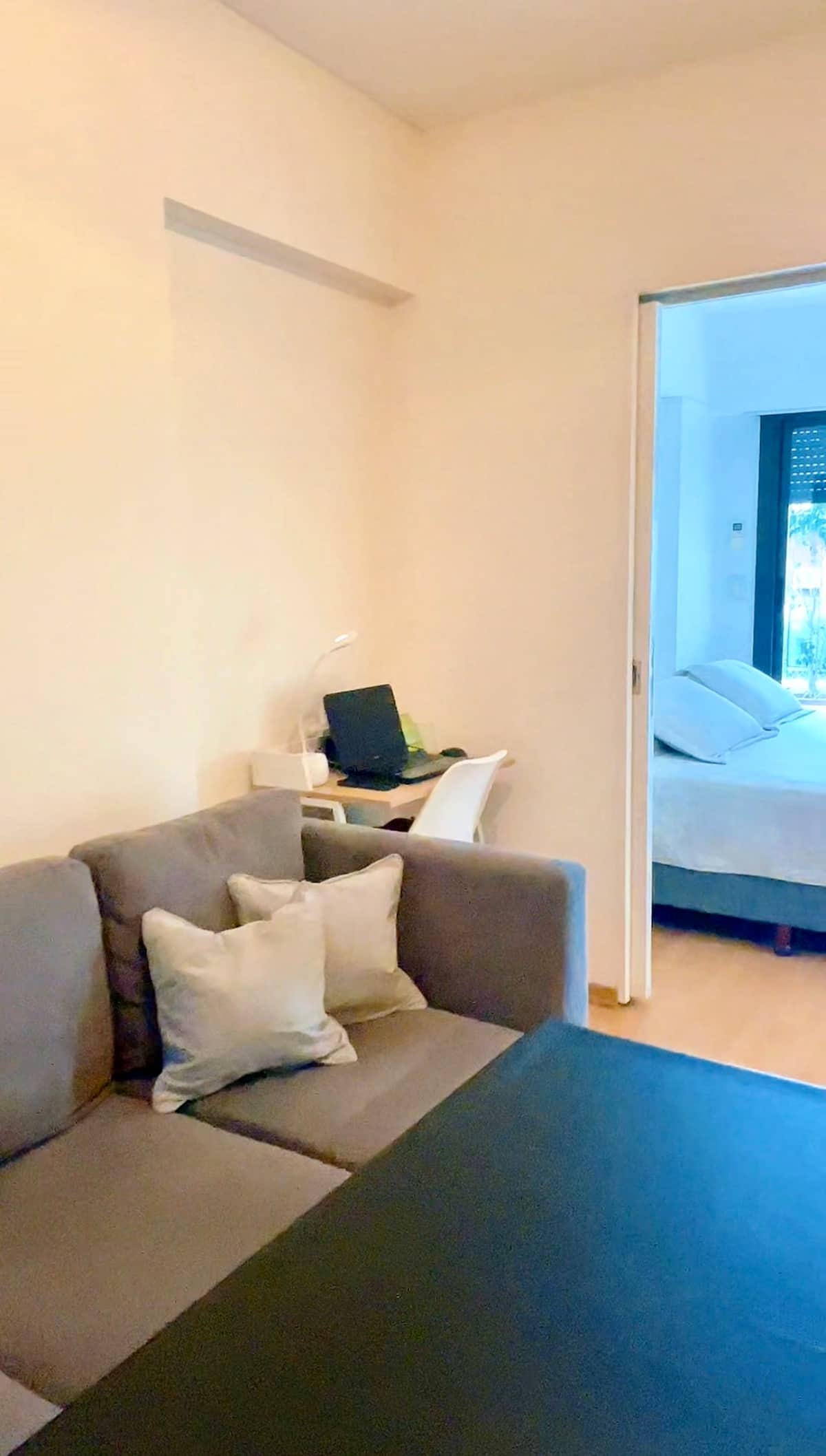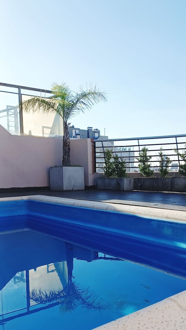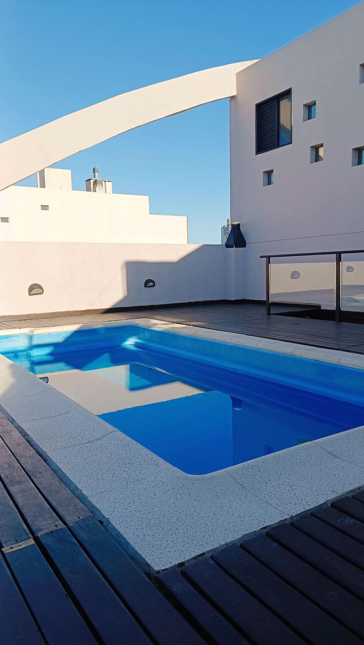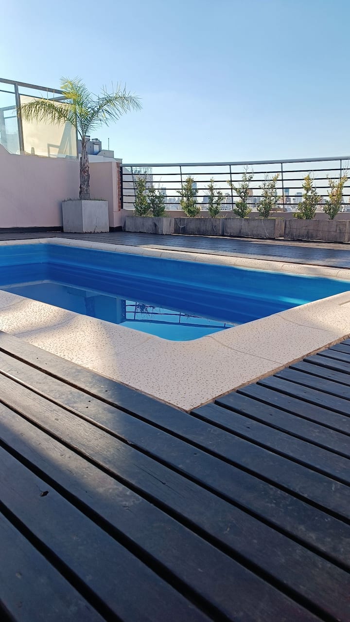 Studio apartment in Almagro with a double bed. Includes a full kitchen and a bathroom with a bathtub. The building has a swimming pool, a rooftop terrace, and free parking; each unit can be accessed by lift or stairs.