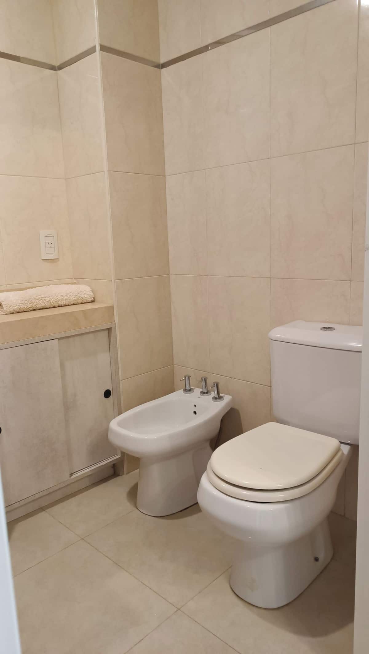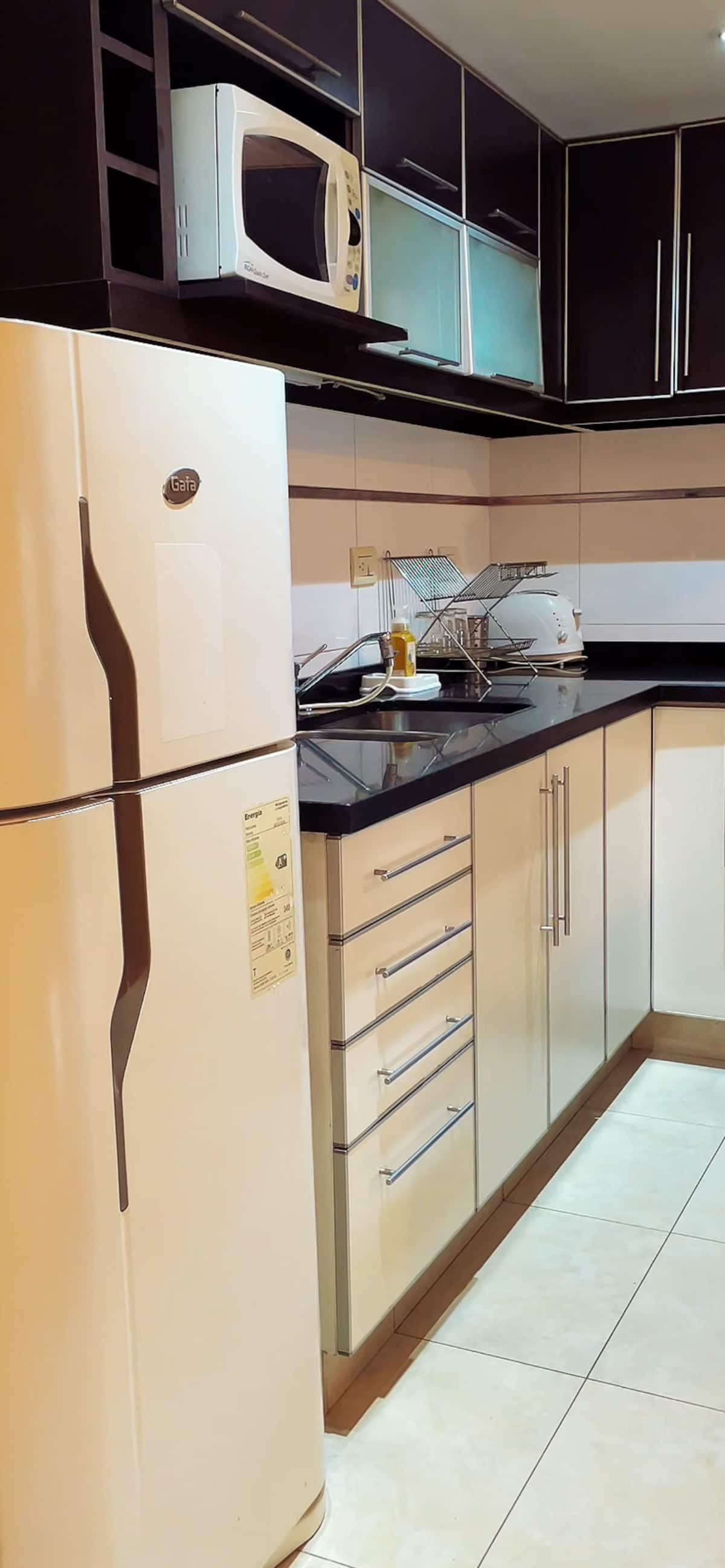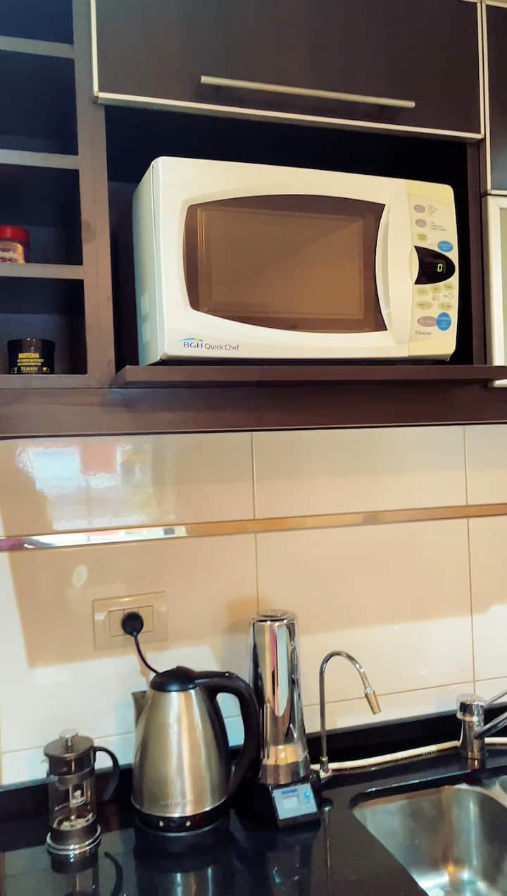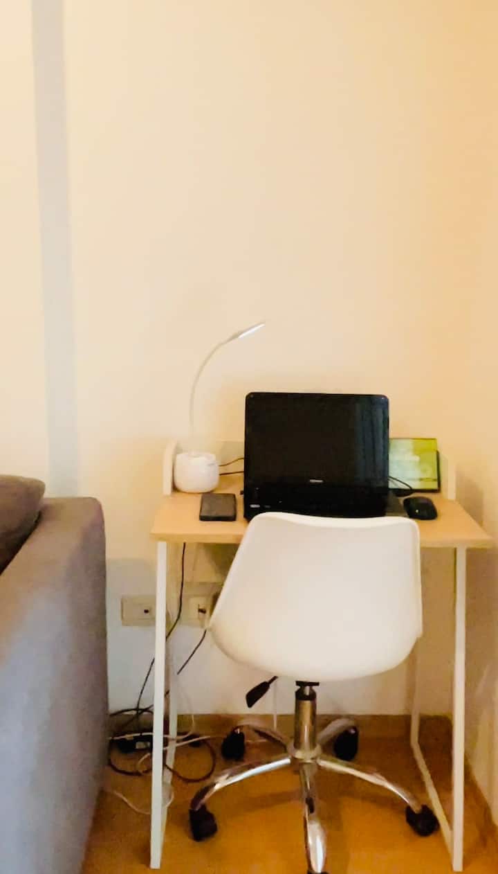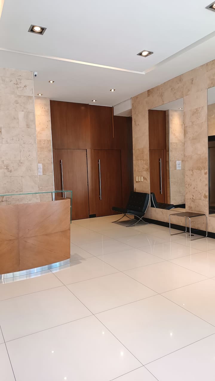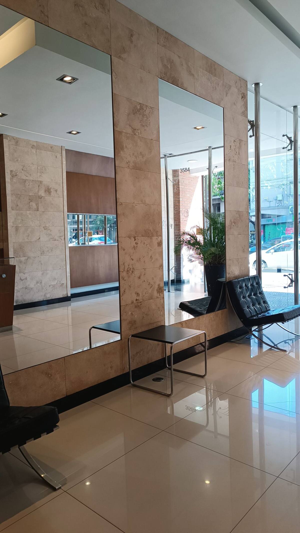 Studio apartment in Almagro with a double bed. Includes a full kitchen and a bathroom with a bathtub. The building has a swimming pool, a rooftop terrace, and free parking; each unit can be accessed by lift or stairs.