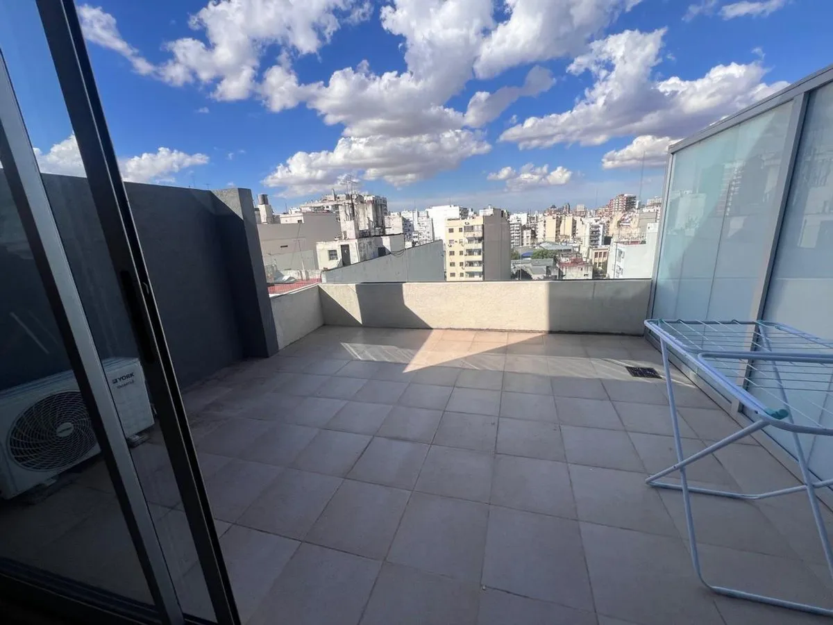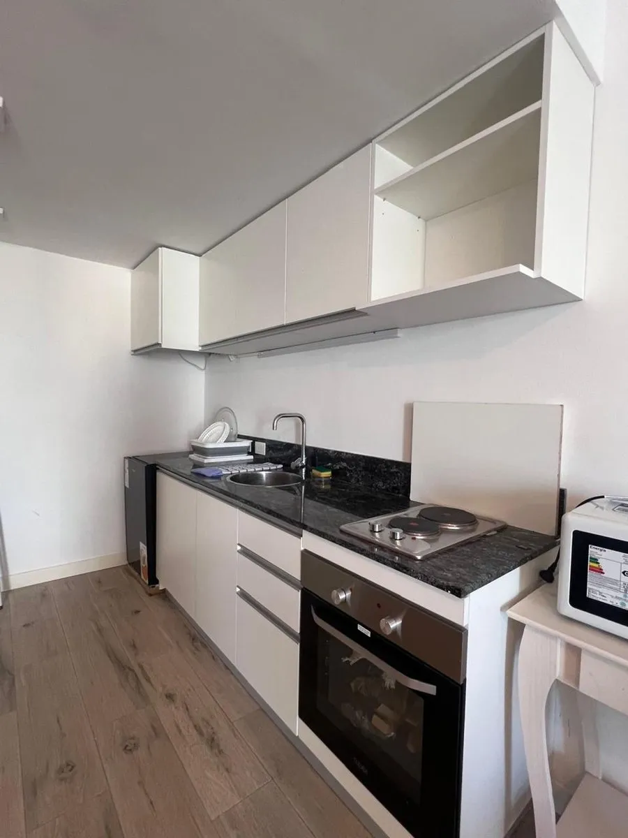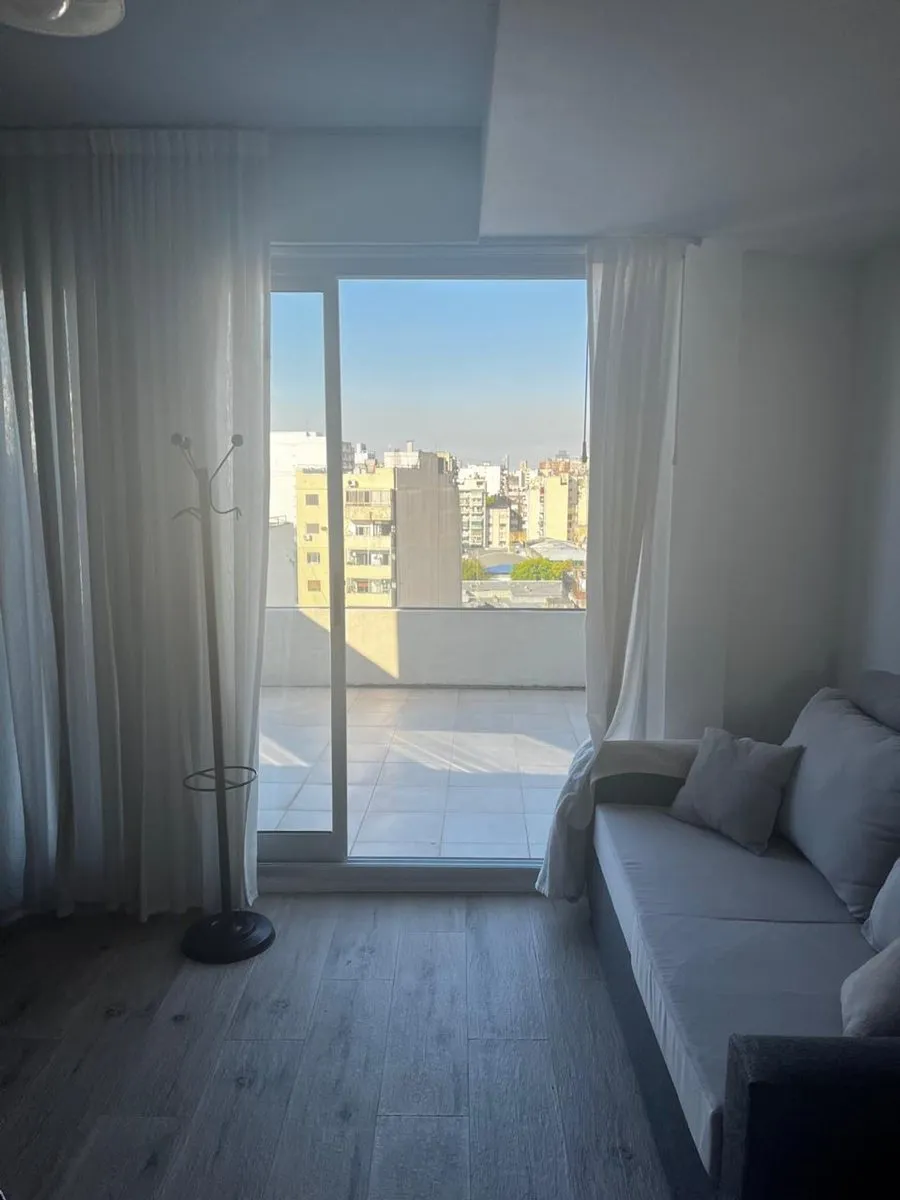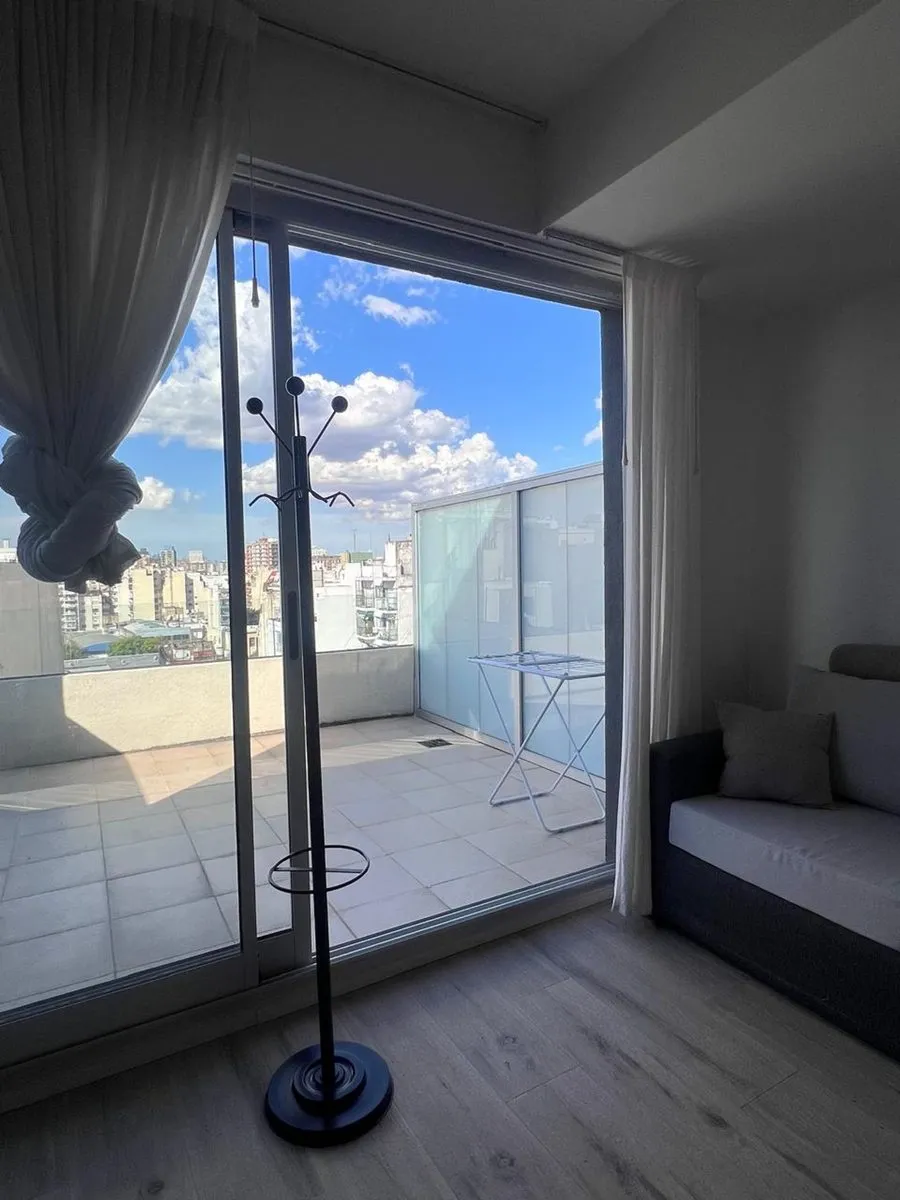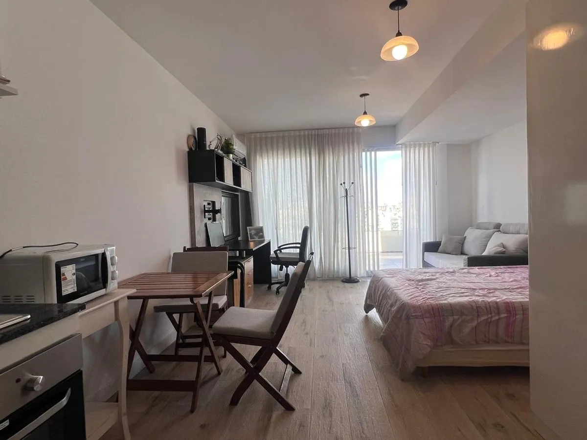 Furnished studio apartment on the 11th floor in Almagro, built in 2023. Total area is 42 m², with 28 m² covered and 14 m² semi-covered, east-facing, with a terrace-style balcony. Integrated kitchen comes equipped with a cooktop, microwave, electric hot-water heater and fridge, plus hot-cold air conditioning. Includes a double bed, wardrobe, sofa, desk with chair, a table with 2 chairs and additional furniture. The bathroom has natural ventilation. Building amenities include two elevators, securi