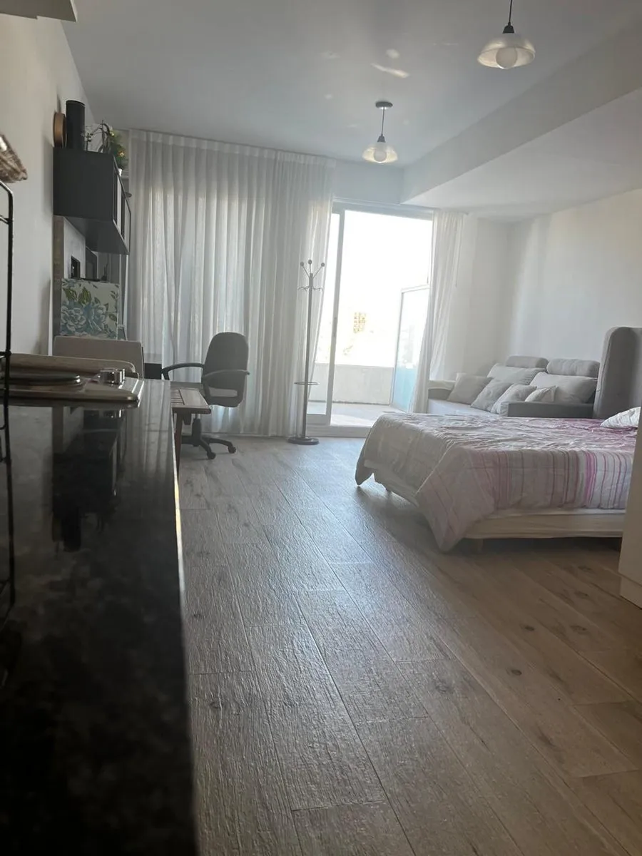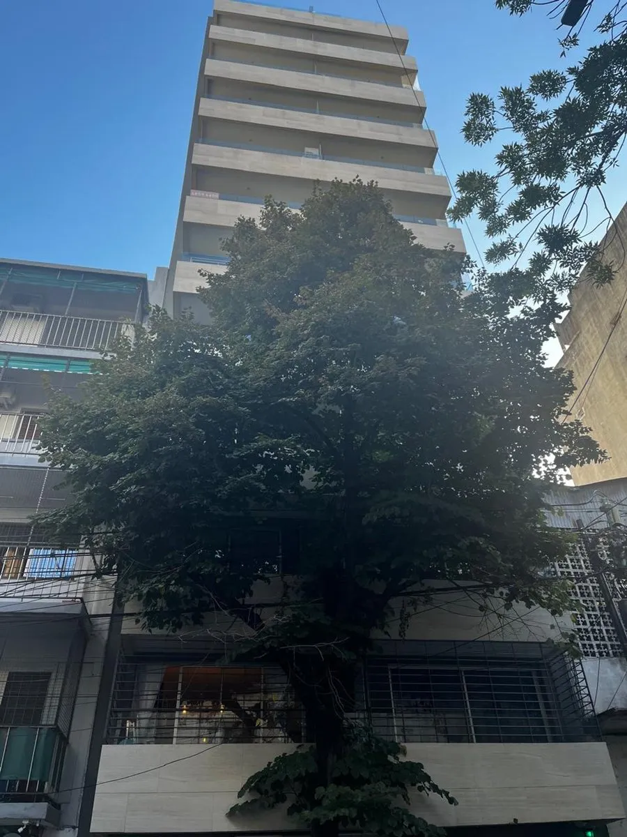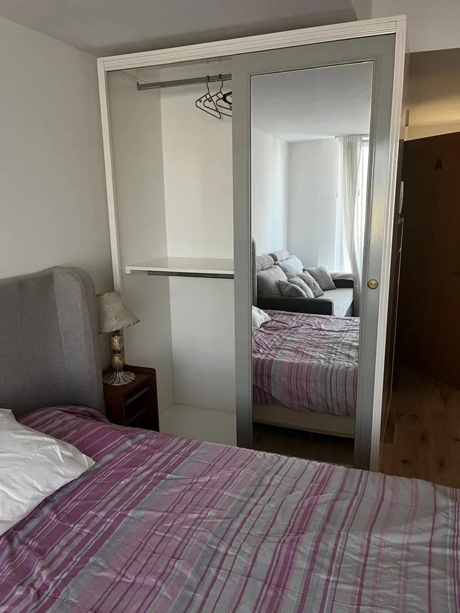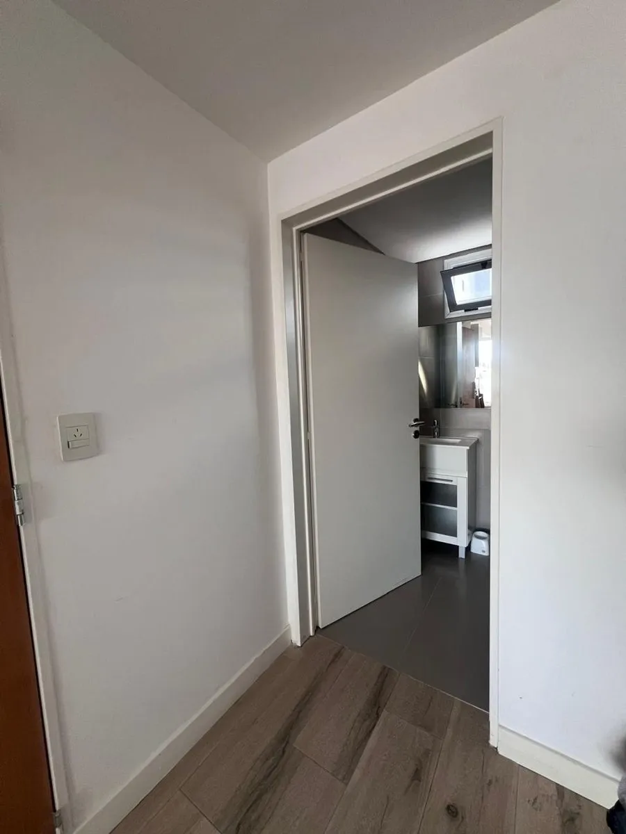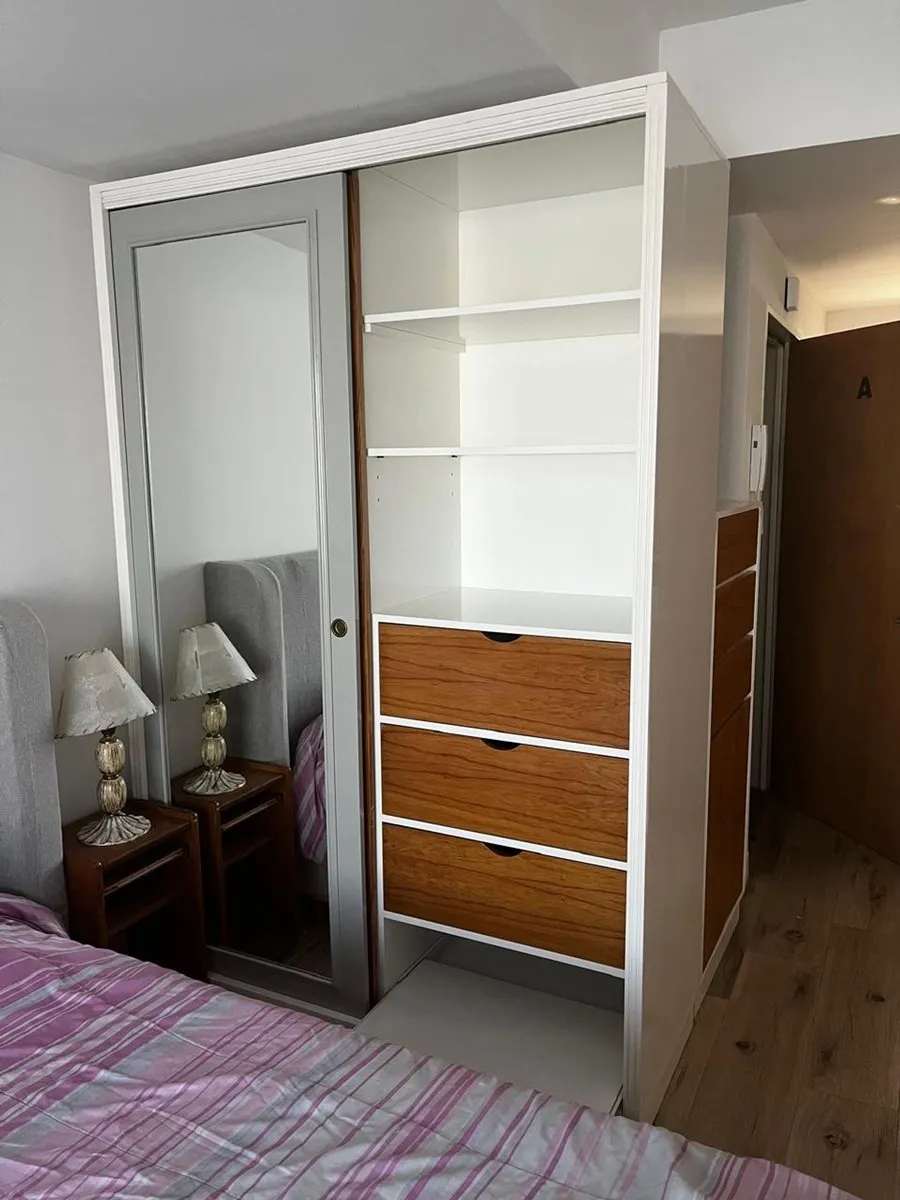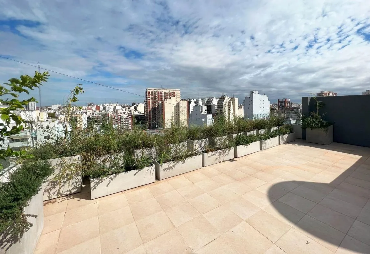 Furnished studio apartment on the 11th floor in Almagro, built in 2023. Total area is 42 m², with 28 m² covered and 14 m² semi-covered, east-facing, with a terrace-style balcony. Integrated kitchen comes equipped with a cooktop, microwave, electric hot-water heater and fridge, plus hot-cold air conditioning. Includes a double bed, wardrobe, sofa, desk with chair, a table with 2 chairs and additional furniture. The bathroom has natural ventilation. Building amenities include two elevators, securi