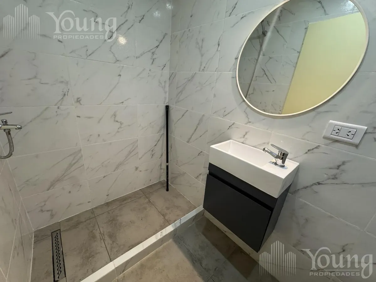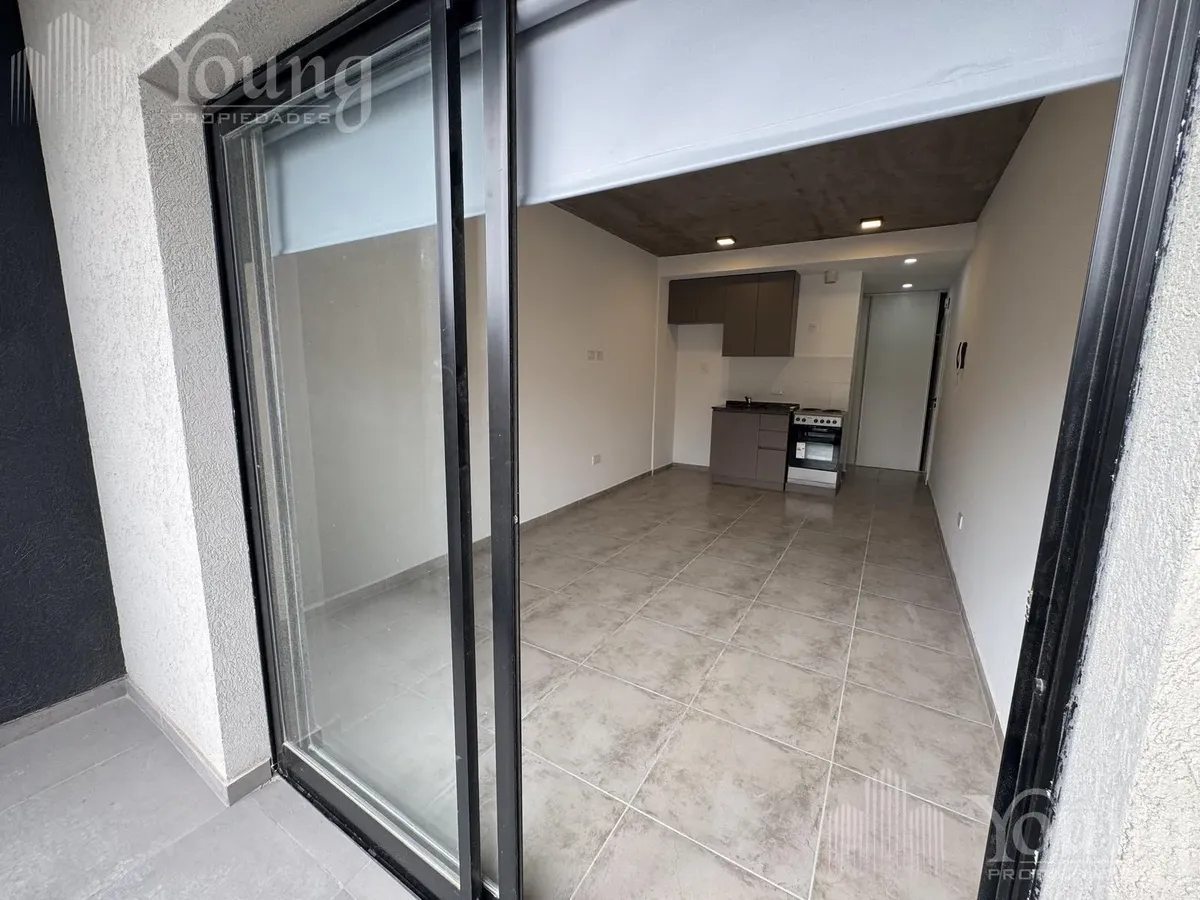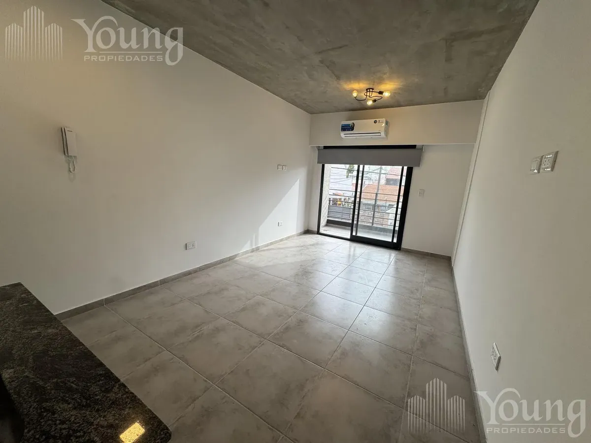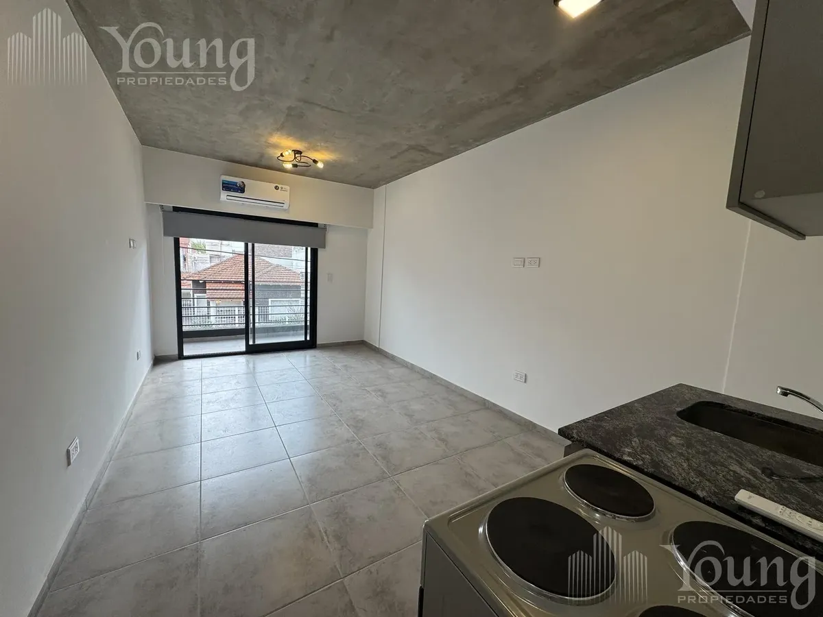 Modern studio apartment street-facing in Wilde, with a 4 m² balcony. Integrated kitchen with lower cabinets and wall units, plus a full bathroom. Fitted aluminium joinery with laminated glass, full built-in wardrobe, and split air conditioning (cold/heat). Includes an individual space for a washing machine and polished porcelain tile floors.