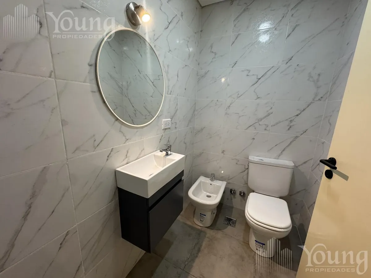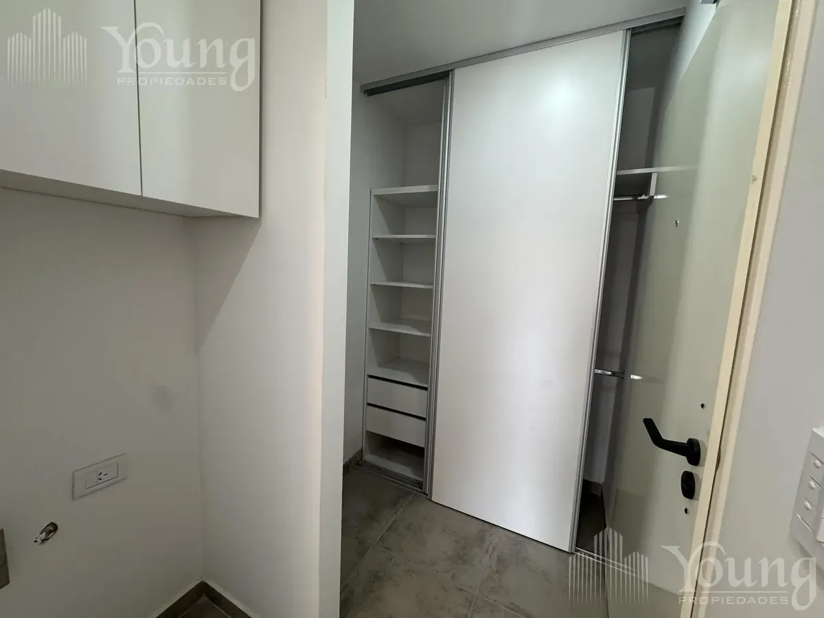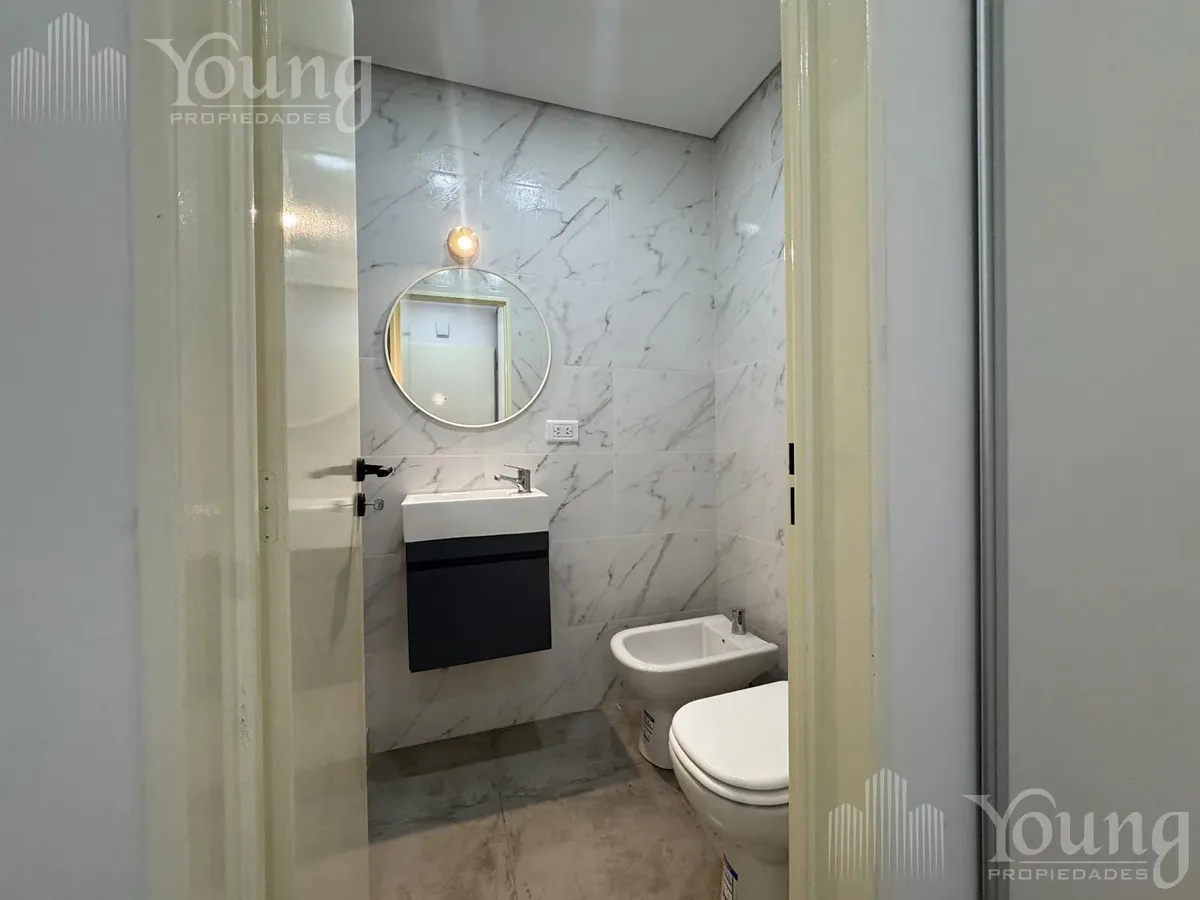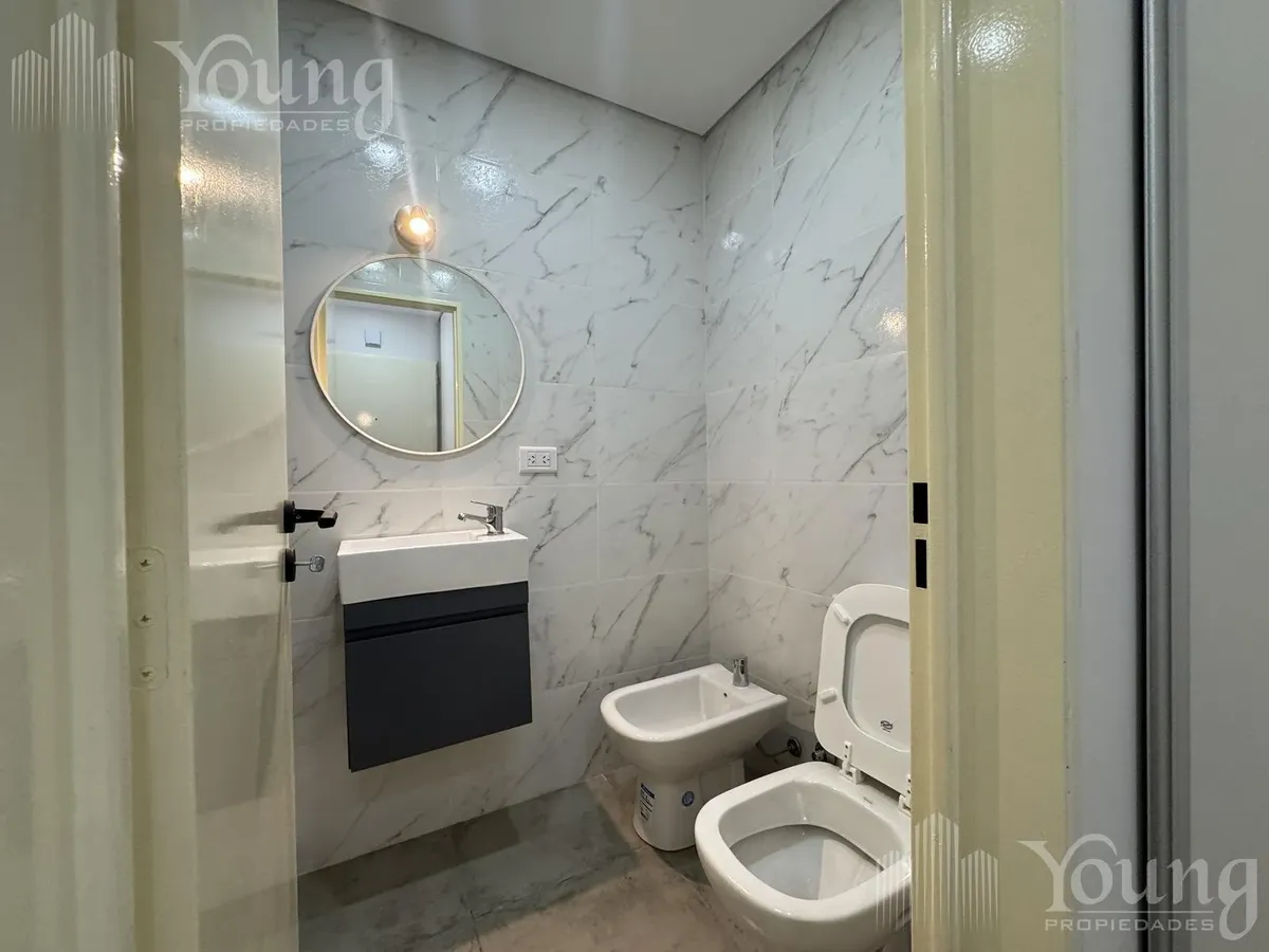 Modern studio apartment street-facing in Wilde, with a 4 m² balcony. Integrated kitchen with lower cabinets and wall units, plus a full bathroom. Fitted aluminium joinery with laminated glass, full built-in wardrobe, and split air conditioning (cold/heat). Includes an individual space for a washing machine and polished porcelain tile floors.