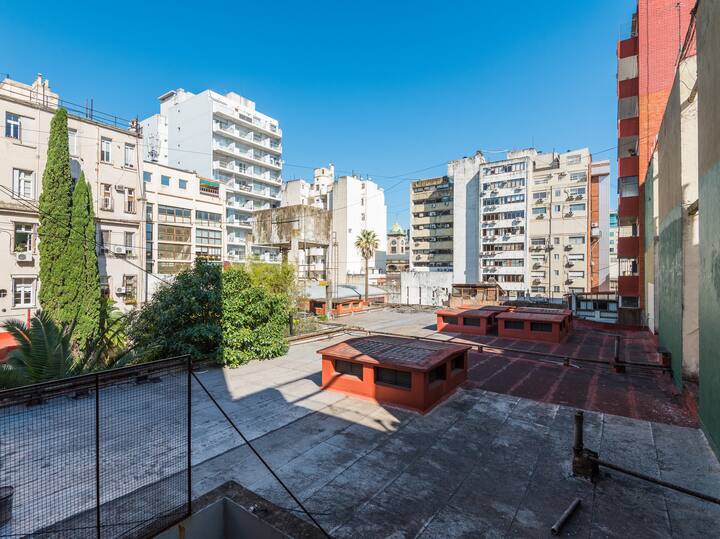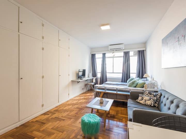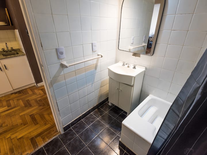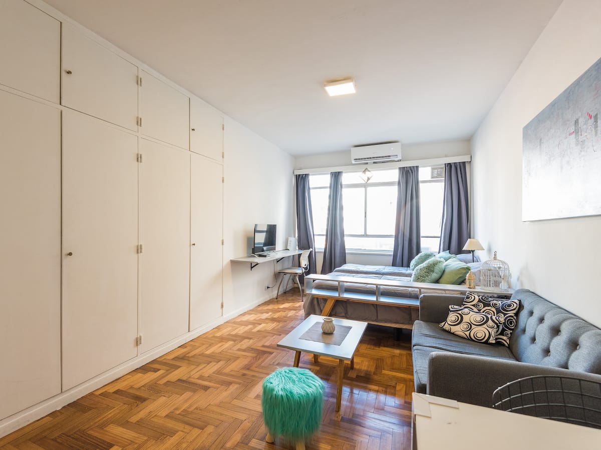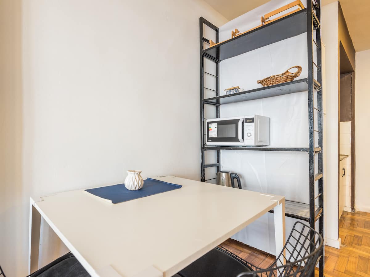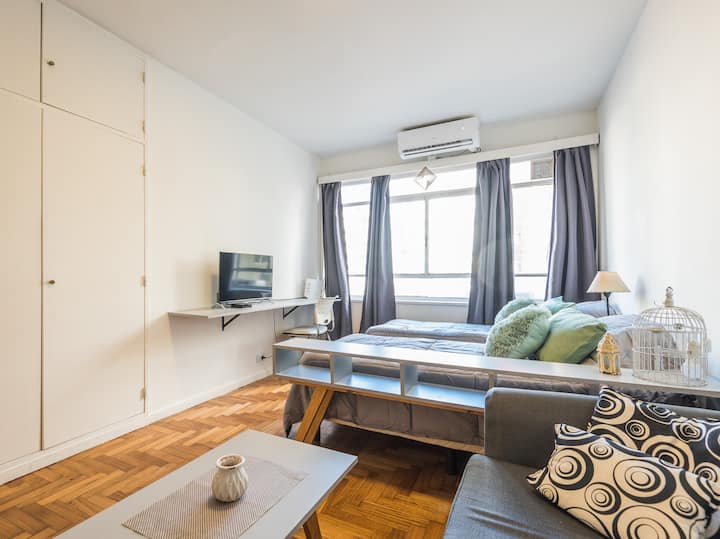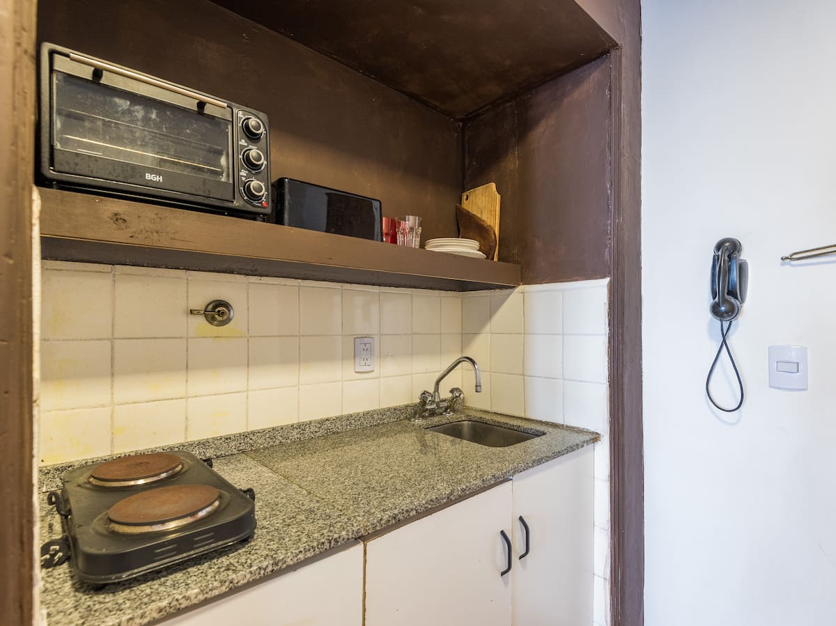 Studio apartment with air conditioning hot-cold and a kitchenette. The unit includes a refrigerator with freezer, microwave, small electric oven, electric cooker, toaster, electric kettle, coffeemaker, and a shower. Guests have access to Wi-Fi, cable TV, a smart TV, and linens and towels, with an elevator and stairs in the building.