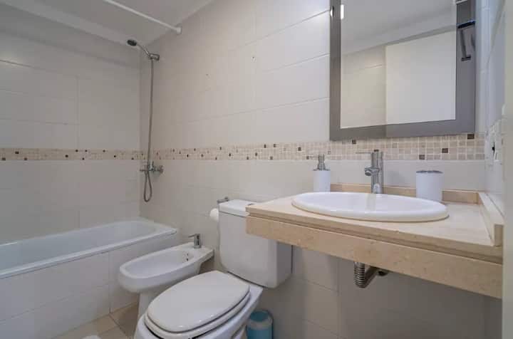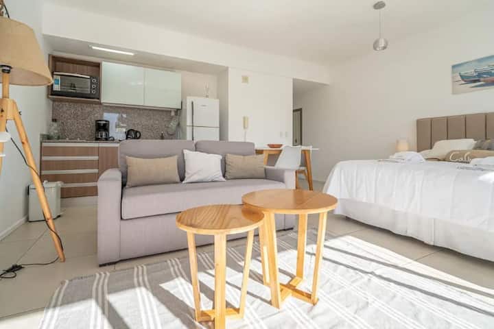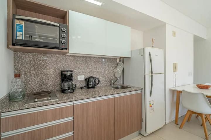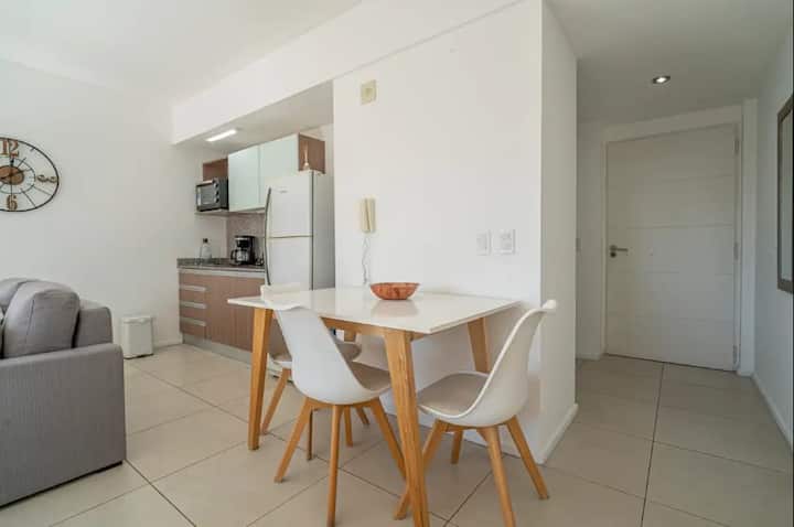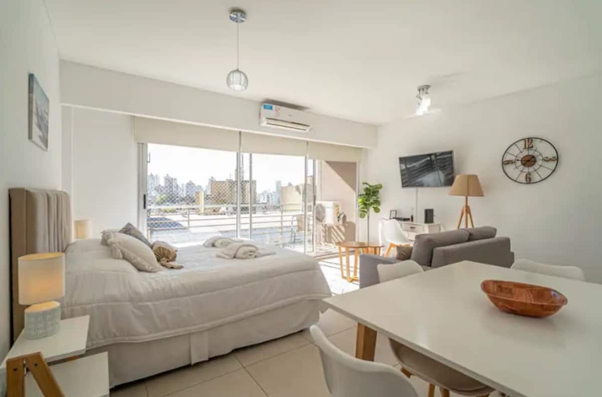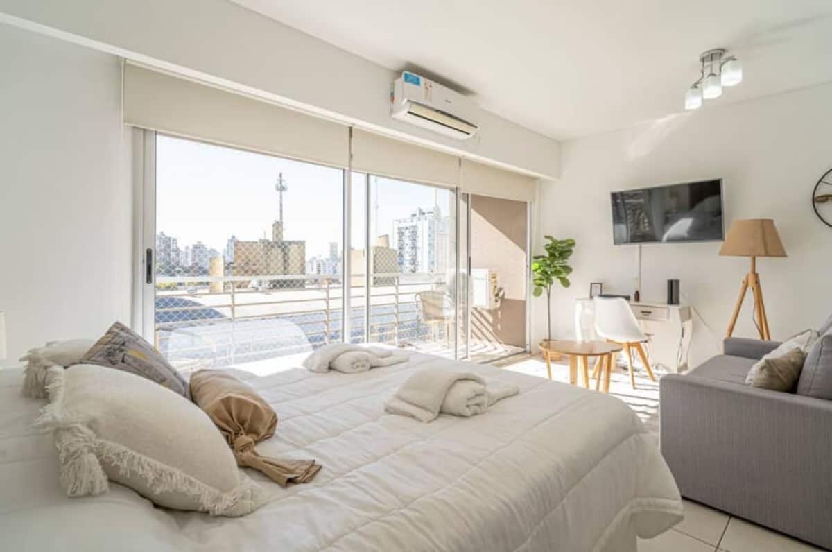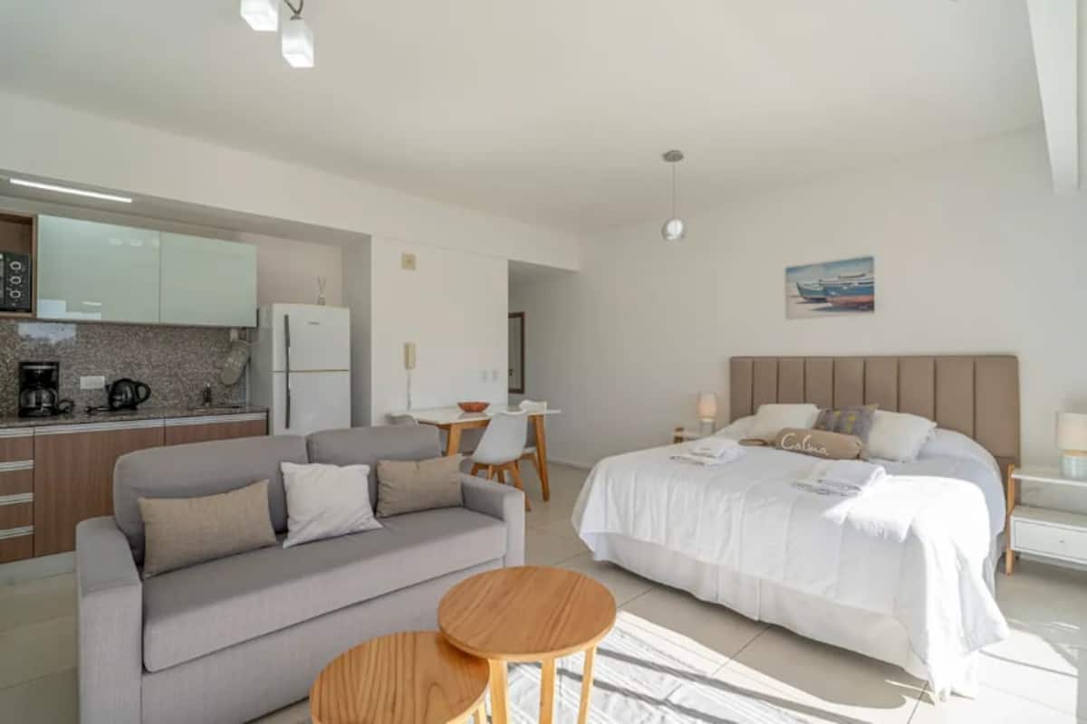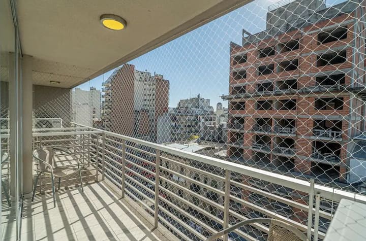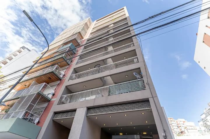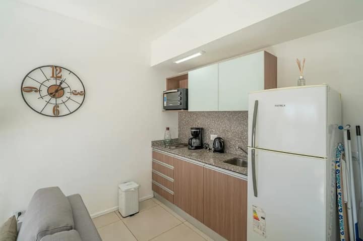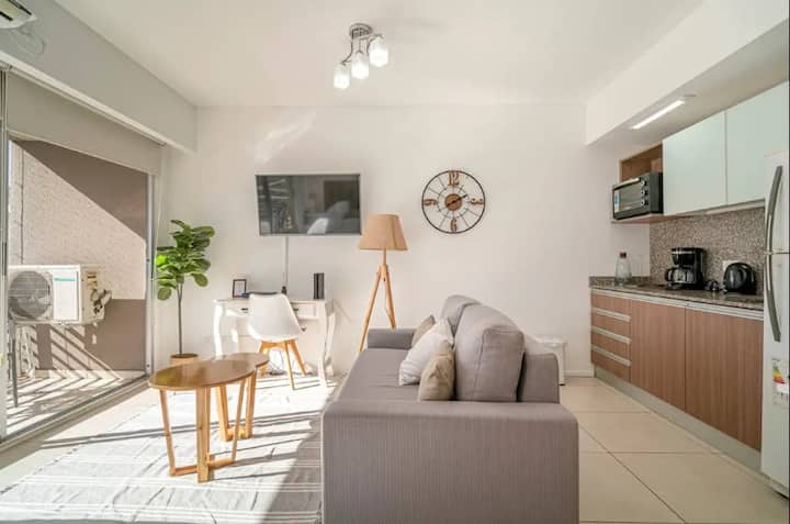 Studio apartment in Almagro with full kitchen, bathroom, and a balcony. The unit includes a double bed and a sofa bed. The building and the apartment are accessed with a set of keys; quiet hours are from 10 p.m. to 8 a.m. on weekdays and from 00:00 to 10:00 a.m. on weekends, and parties, smoking inside, and unauthorised visitors are not allowed.