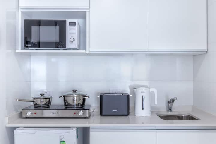 Studio apartment on Av. Corrientes in Balvanera, on the 12th floor with an exterior window and open view. It is equipped with air conditioning (hot/cold), a double bed and a Smart TV, and the kitchen includes a microwave, electric stove, electric kettle, toaster and fridge. The bathroom has a bathtub. The building has 24-hour security and paid parking available on site; self check-in is used for entry. The listing states that bed linen, towels, hair dryer, hair straightener and a clothes iron ar
