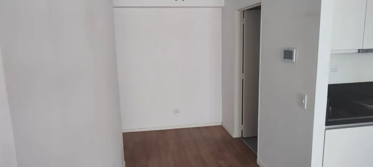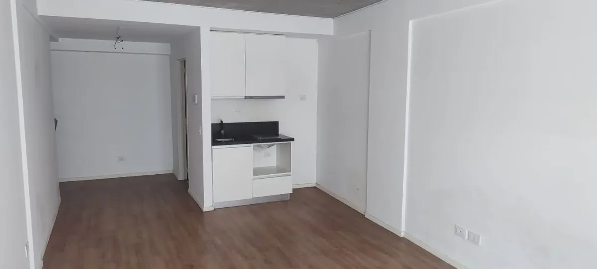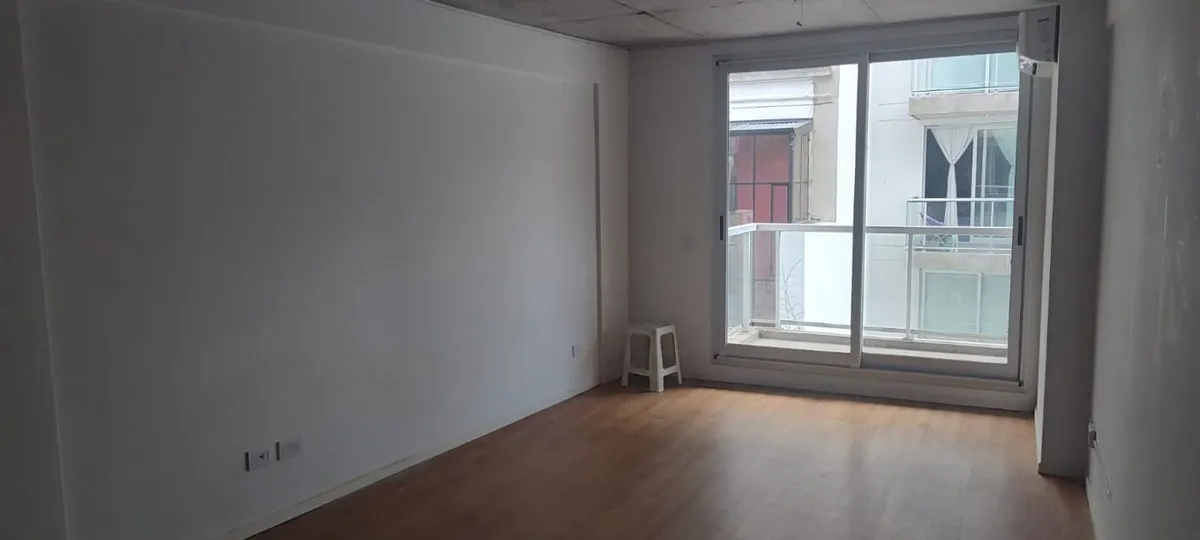 Studio apartment with a balcony facing the street in Barracas. The unit has an integrated kitchen, a full bathroom, and a split hot-and-cold air-conditioning system. The building has a laundry.