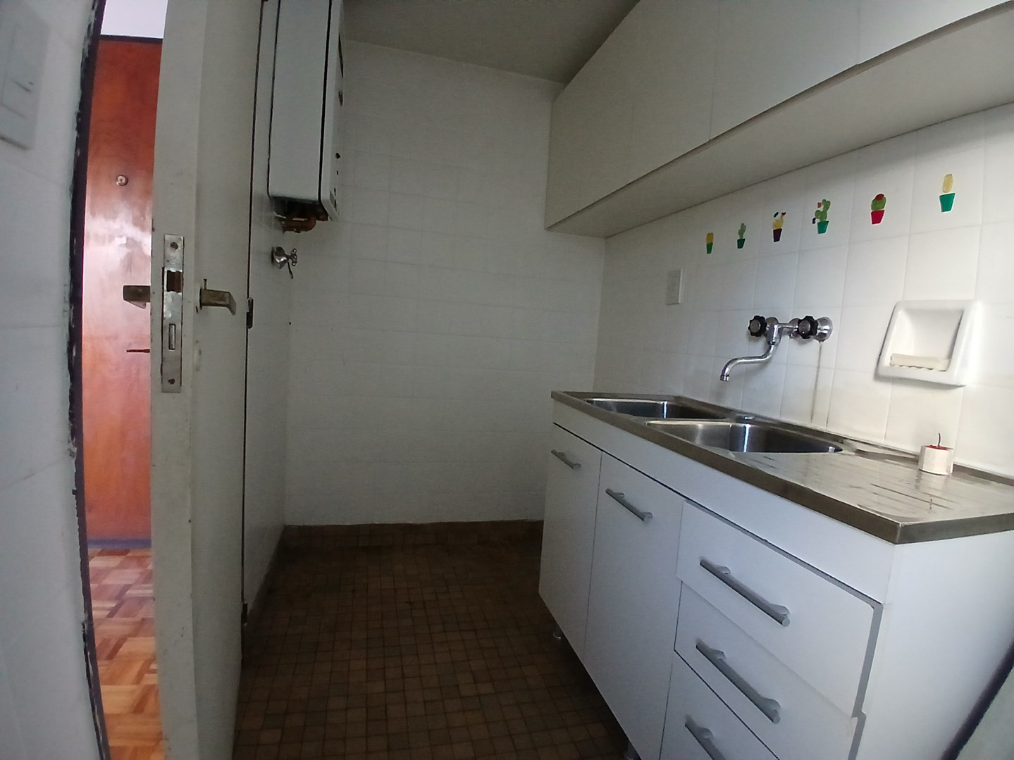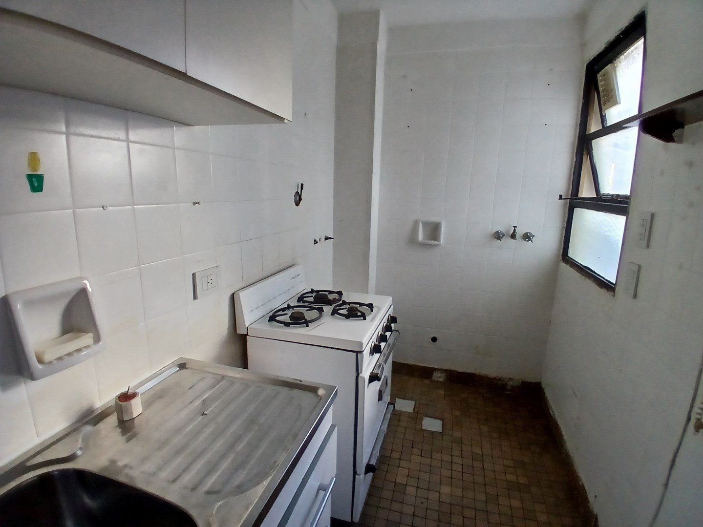 Studio apartment with 27 m² total, arranged in an L shape to separate the living and sleeping areas. Independent kitchen with natural ventilation and storage space, plus a dedicated laundry area. Full bathroom; all rooms face the exterior and ventilate to the outside. Building fees and the rental price are not specified in the listing.