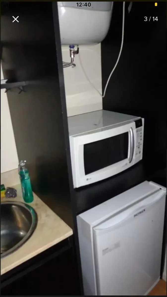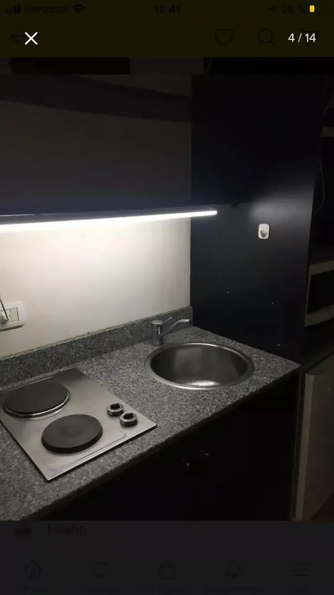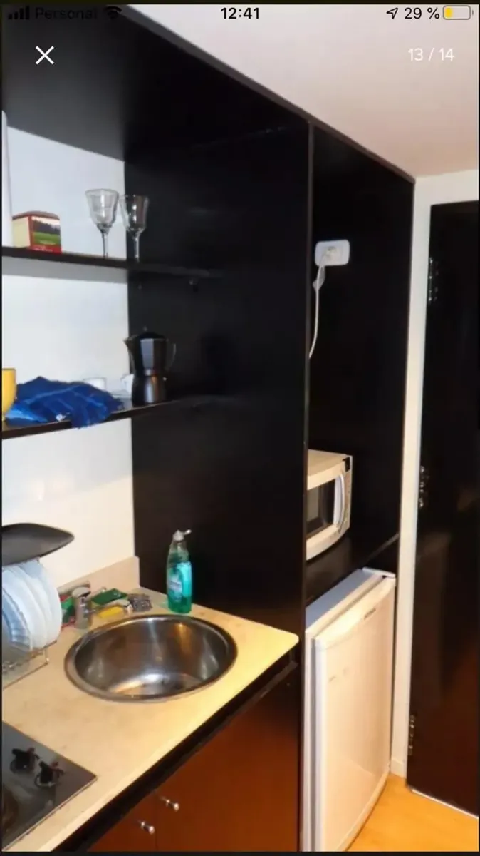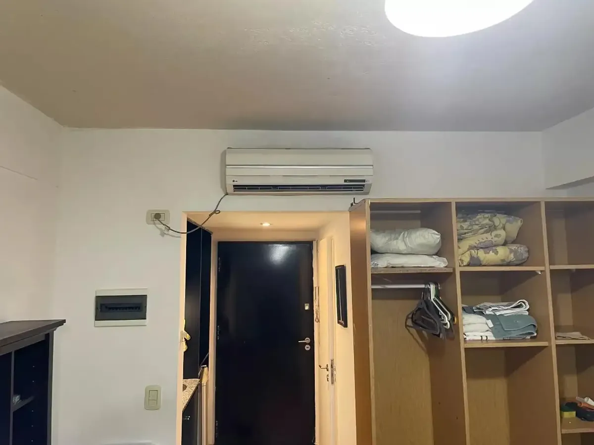 Front-facing studio apartment in Belgrano, furnished and equipped. The unit includes a living-dining area with 2 single beds with box-spring mattresses, built-in storage, an integrated kitchen with a small fridge and microwave, and a bathroom with a shower. Air conditioning (hot/cold), heating and a TV are available, while there is no washing machine connection and no laundry in the building. The building has a communal room (SUM). The monthly rent includes building fees, ABL and AYSA; the tenan