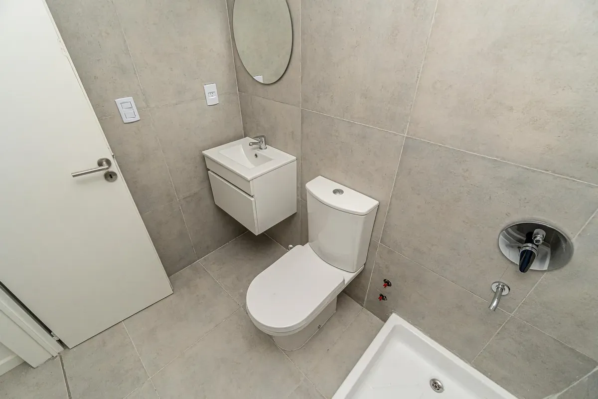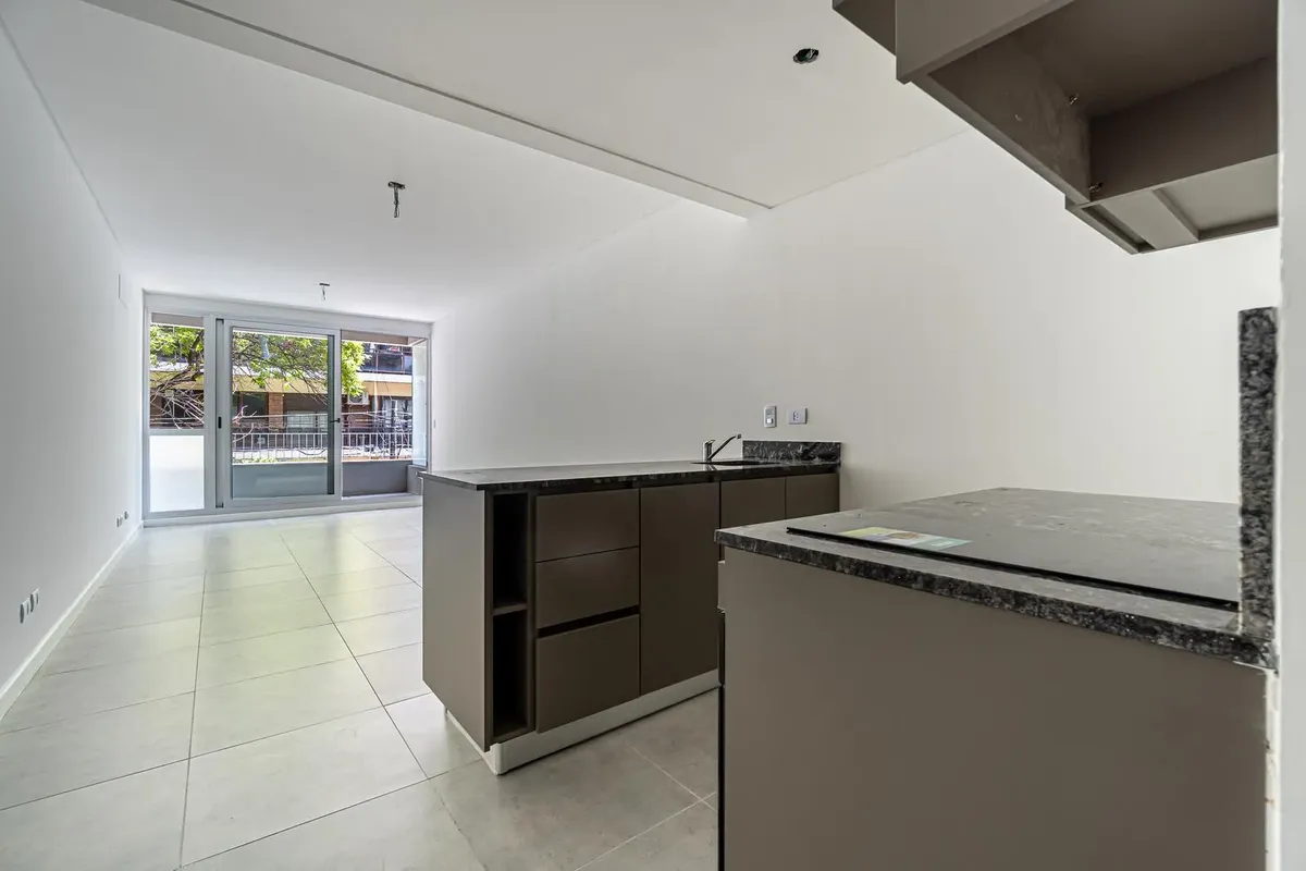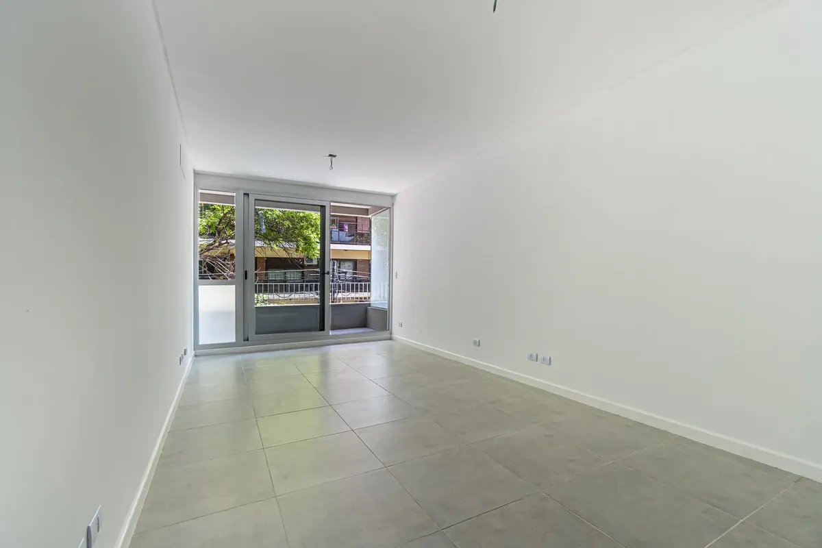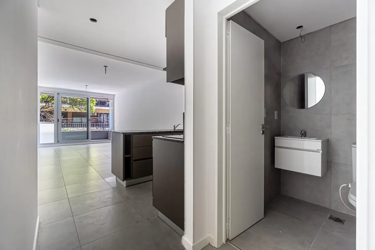 Studio apartment facing the street with access to a balcony. Semi-integrated kitchenette and a full bathroom. Building amenities include a communal room/residents' coworking area, a flexible terrace with grills and a laundry area, plus accessibility for people with reduced mobility. Located on Montañeses between Av. Monroe and Blanco Encalada, near Av. del Libertador.