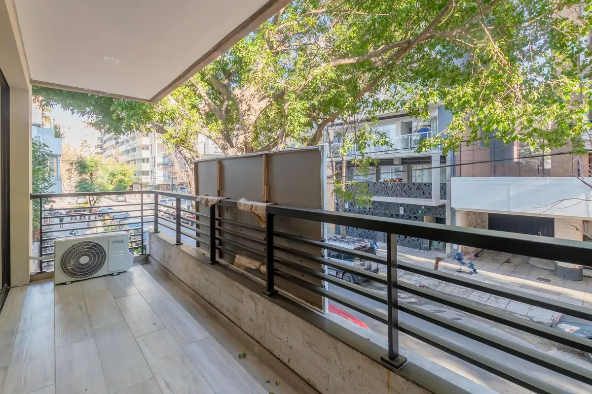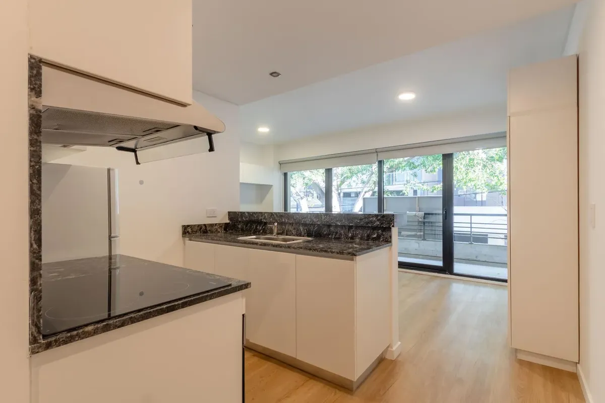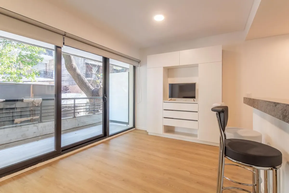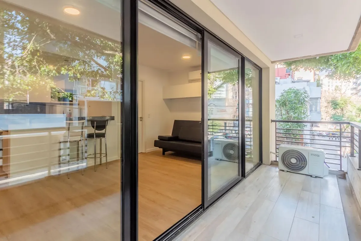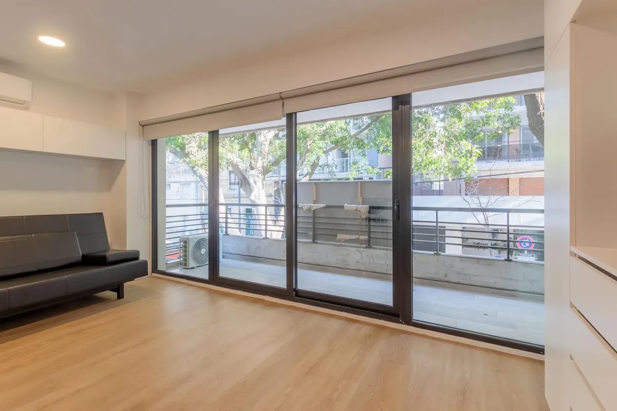 Studio apartment in Belgrano, brand new, on the 1st floor and street-facing with a large balcony. Integrated kitchen with breakfast bar, ceramic glass cooktop with 4 burners and electric oven, plus fridge and microwave. Full bathroom and hot/cold air conditioning; includes a futon/cama with storage furniture and the option to remove it to place a bed. The building has 9 floors with 3 units per floor and amenities including a communal SUM, laundry, bike storage, storage rooms (bauleras), patio, a