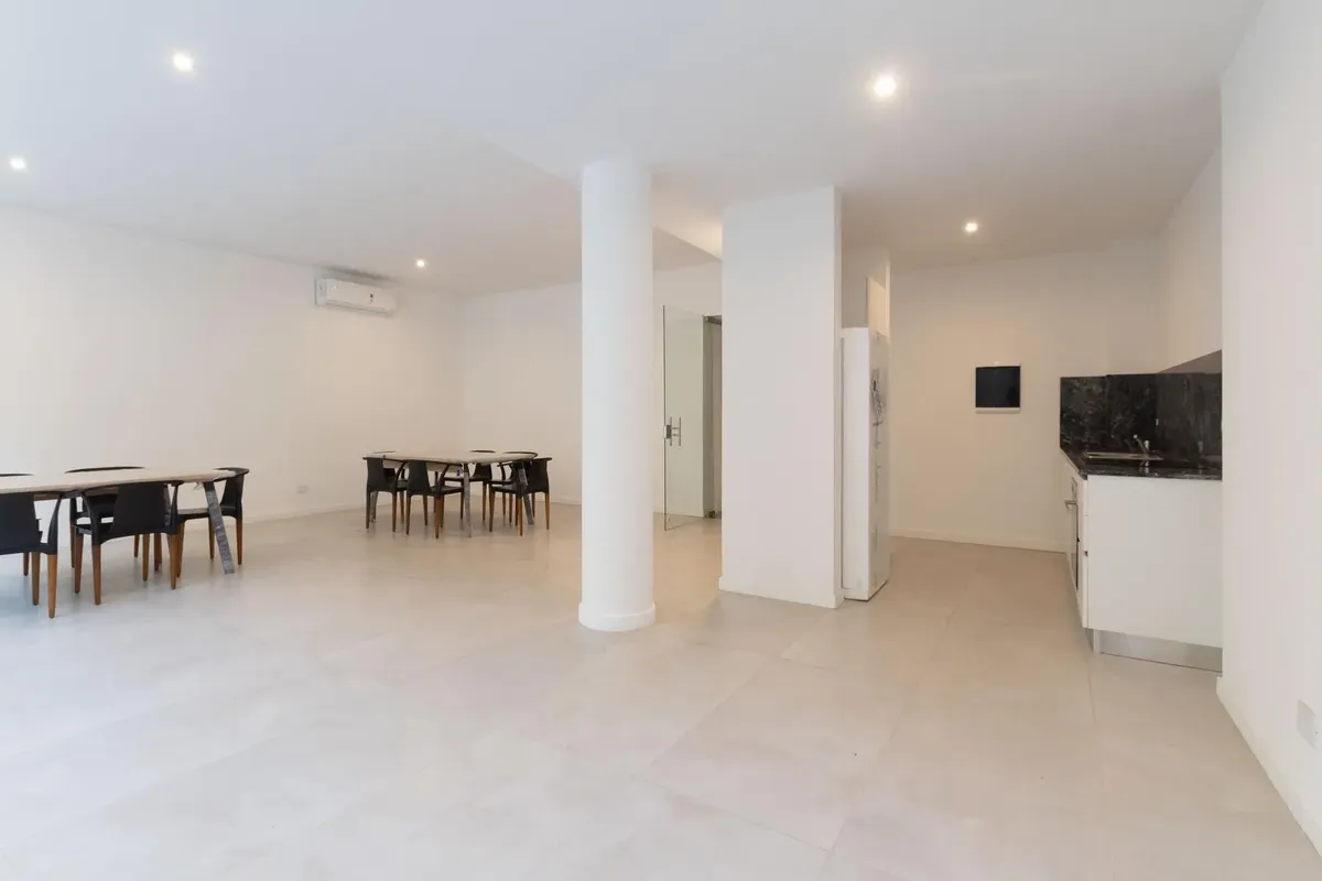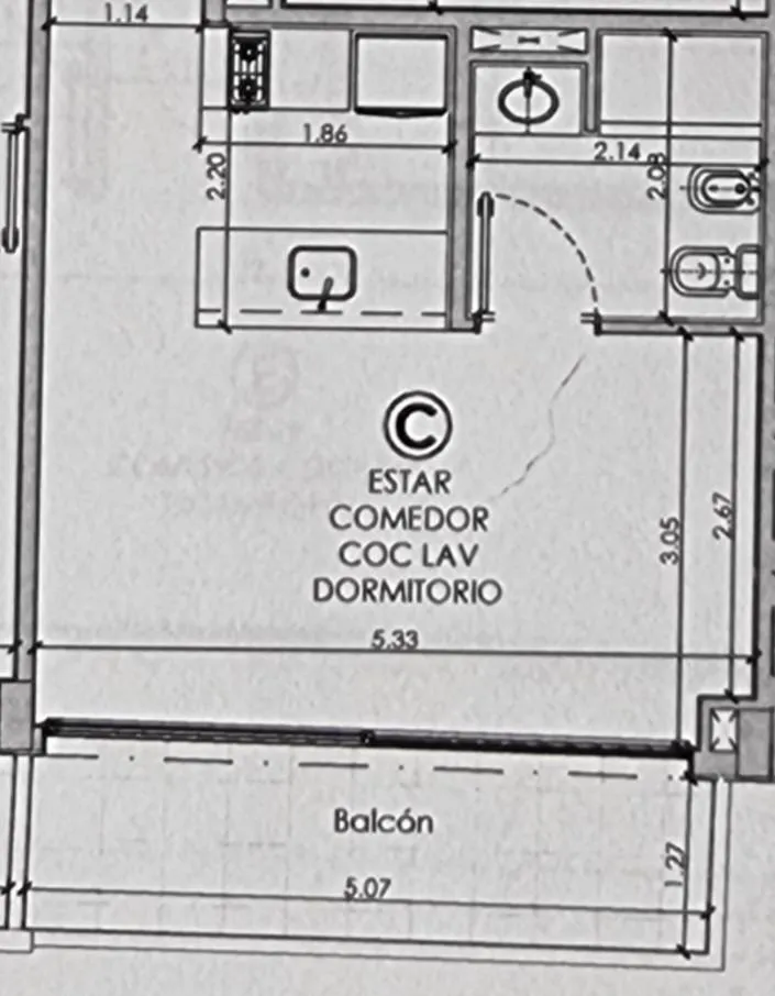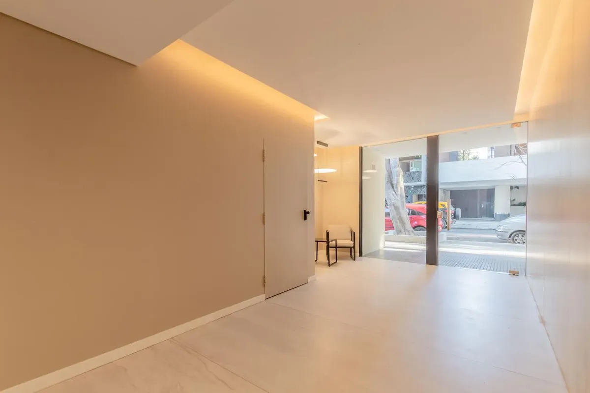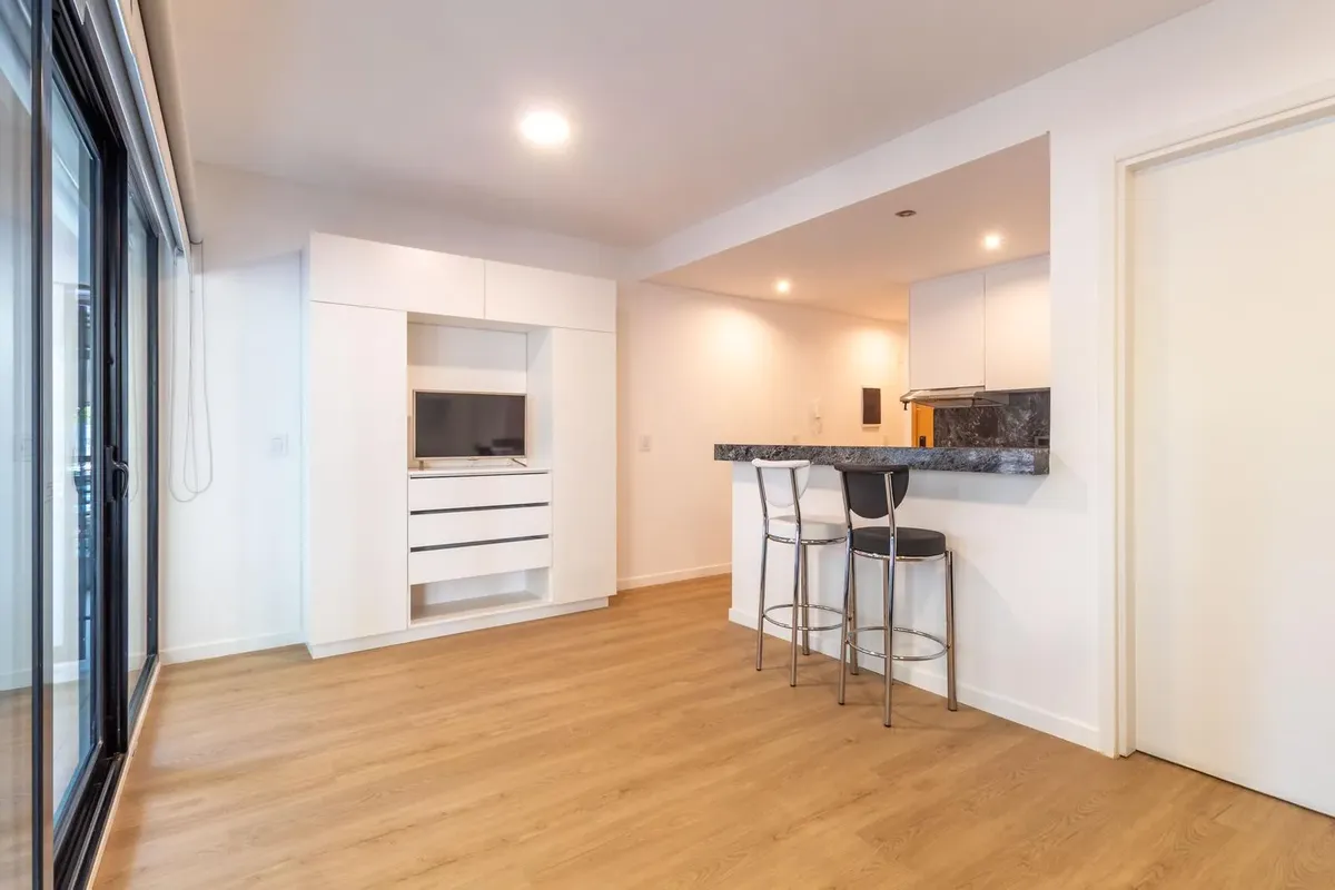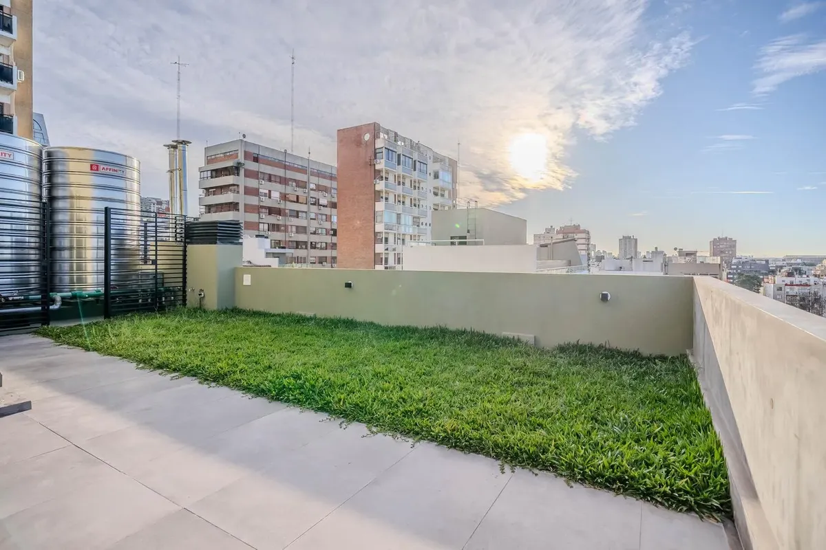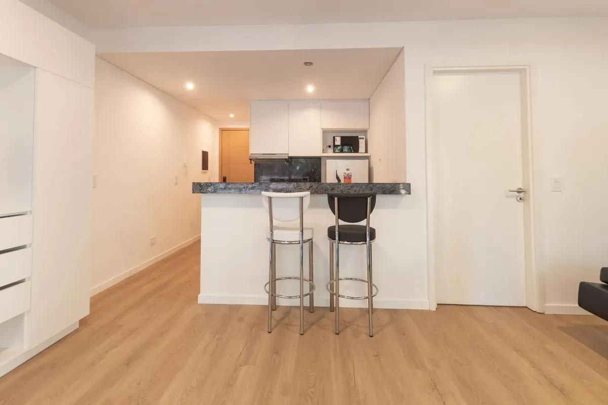 Studio apartment in Belgrano, brand new, on the 1st floor and street-facing with a large balcony. Integrated kitchen with breakfast bar, ceramic glass cooktop with 4 burners and electric oven, plus fridge and microwave. Full bathroom and hot/cold air conditioning; includes a futon/cama with storage furniture and the option to remove it to place a bed. The building has 9 floors with 3 units per floor and amenities including a communal SUM, laundry, bike storage, storage rooms (bauleras), patio, a