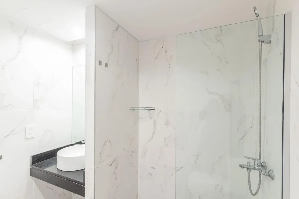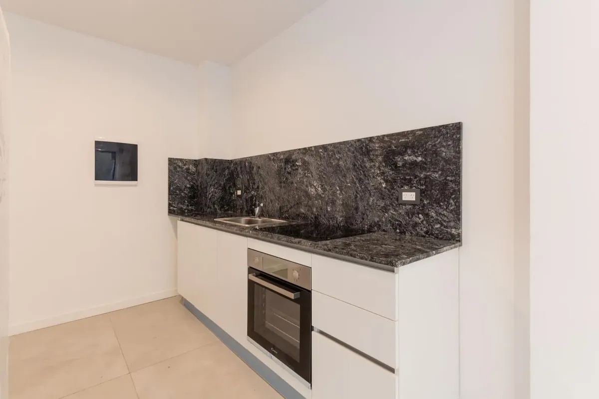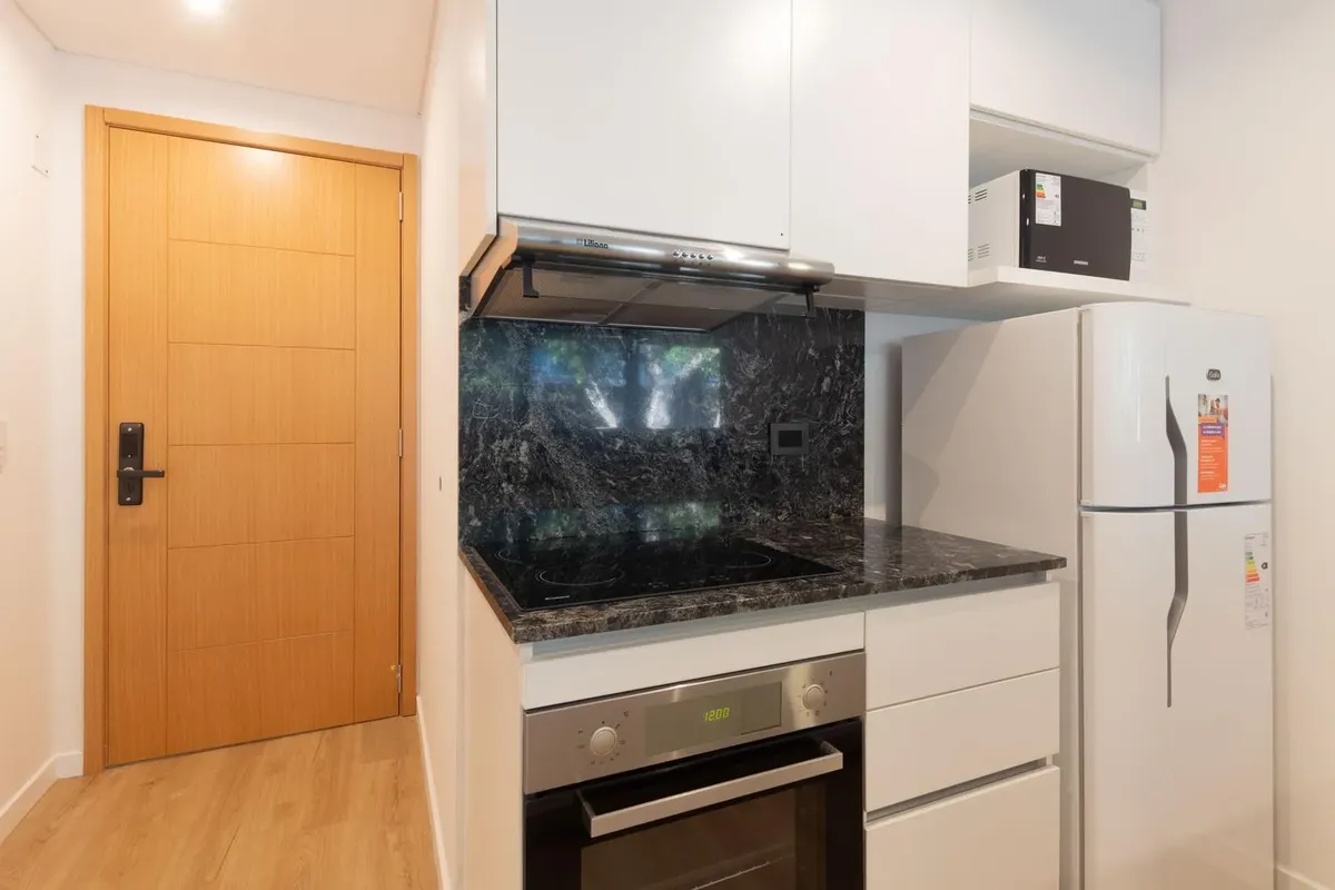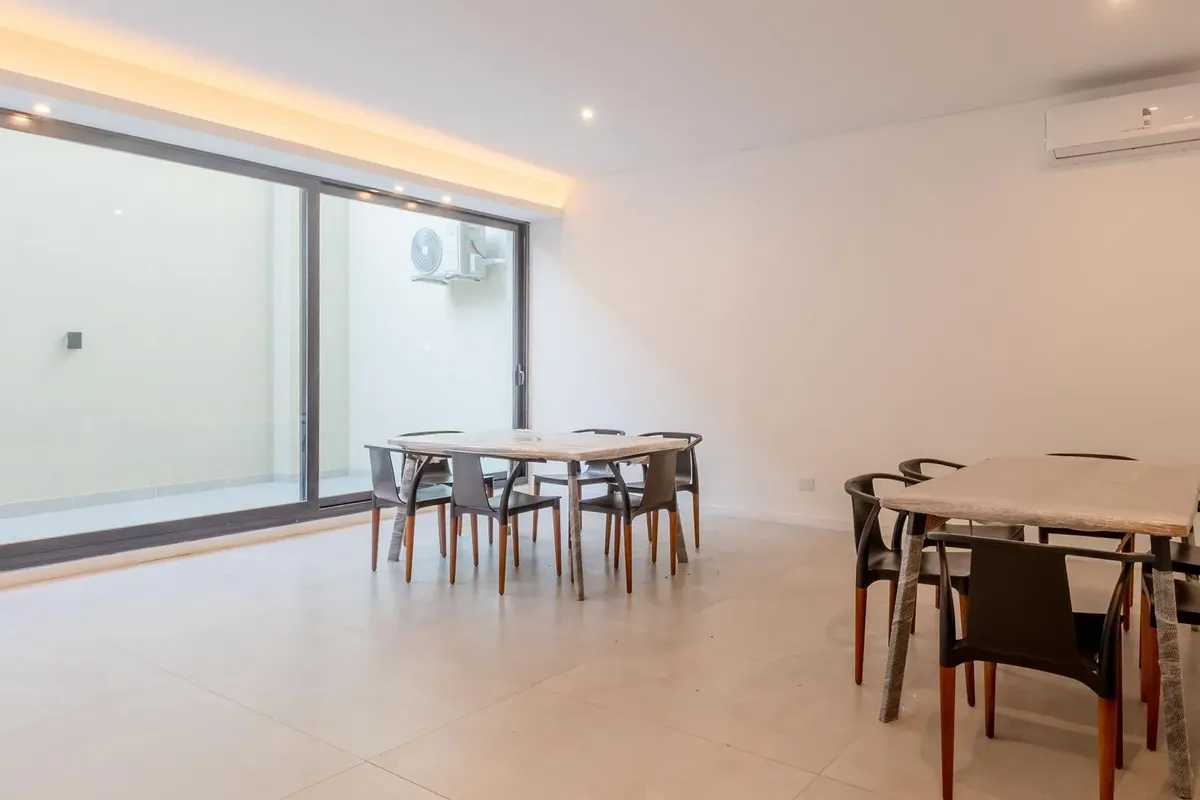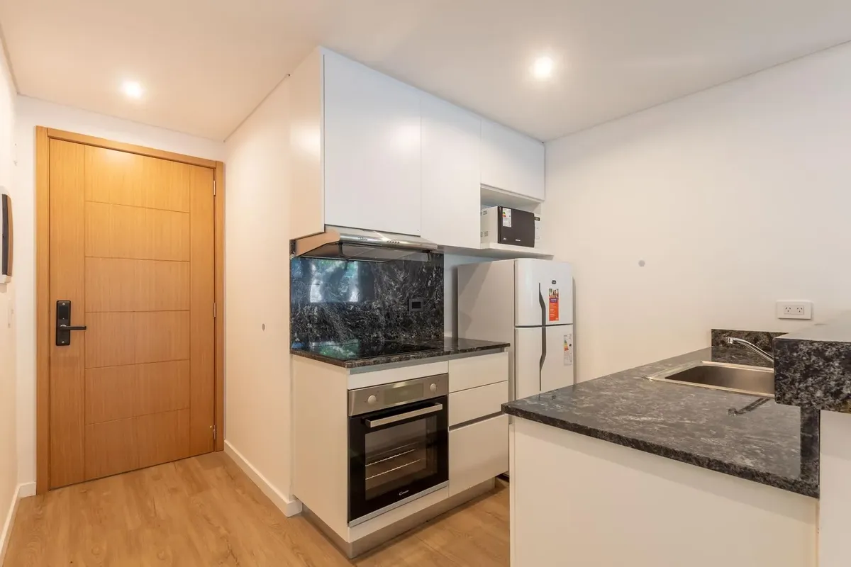 Studio apartment in Belgrano, brand new, on the 1st floor and street-facing with a large balcony. Integrated kitchen with breakfast bar, ceramic glass cooktop with 4 burners and electric oven, plus fridge and microwave. Full bathroom and hot/cold air conditioning; includes a futon/cama with storage furniture and the option to remove it to place a bed. The building has 9 floors with 3 units per floor and amenities including a communal SUM, laundry, bike storage, storage rooms (bauleras), patio, a