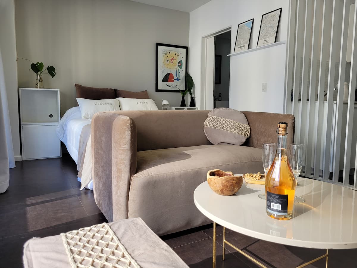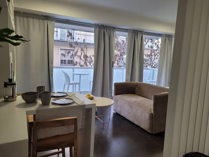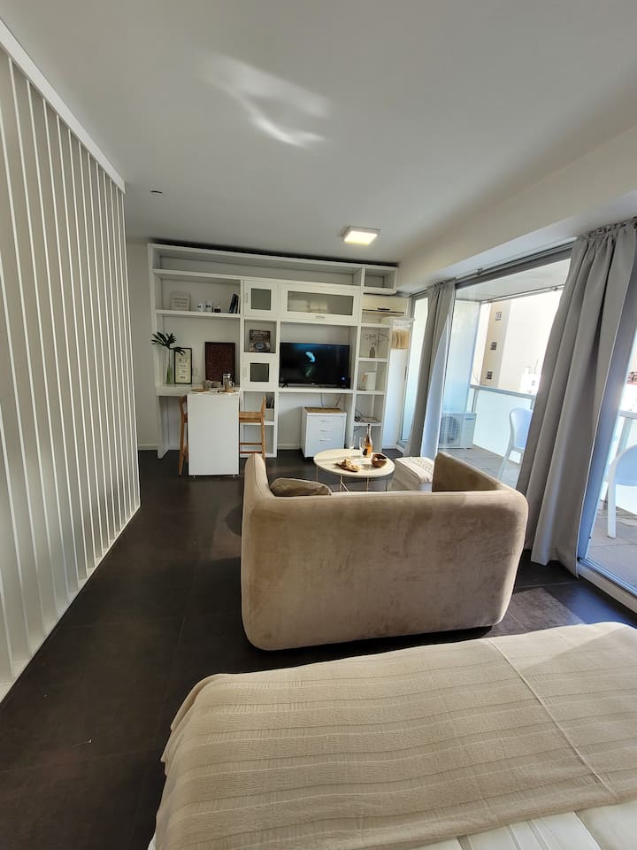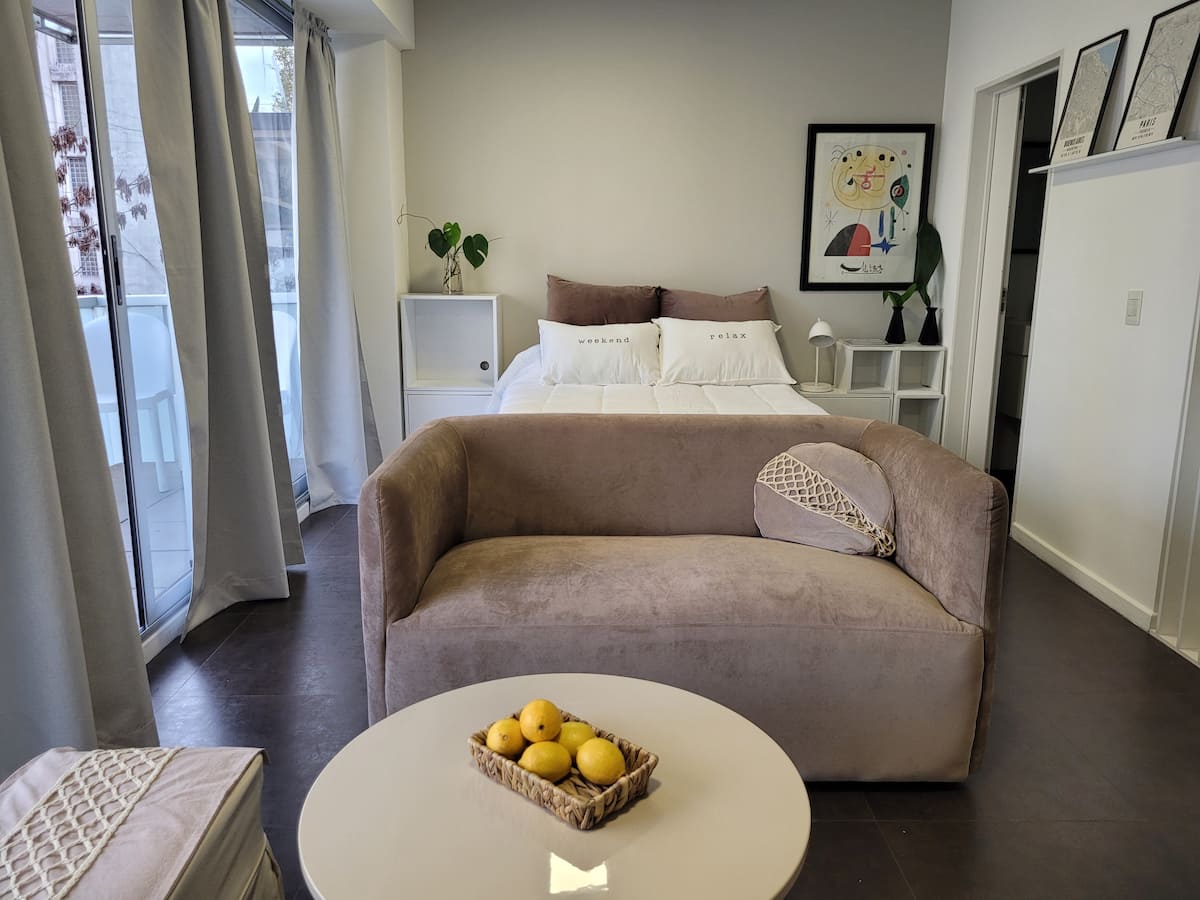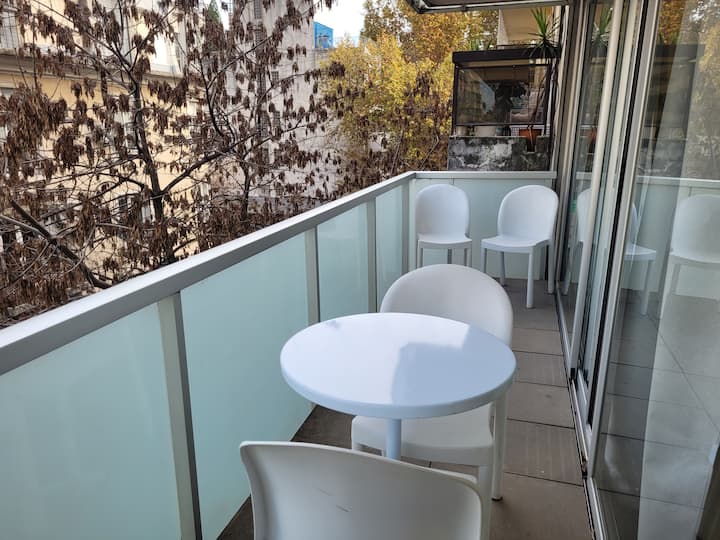 Studio apartment in Belgrano with a large street-facing balcony. The unit is equipped with a double bed, armchair, TV, internet, a bathroom with a bathtub, and air conditioning. The kitchen is fully stocked for meal preparation.