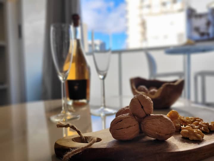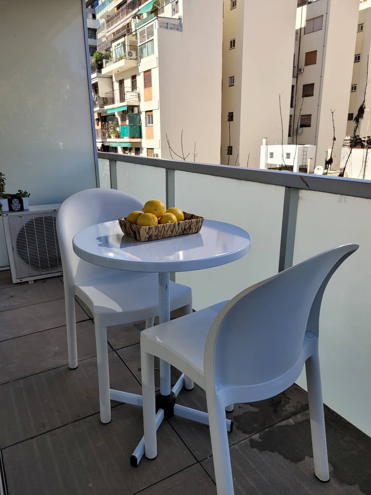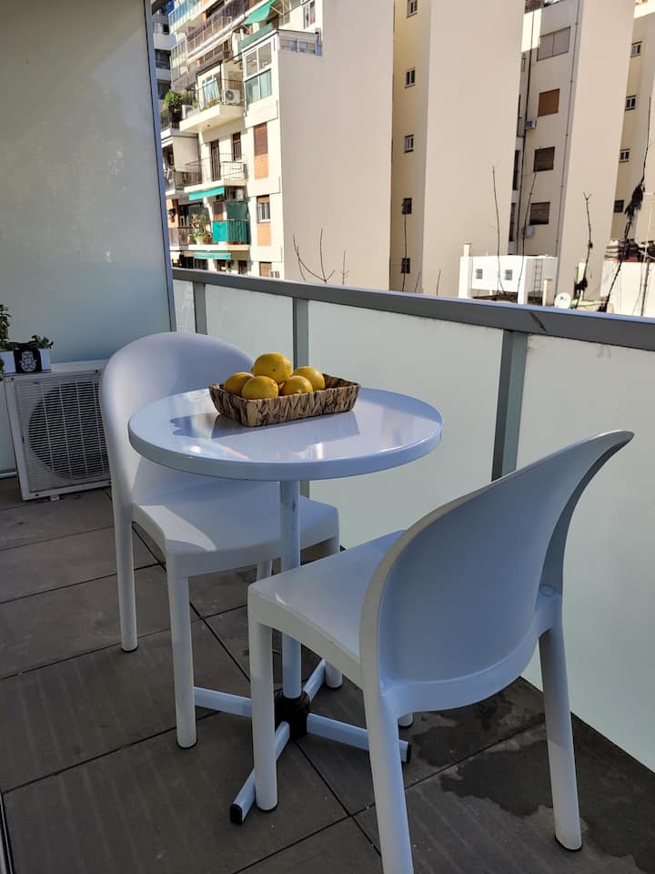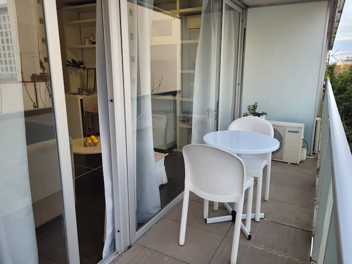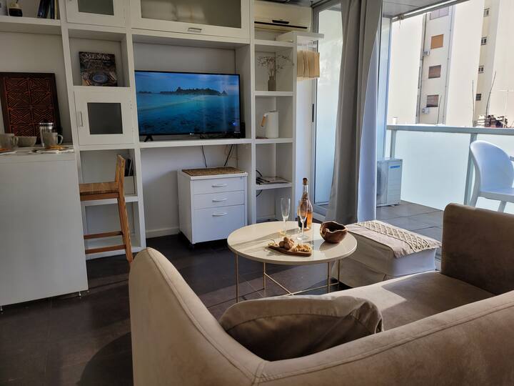Studio apartment in Belgrano with a large street-facing balcony. The unit is equipped with a double bed, armchair, TV, internet, a bathroom with a bathtub, and air conditioning. The kitchen is fully stocked for meal preparation.