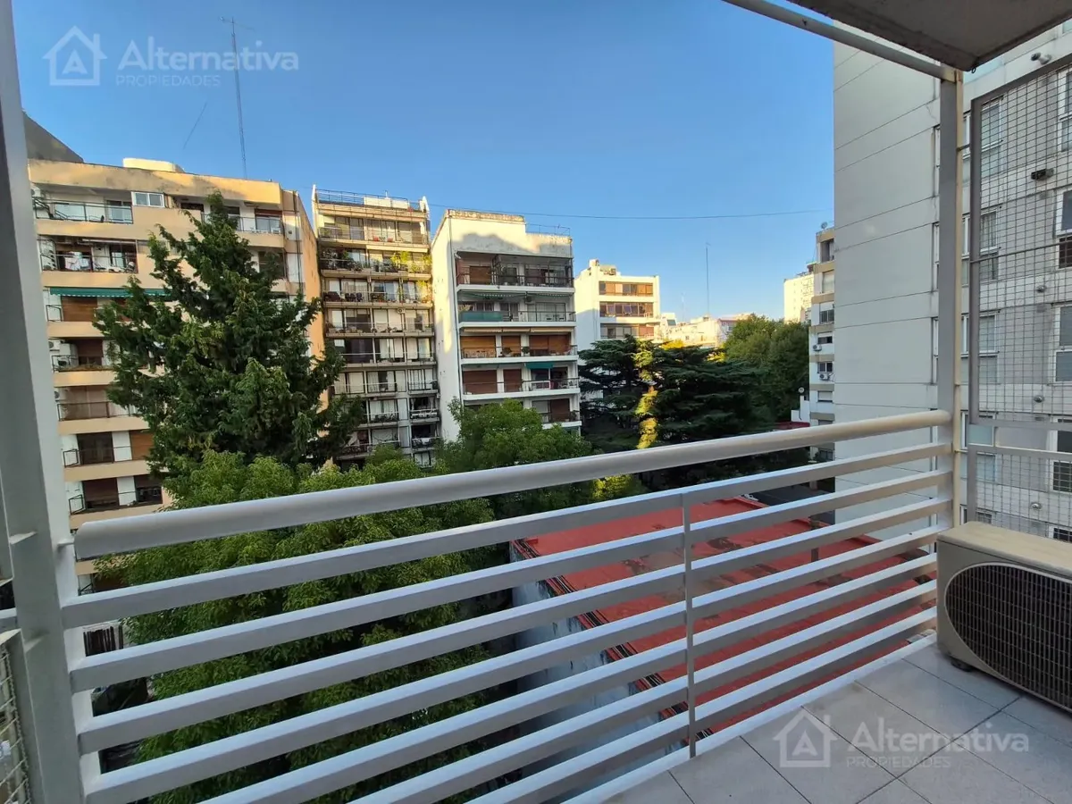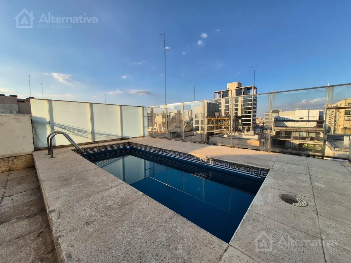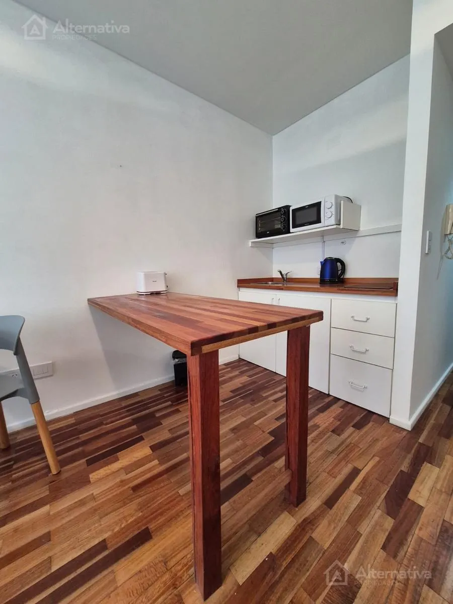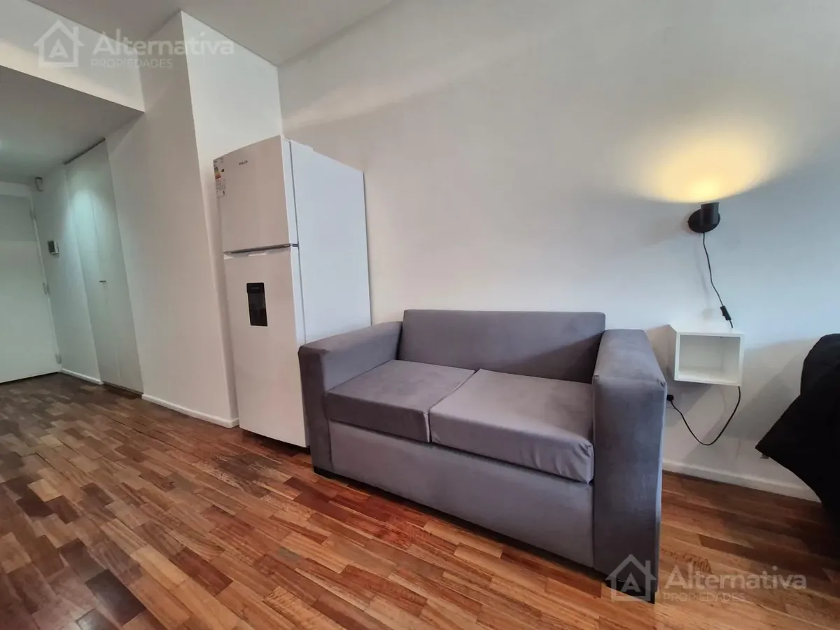 Studio apartment in Belgrano with integrated, fully furnished layout. Includes a kitchenette with appliances and tableware, a full bathroom, air conditioning (hot/cold), and a balcony, plus a closet for storage. The building has a laundry and a pool; the rent package includes building fees, utilities, and internet.