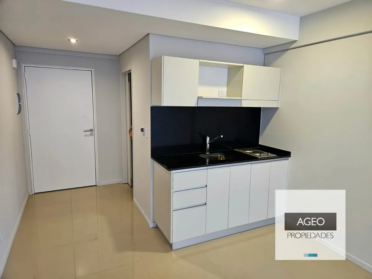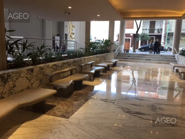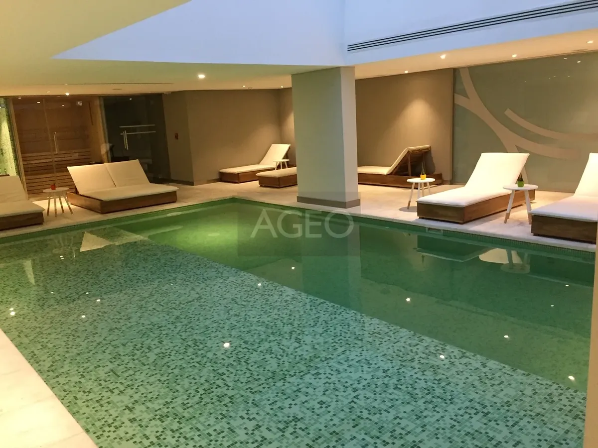 Studio apartment for professional use in the Liberateur building, with a living-dining area, balcony, integrated kitchen and full bathroom. The building has a covered heated pool, spa with Scottish shower, sauna and Turkish bath, plus a gym, communal room (SUM), and a micro-cinema, with 24-hour security.