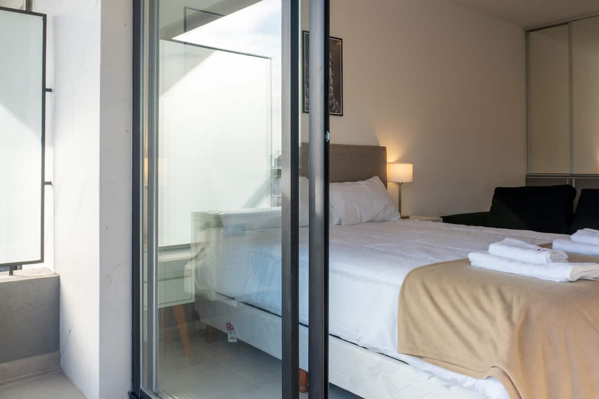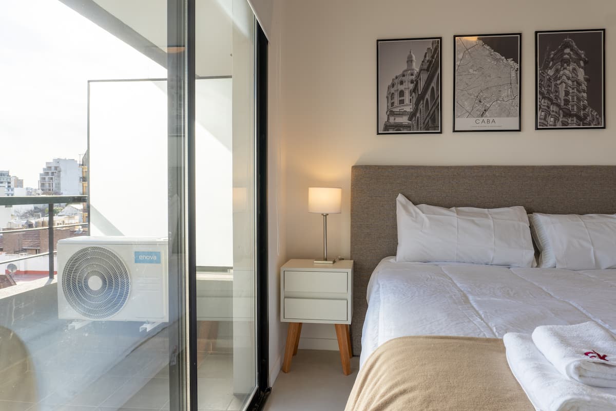 Studio apartment in Belgrano with a balcony. It is furnished with a double bed and a sofa bed. The kitchen includes an oven and a microwave, and the unit has a coffee maker, washing machine and smart TV, plus free WiFi and an electronic lock. Access to the communal multipurpose room (SUM) is granted by an access code for limited hours, from 11:00 to 18:00, and includes a pool, ping-pong tables, table football (metegol), exercise equipment and a grill.