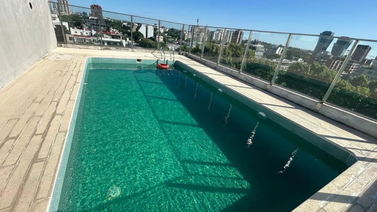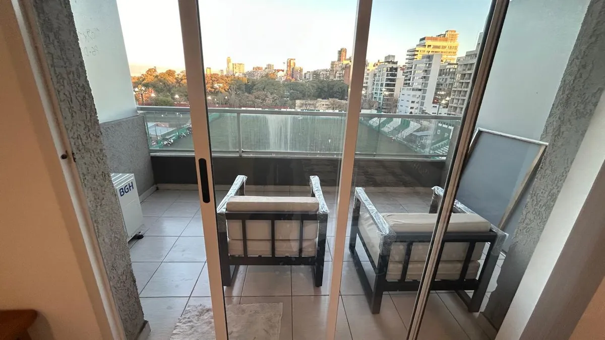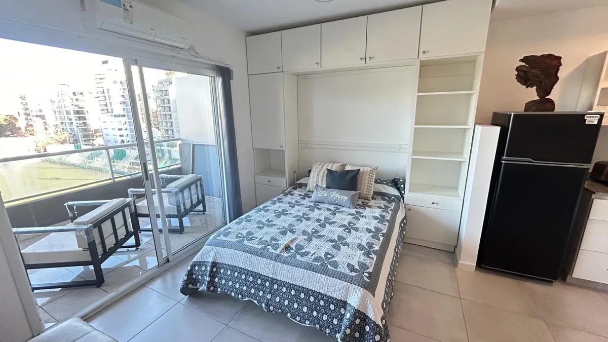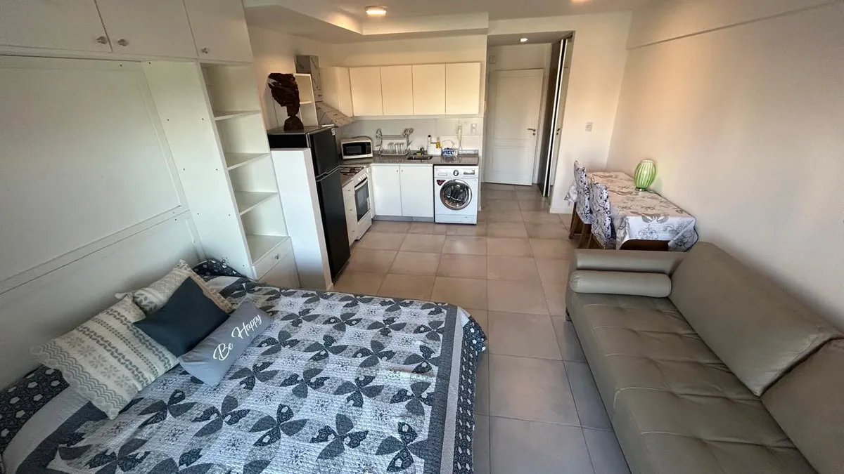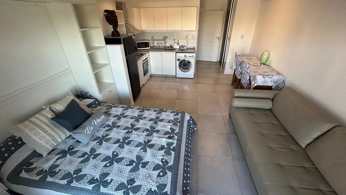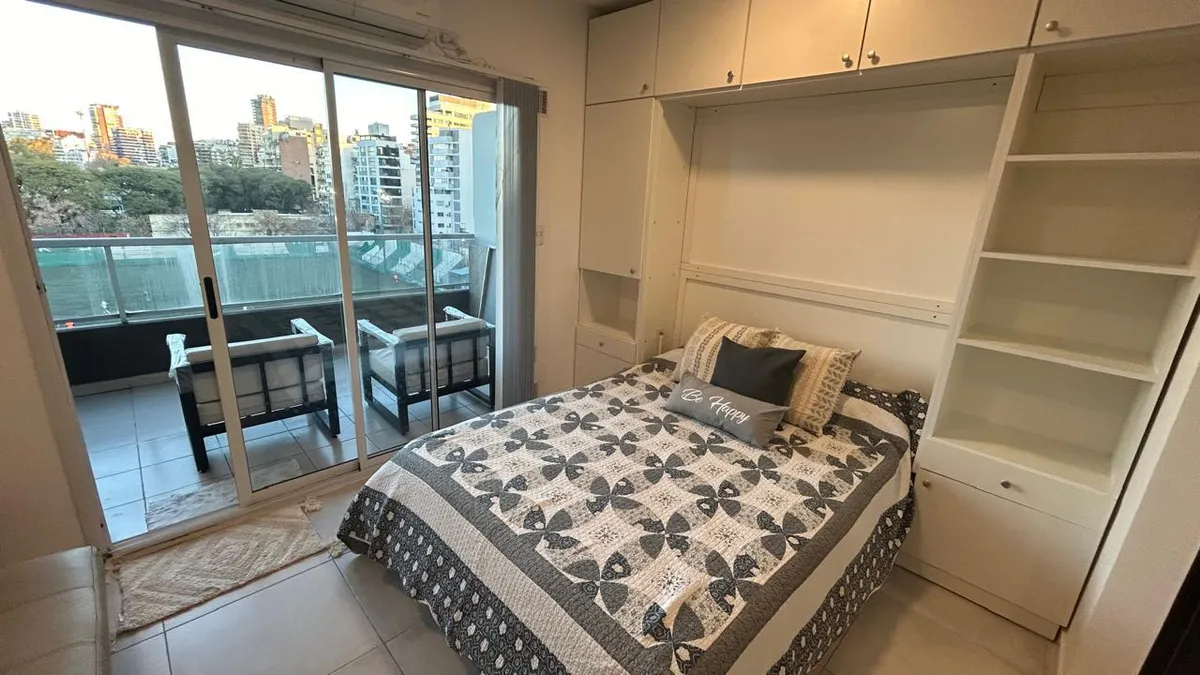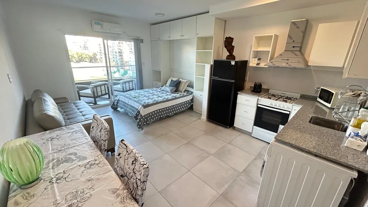 Studio apartment for temporary rent in Belgrano, Buenos Aires. The unit includes a balcony and has air conditioning and free WiFi. Building amenities include an outdoor pool and 24-hour reception. Available from March; minimum stay of 3 months with a deposit for the month and an additional real-estate commission.