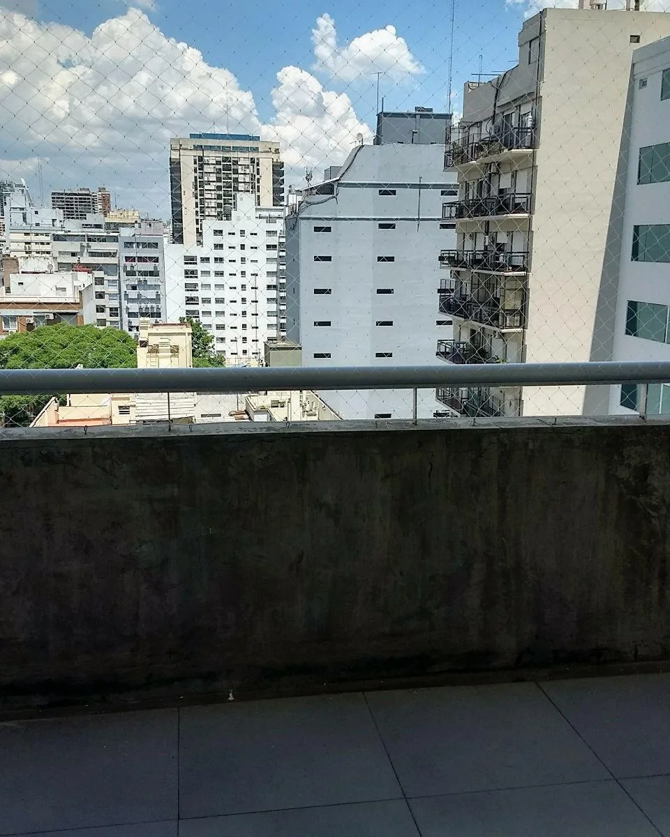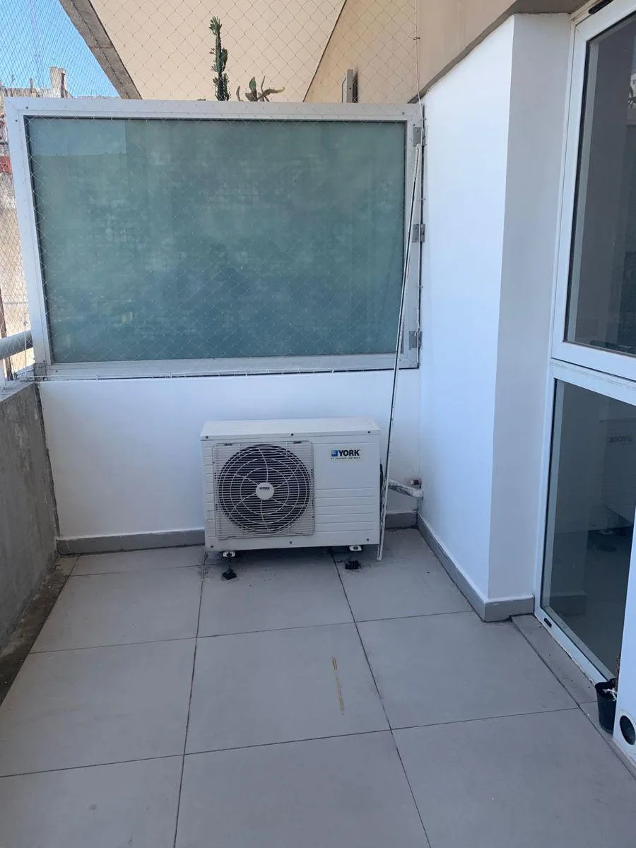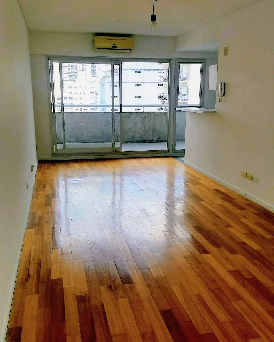 Divisible one-room apartment (studio) on the courtyard-facing side with a broad balcony with protective screen. It has 2 air-conditioning units, a full bathroom, a kitchen, and a storage room (baulera); the unit has been recently painted white. The building is 12 years old and includes a pool, residents' lounge (SUM), laundry facilities, and 2 lifts, with a security totem; it is near Av. Cabildo and close to Congreso de Tucumán station (Subte Línea D). Building fees are not specified.