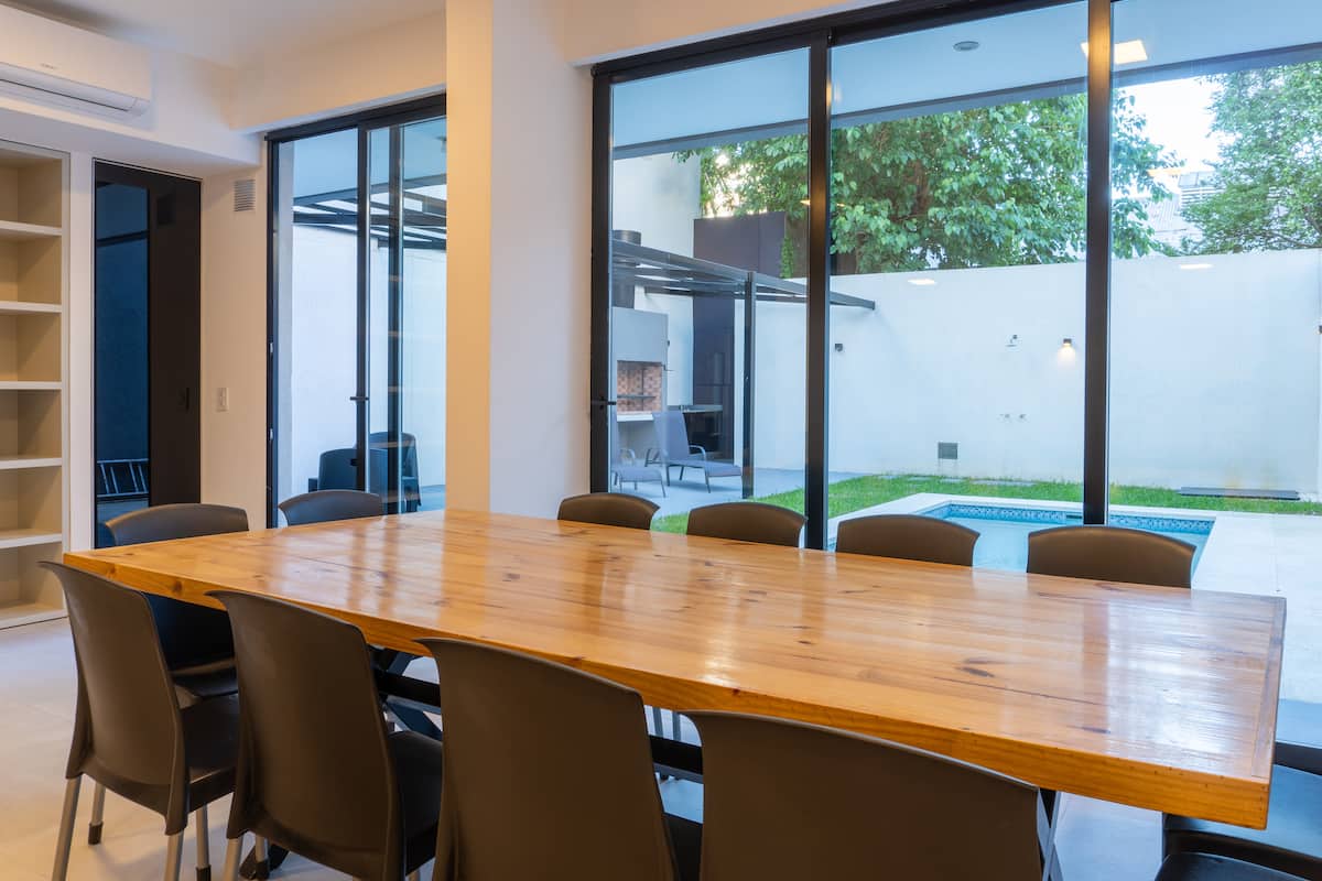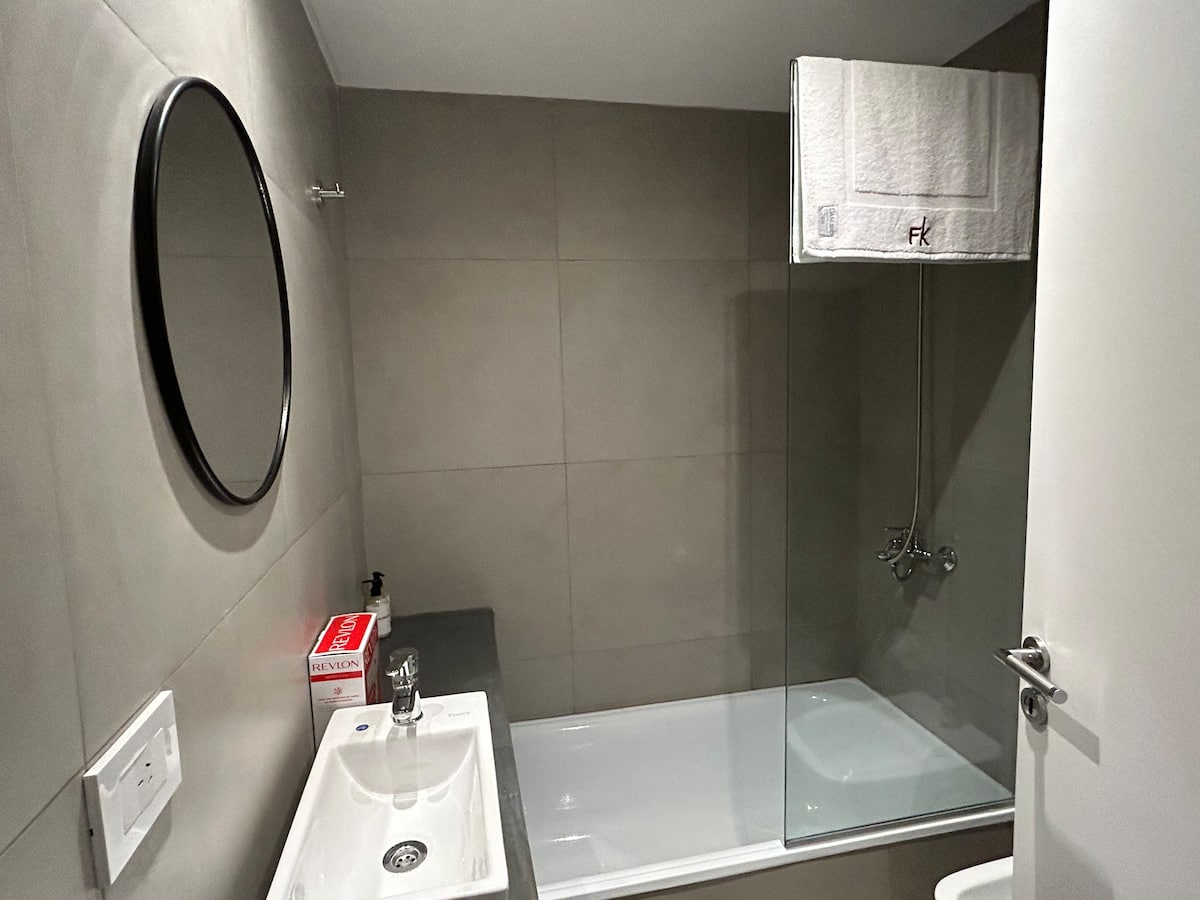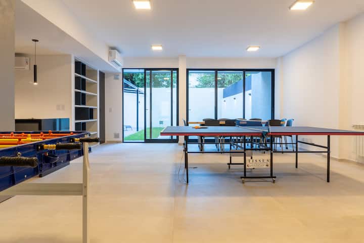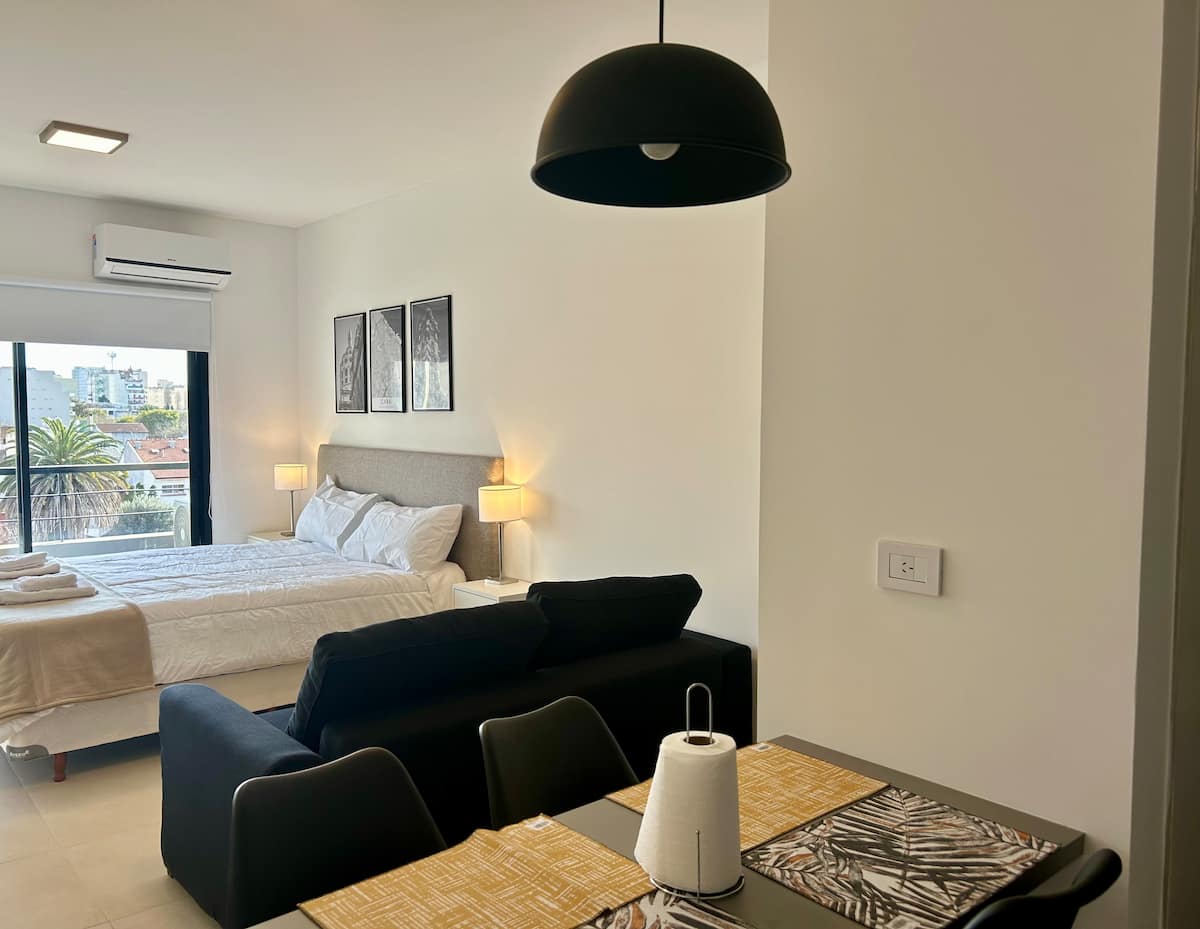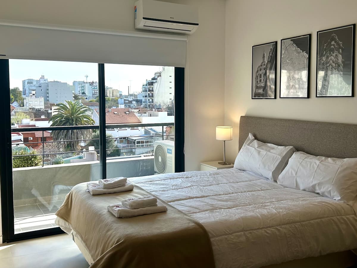 Studio apartment with a balcony in Belgrano. Includes a double bed and a sofa bed in the living area, a full bathroom, and a fully equipped kitchen with an oven, microwave and coffee maker. Also includes a washing machine and a smart TV, plus free Wi-Fi and an electronic lock. Building amenities include a communal multipurpose room (SUM) with a pool, ping pong tables, foosball, exercise machines and a grill; access requires an access code valid for limited hours, 11:00 AM to 6:00 PM.