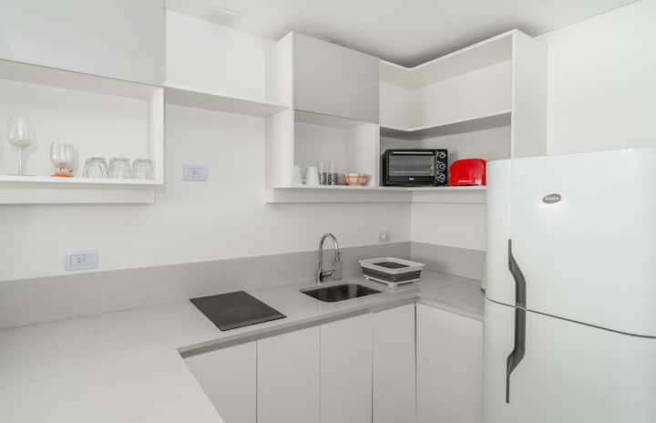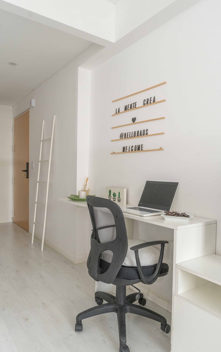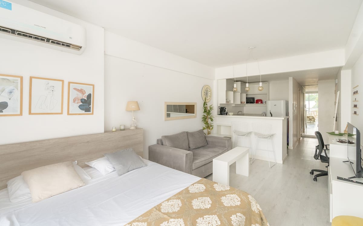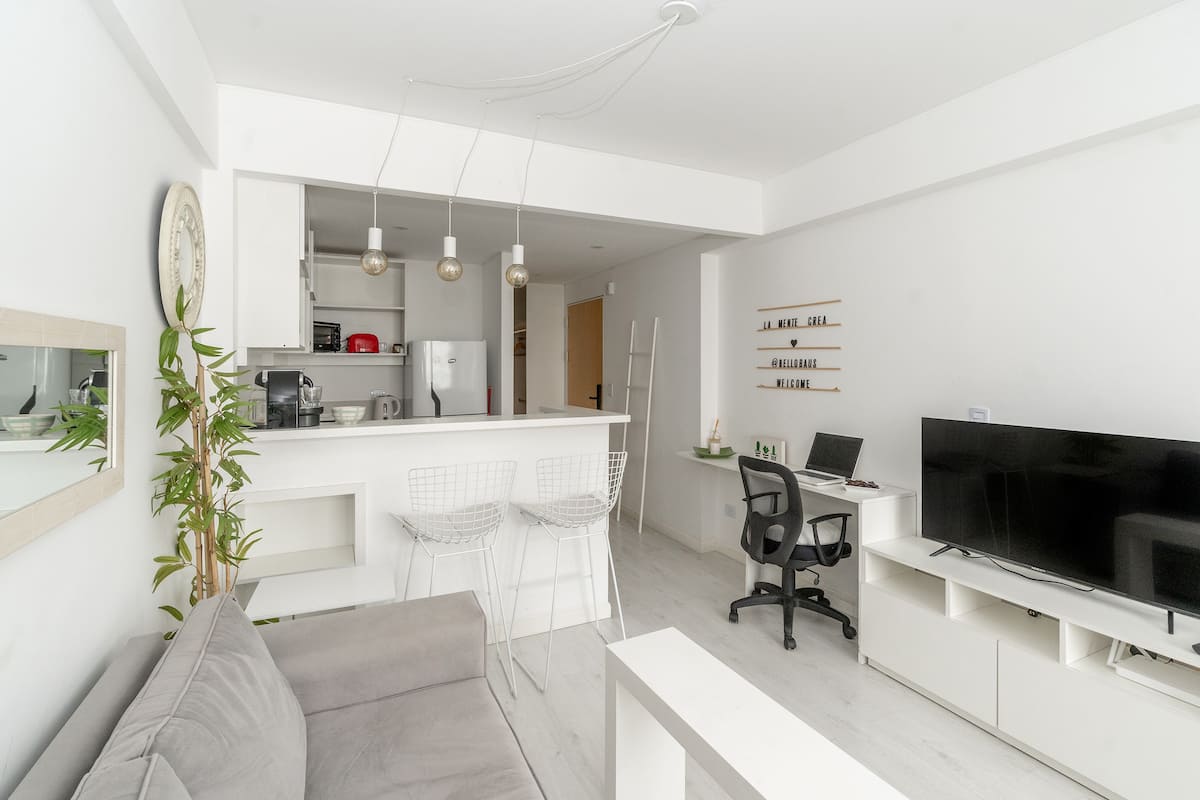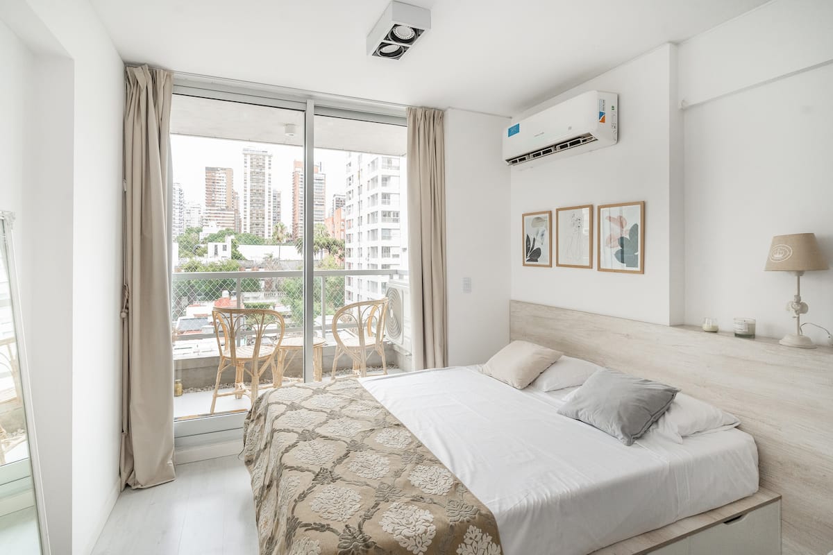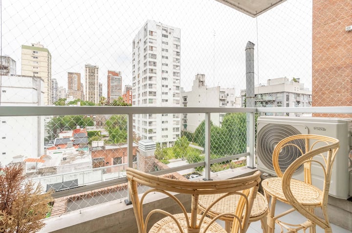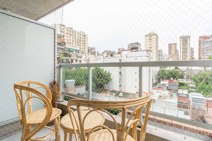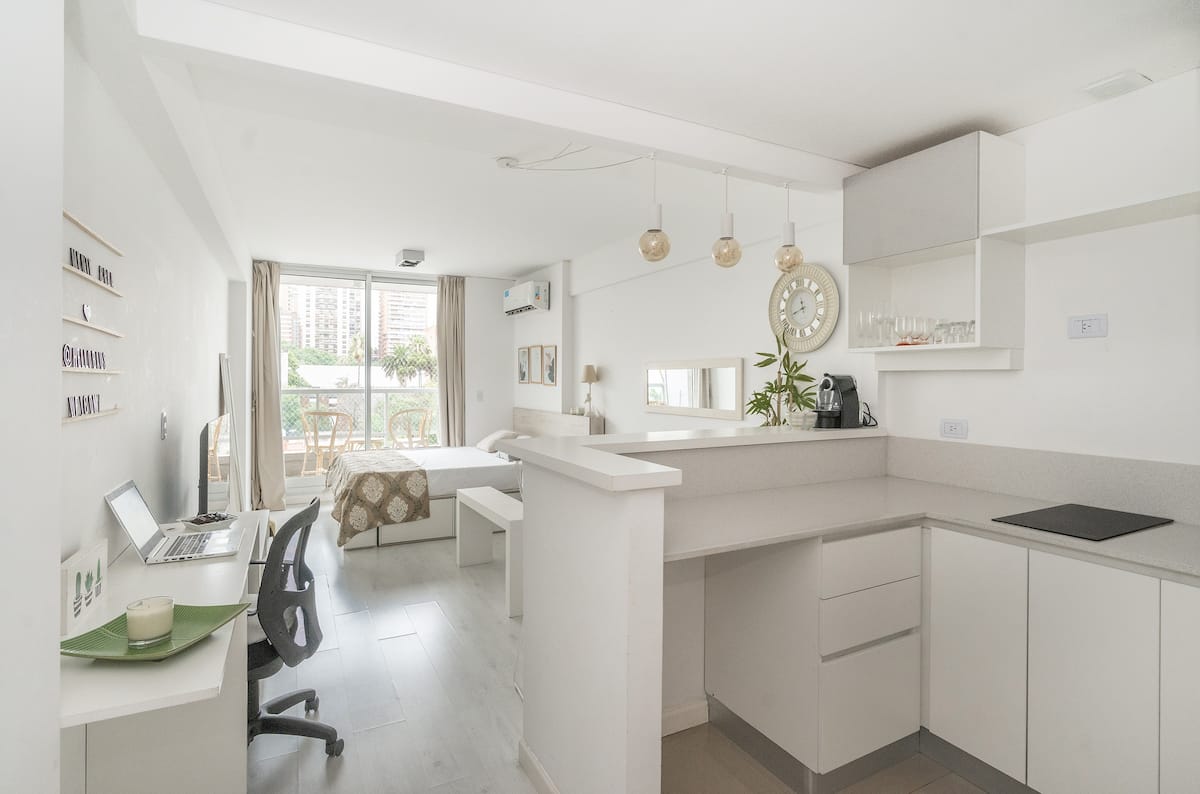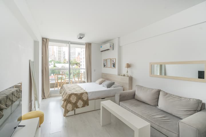 Studio apartment in Belgrano with a queen-size bed, a working desk and a full kitchen. Private balcony with an open view. The building has a gym, pool and laundry.
