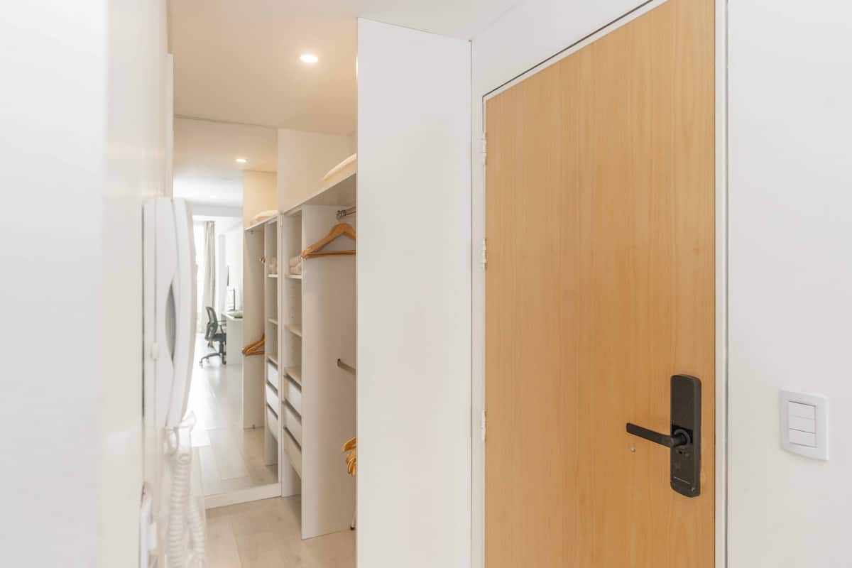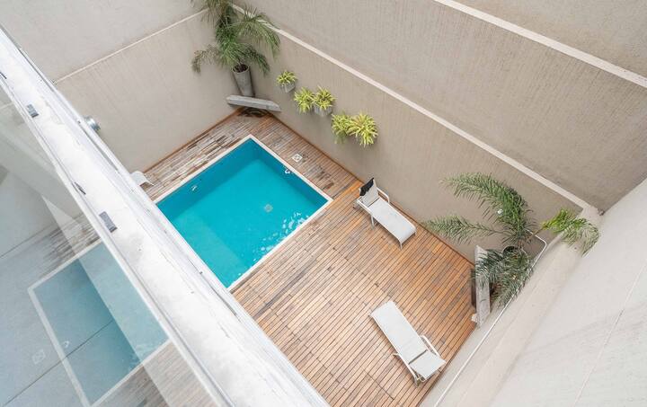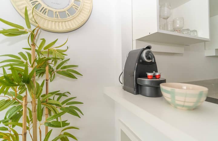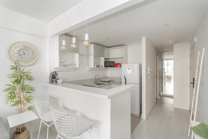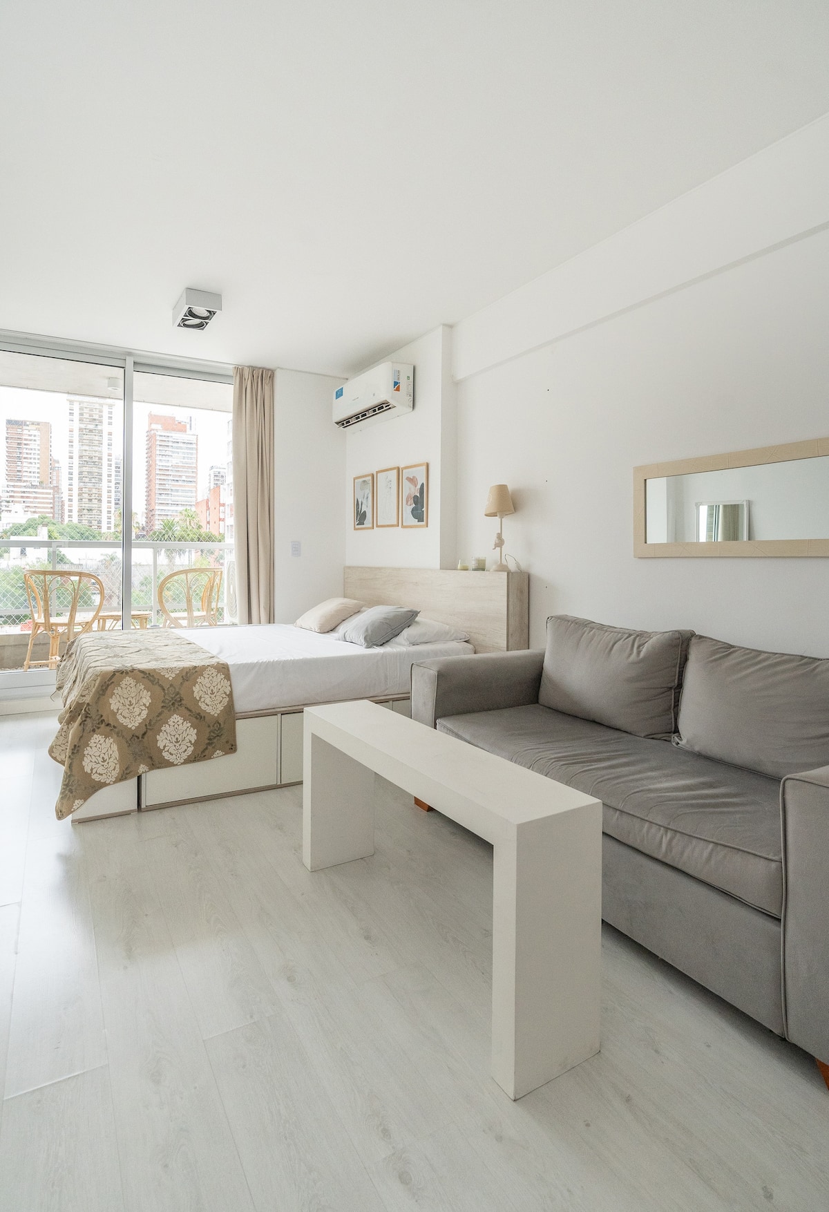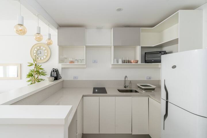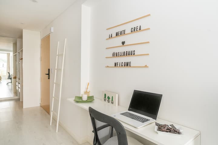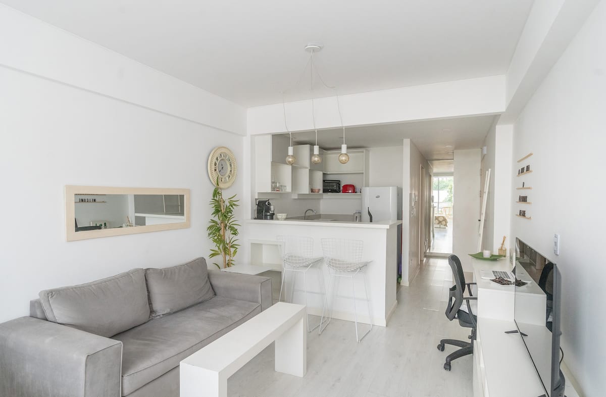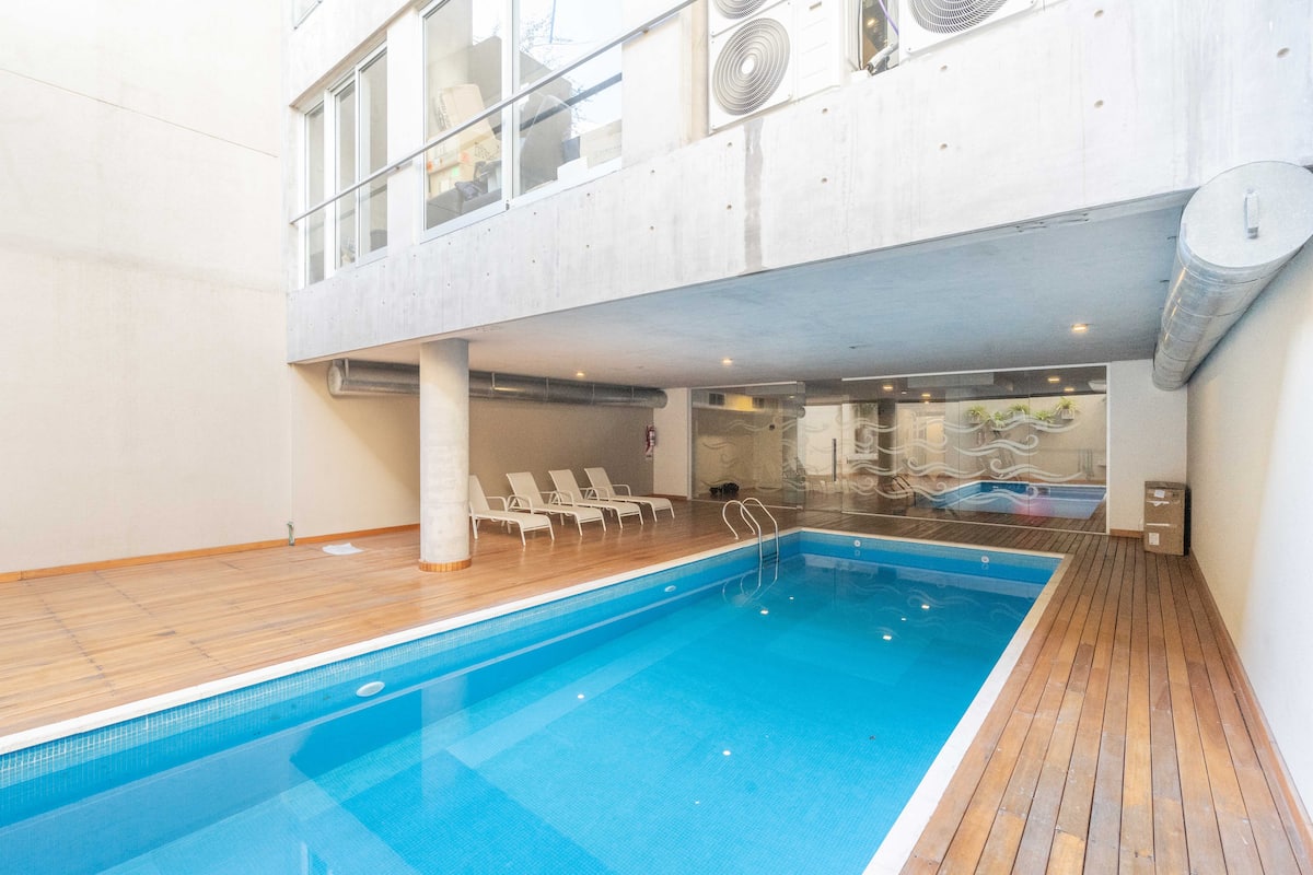 Studio apartment in Belgrano with a queen-size bed, a working desk and a full kitchen. Private balcony with an open view. The building has a gym, pool and laundry.