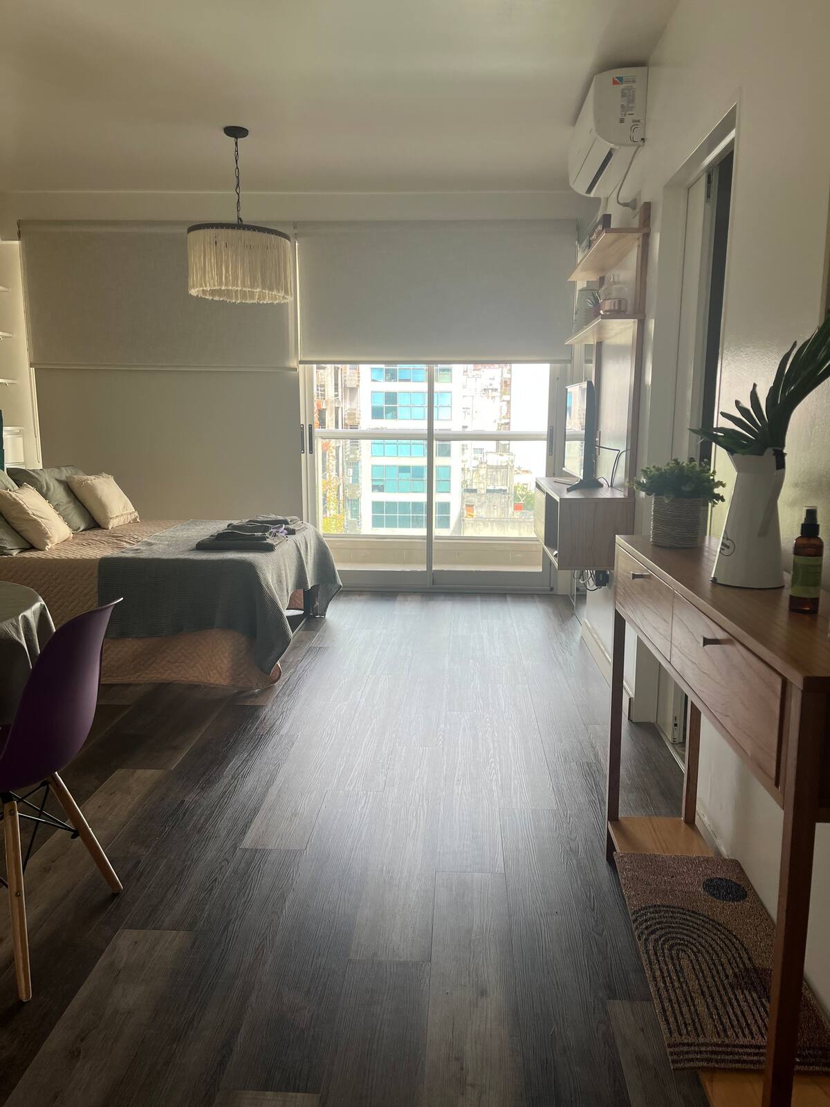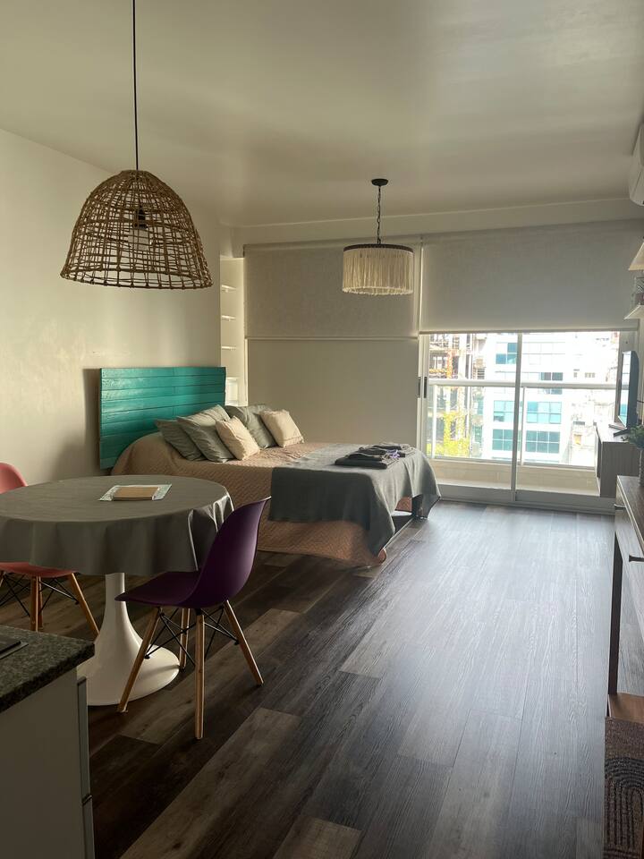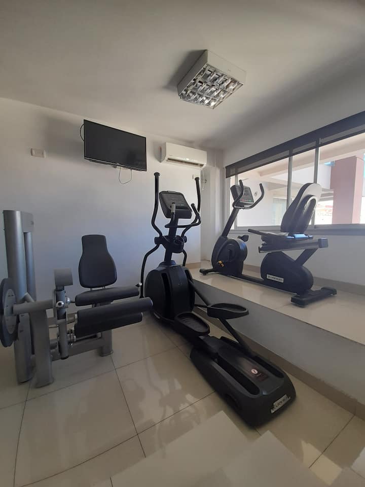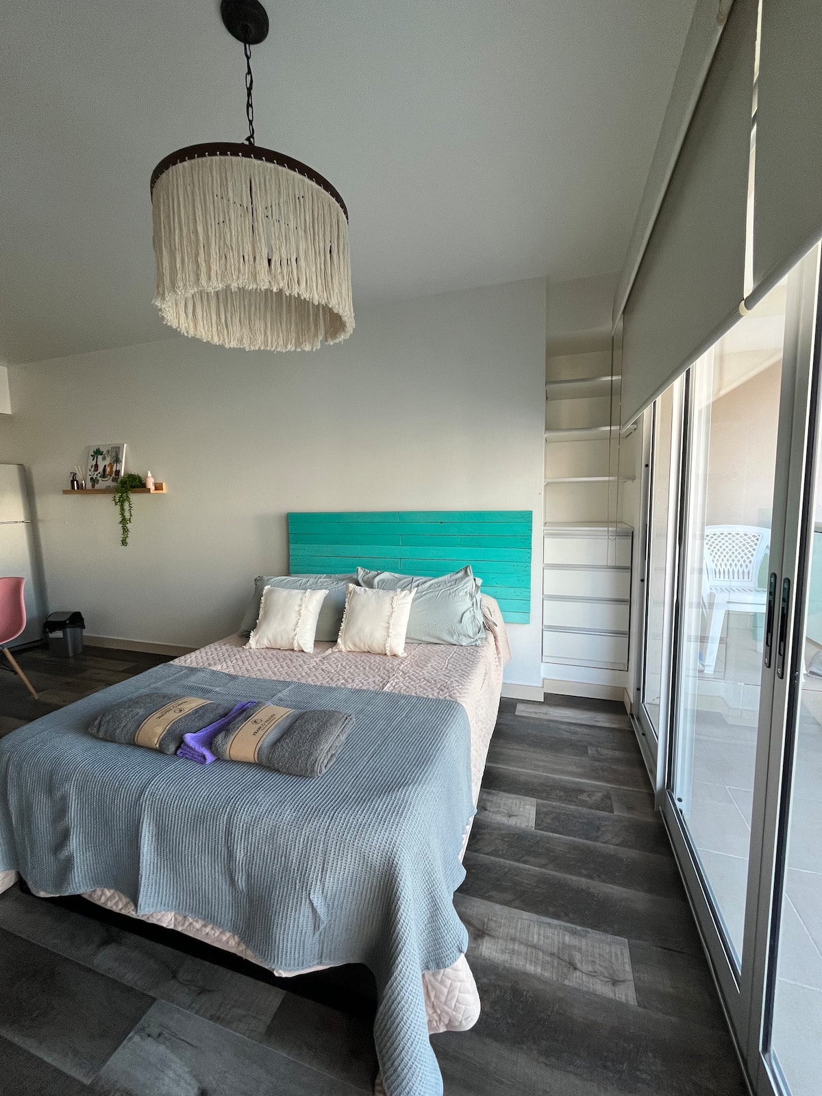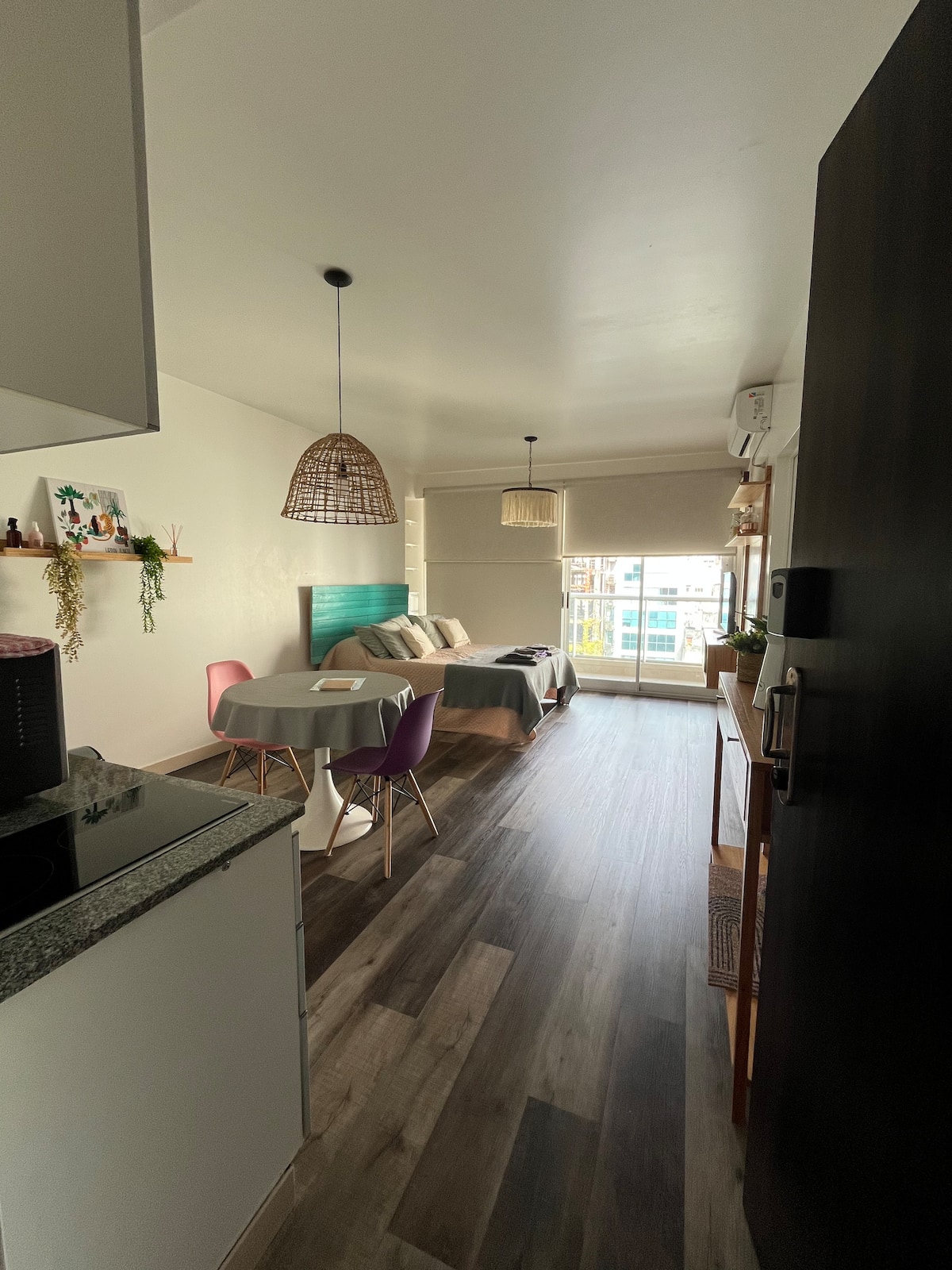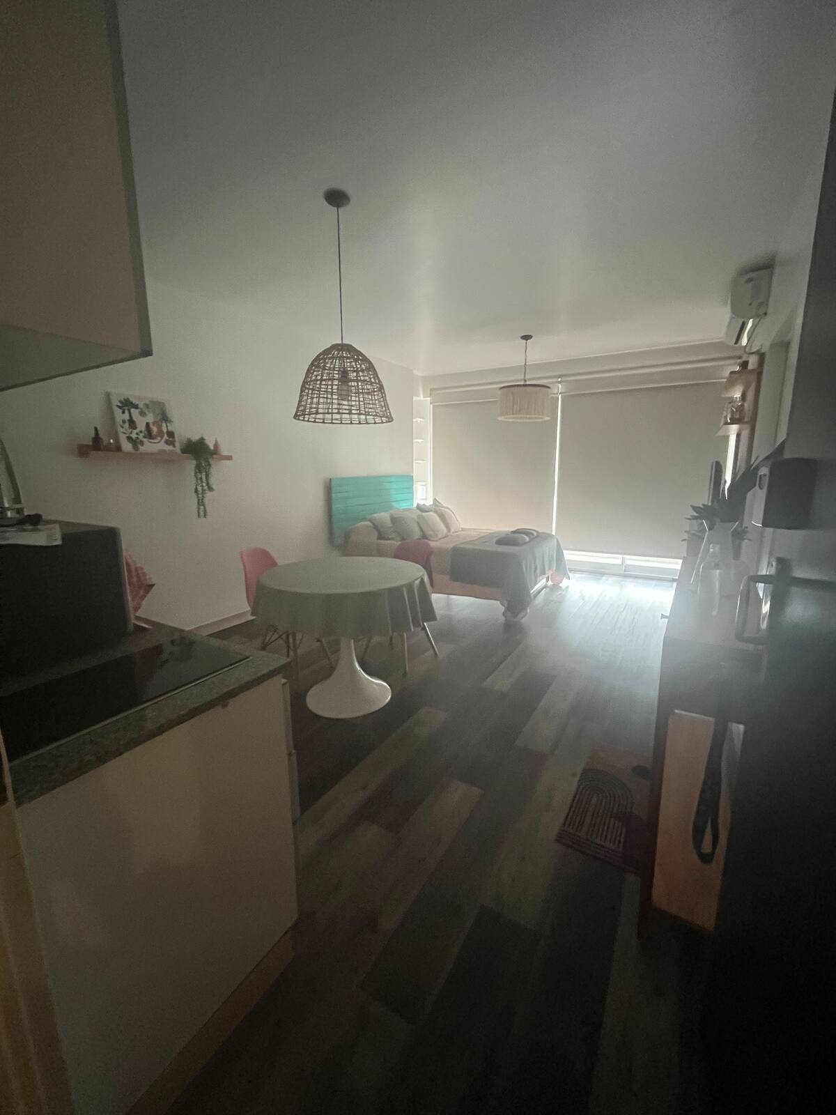 Studio apartment with a double bed, electric stove with 2 burners, oven with grill function, TV, and hot-cold air conditioning. It has electric utilities only (no gas), electricity and water included in the listing description, and a balcony. The building offers 24-hour security, a swimming pool, gym, and laundry; smoking is prohibited and children and pets are not allowed.