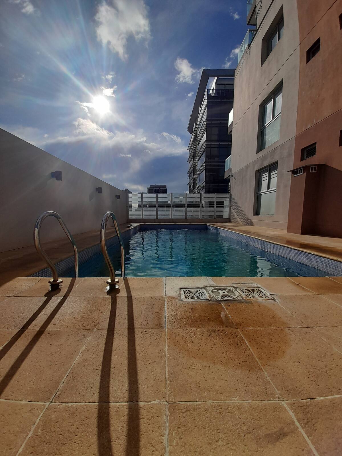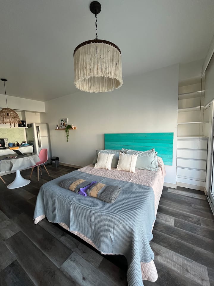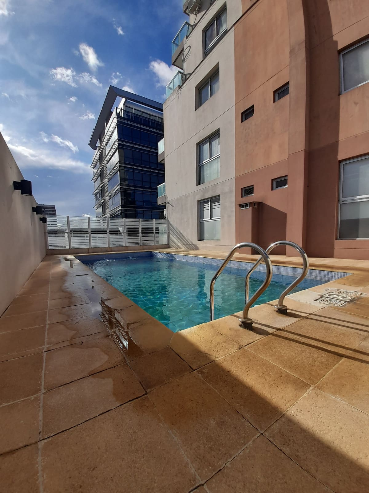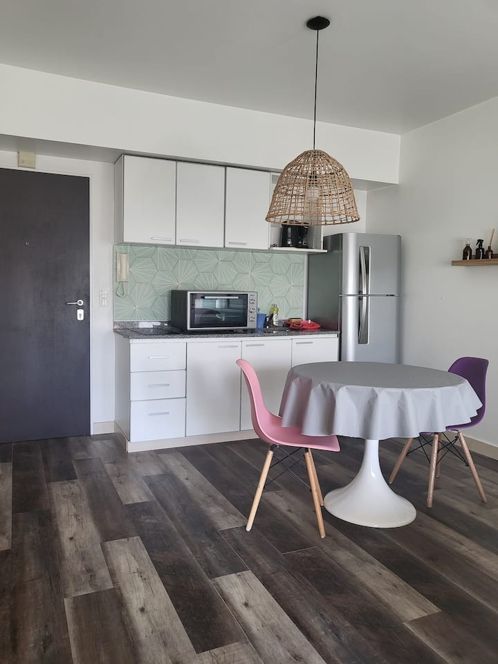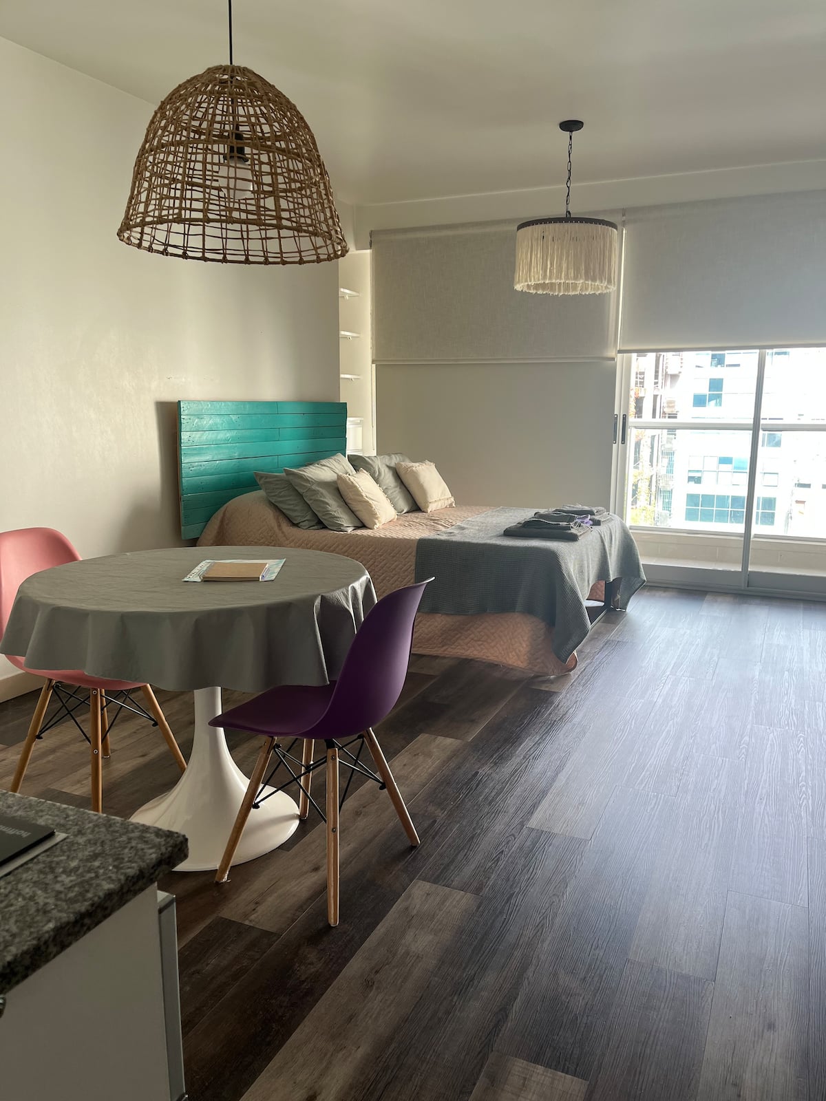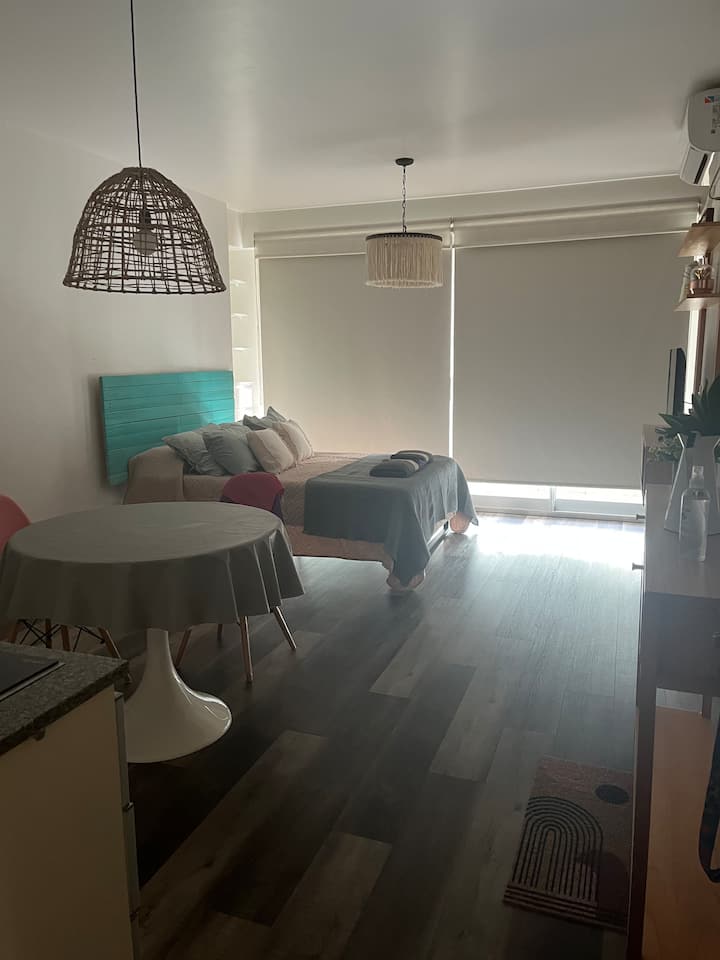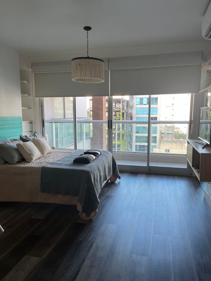 Studio apartment with a double bed, electric stove with 2 burners, oven with grill function, TV, and hot-cold air conditioning. It has electric utilities only (no gas), electricity and water included in the listing description, and a balcony. The building offers 24-hour security, a swimming pool, gym, and laundry; smoking is prohibited and children and pets are not allowed.