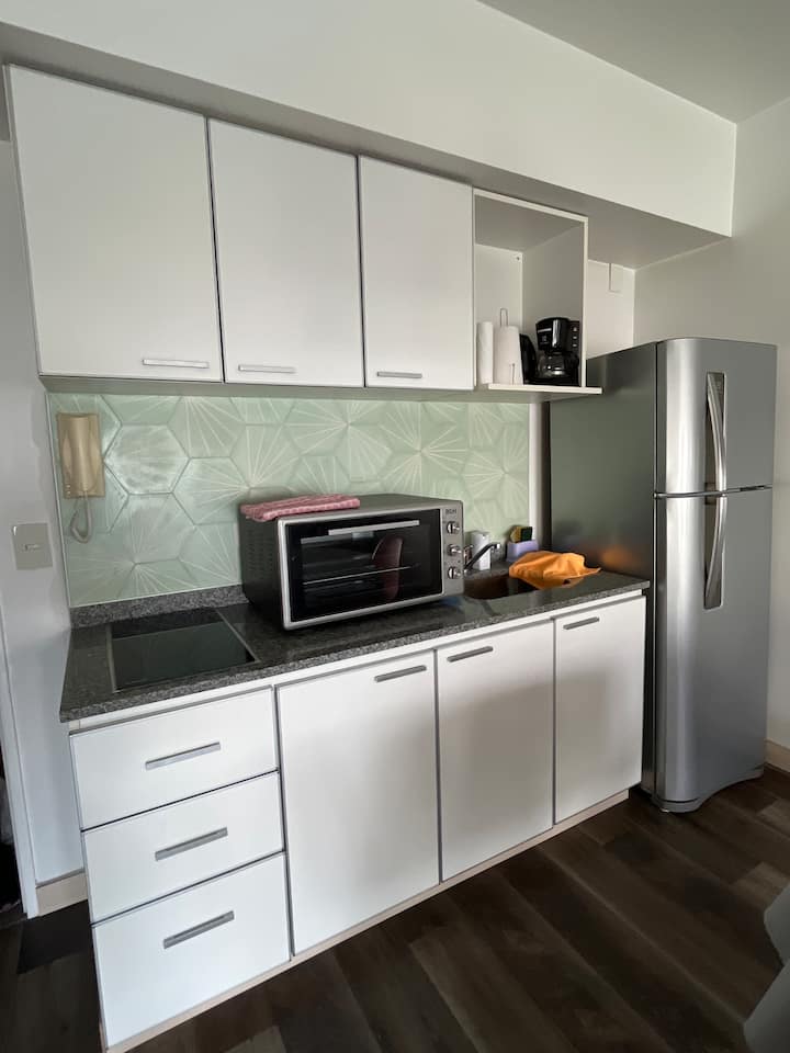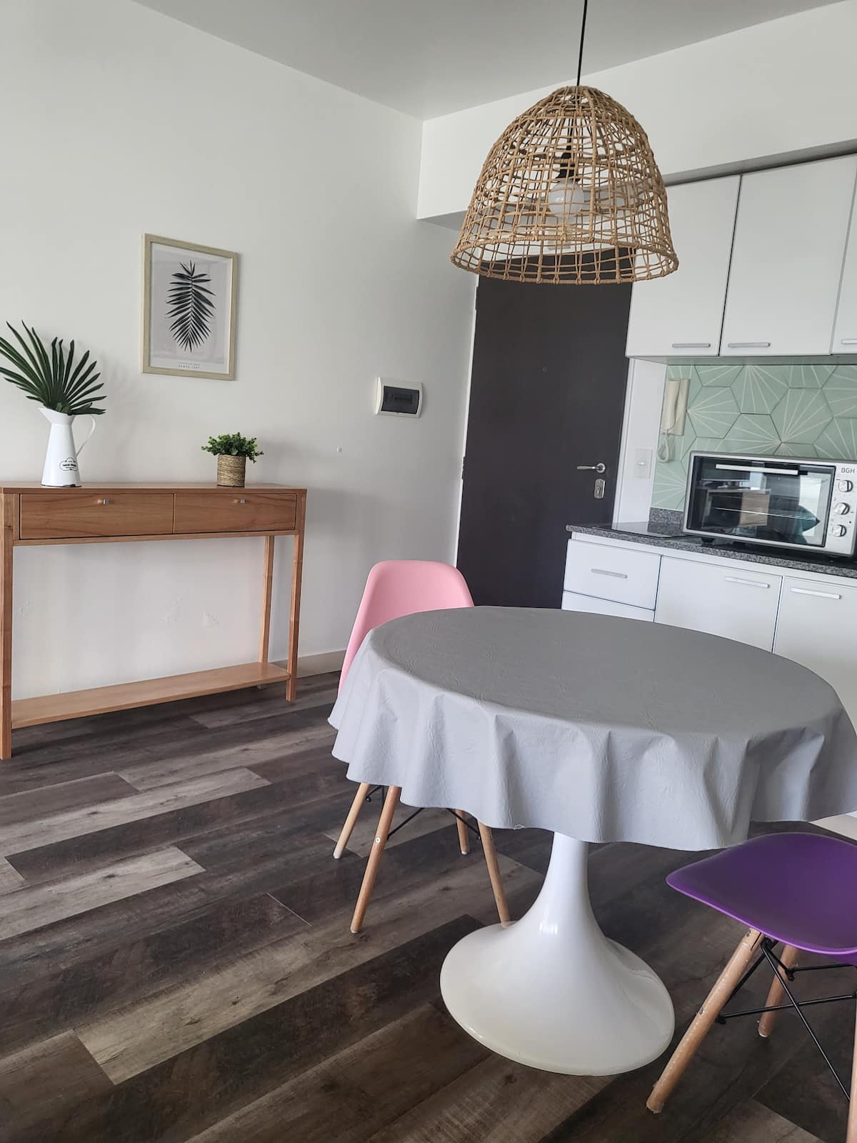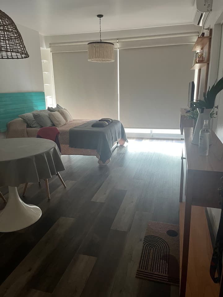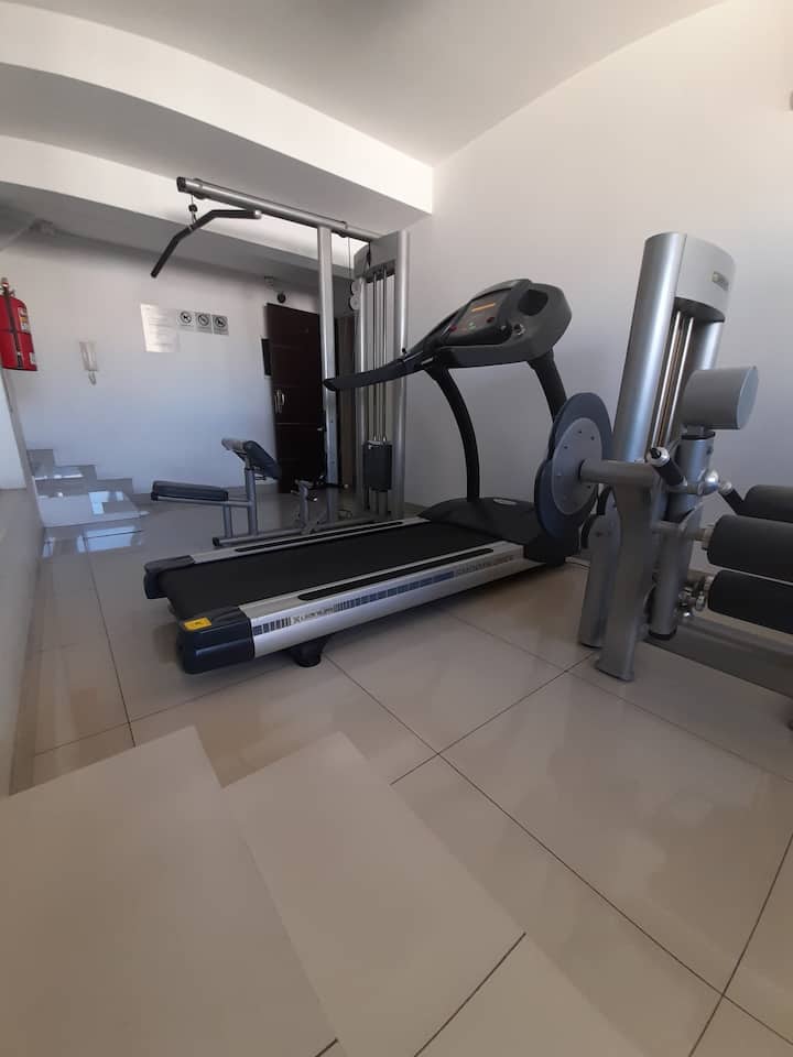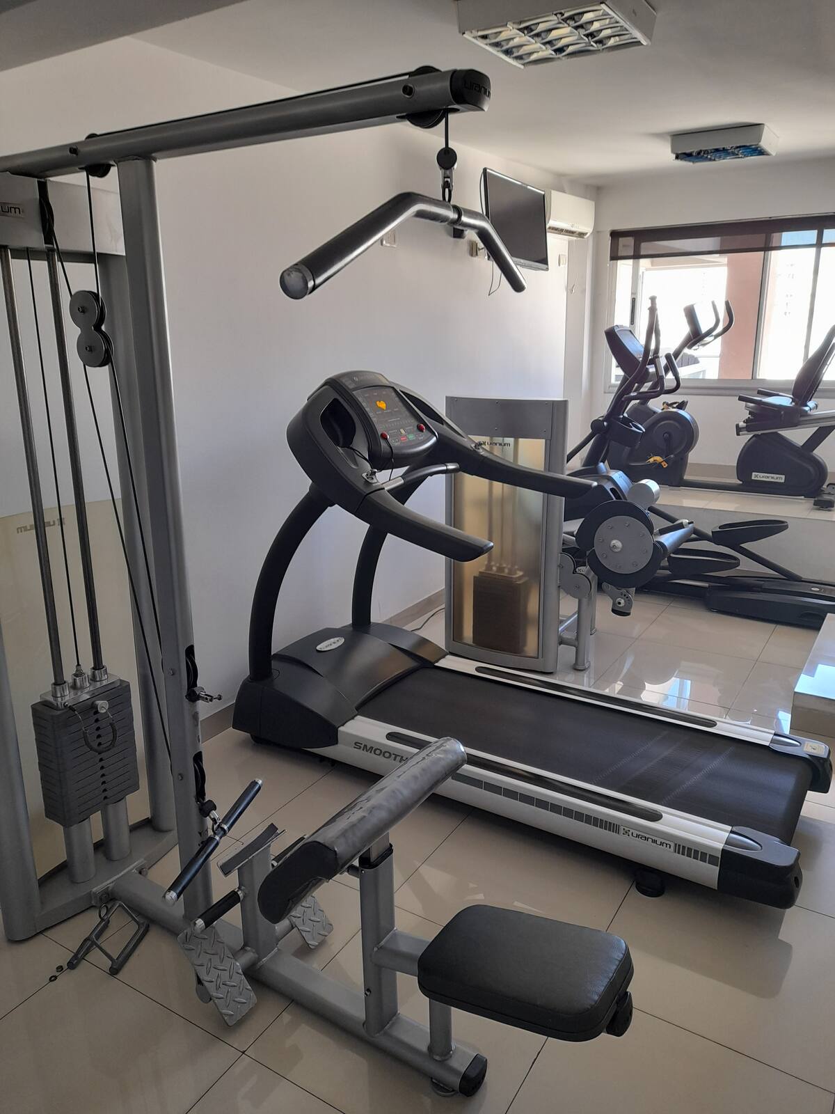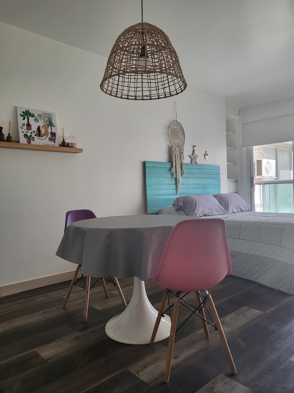Studio apartment with a double bed, electric stove with 2 burners, oven with grill function, TV, and hot-cold air conditioning. It has electric utilities only (no gas), electricity and water included in the listing description, and a balcony. The building offers 24-hour security, a swimming pool, gym, and laundry; smoking is prohibited and children and pets are not allowed.