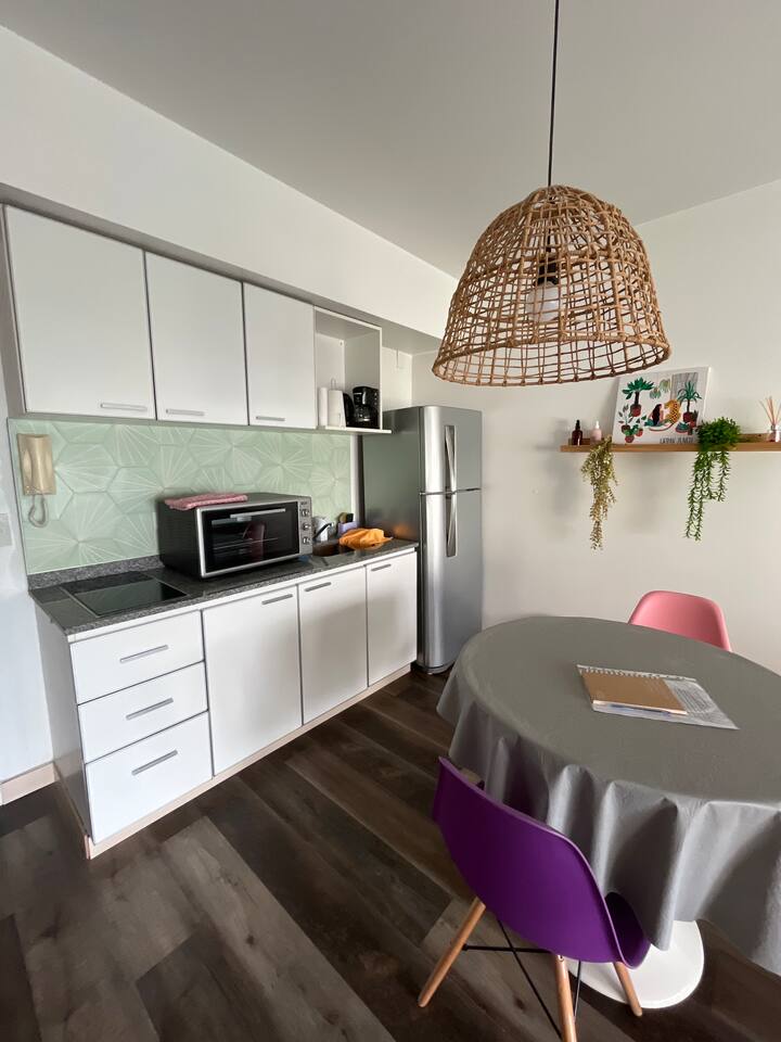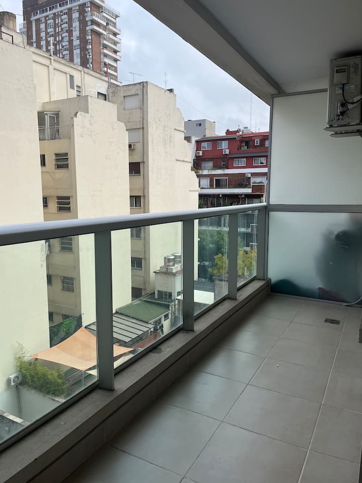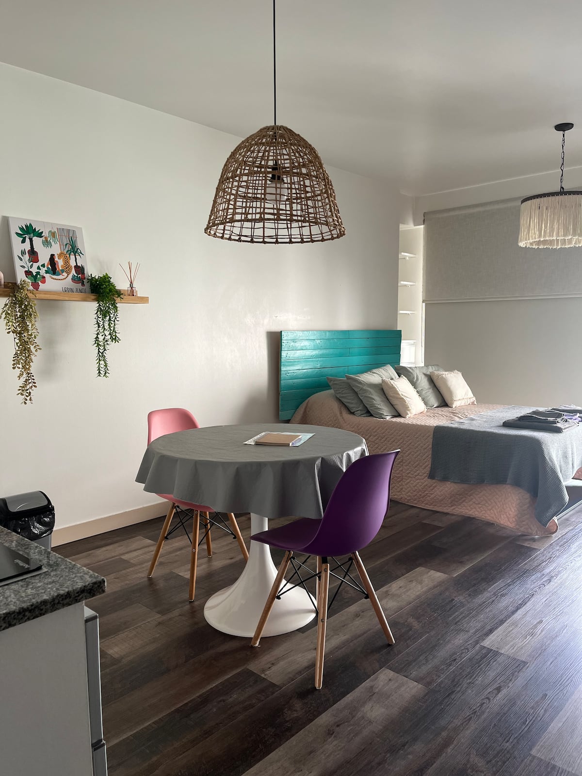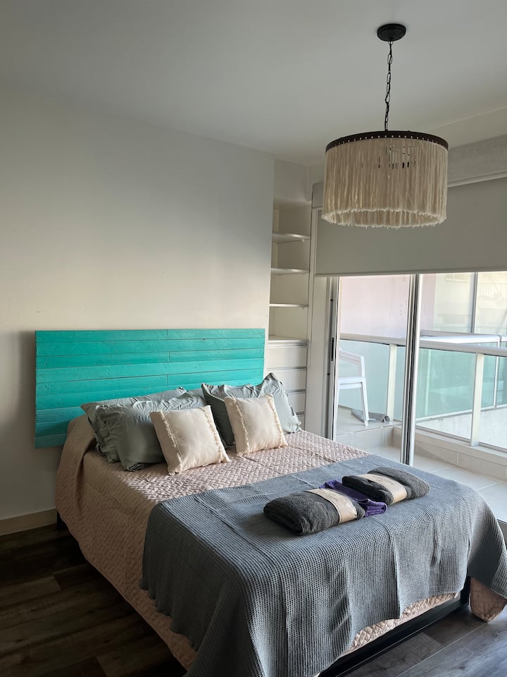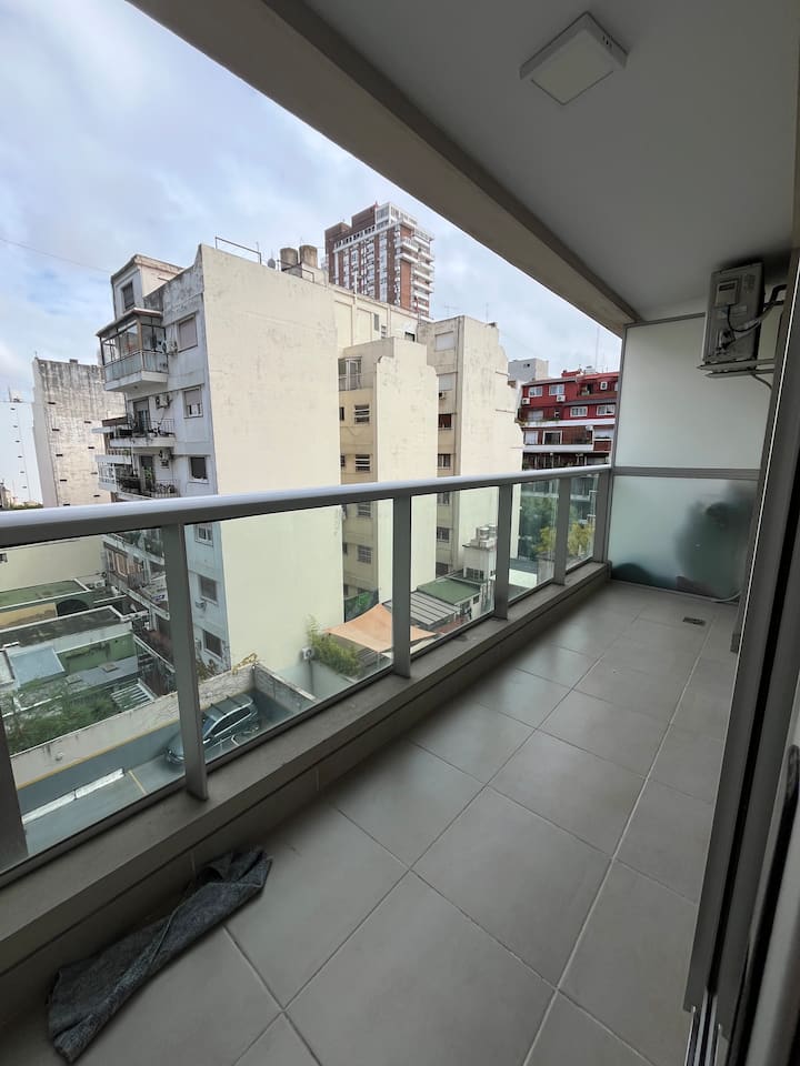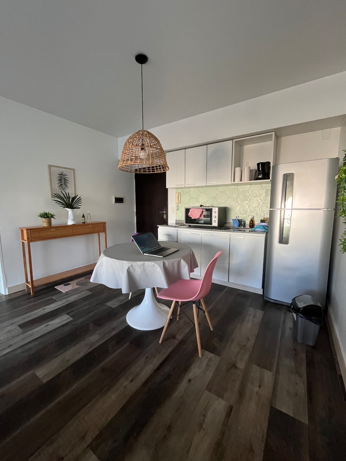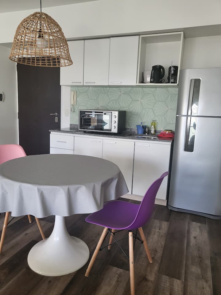 Studio apartment with a double bed, electric stove with 2 burners, oven with grill function, TV, and hot-cold air conditioning. It has electric utilities only (no gas), electricity and water included in the listing description, and a balcony. The building offers 24-hour security, a swimming pool, gym, and laundry; smoking is prohibited and children and pets are not allowed.