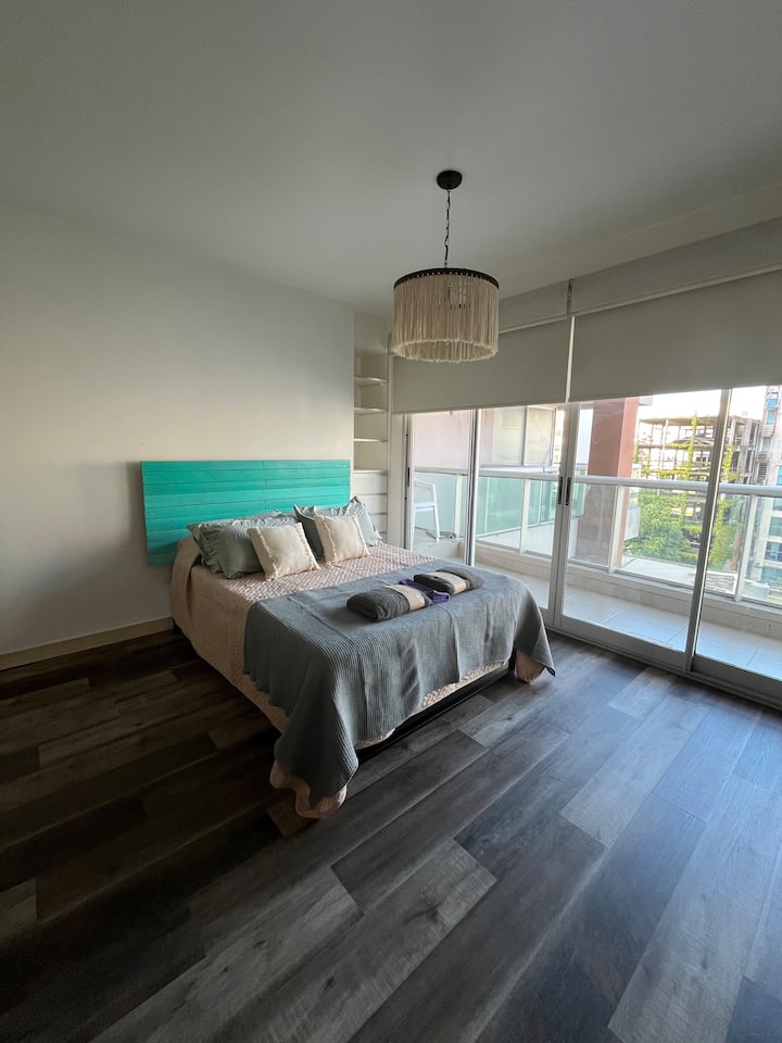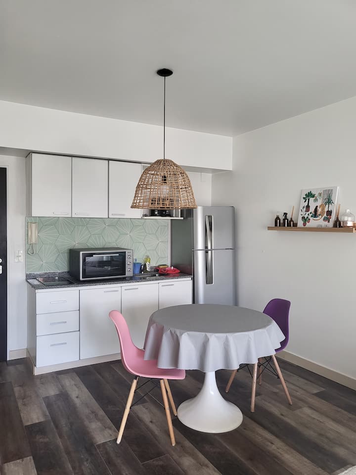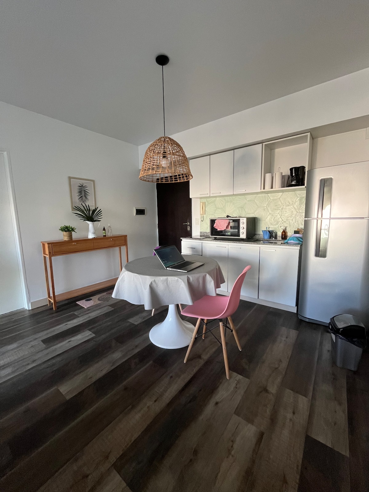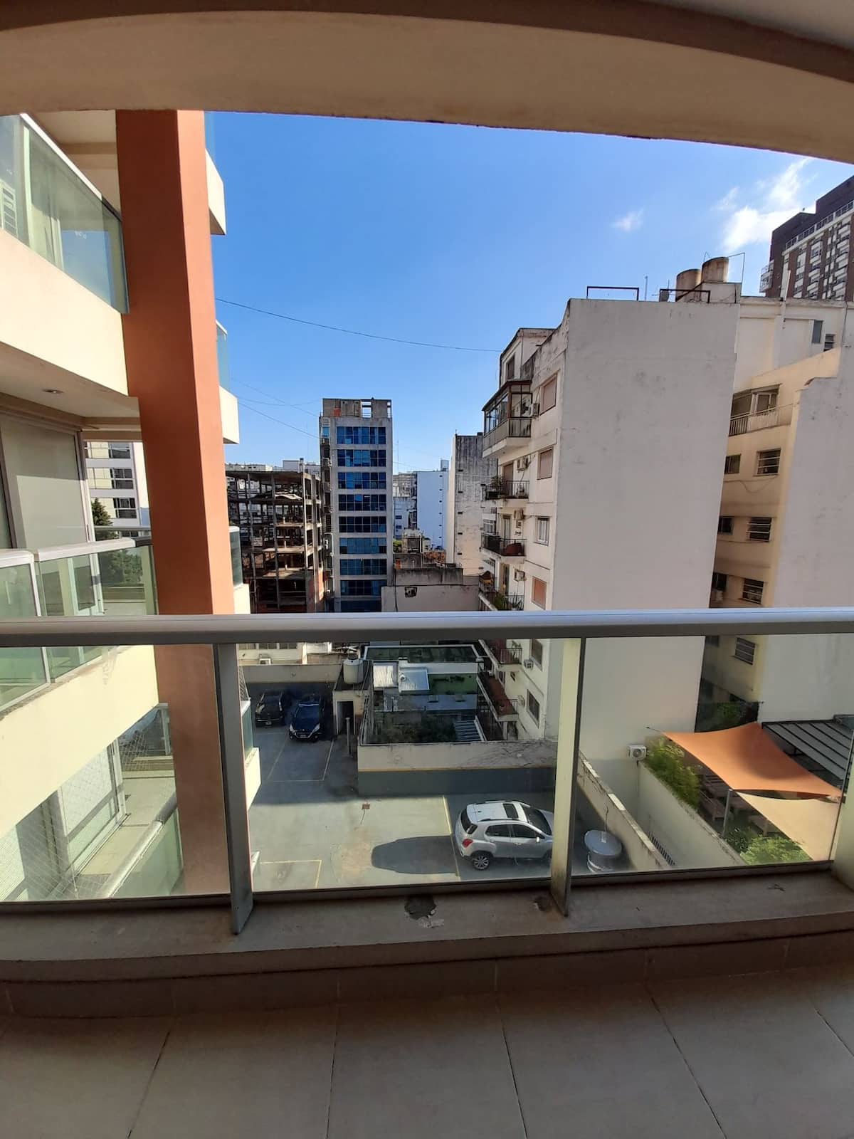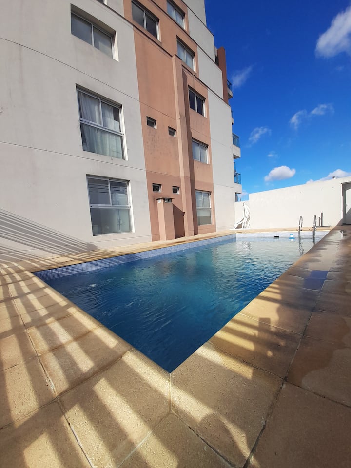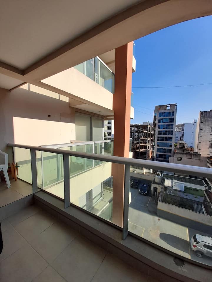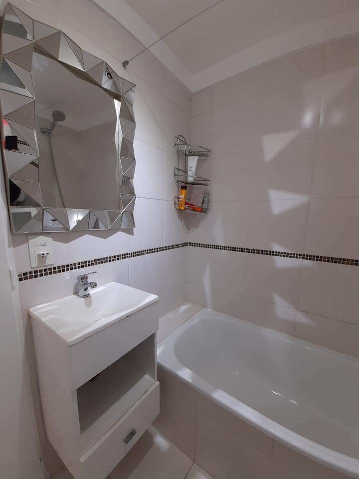 Studio apartment with a double bed, electric stove with 2 burners, oven with grill function, TV, and hot-cold air conditioning. It has electric utilities only (no gas), electricity and water included in the listing description, and a balcony. The building offers 24-hour security, a swimming pool, gym, and laundry; smoking is prohibited and children and pets are not allowed.