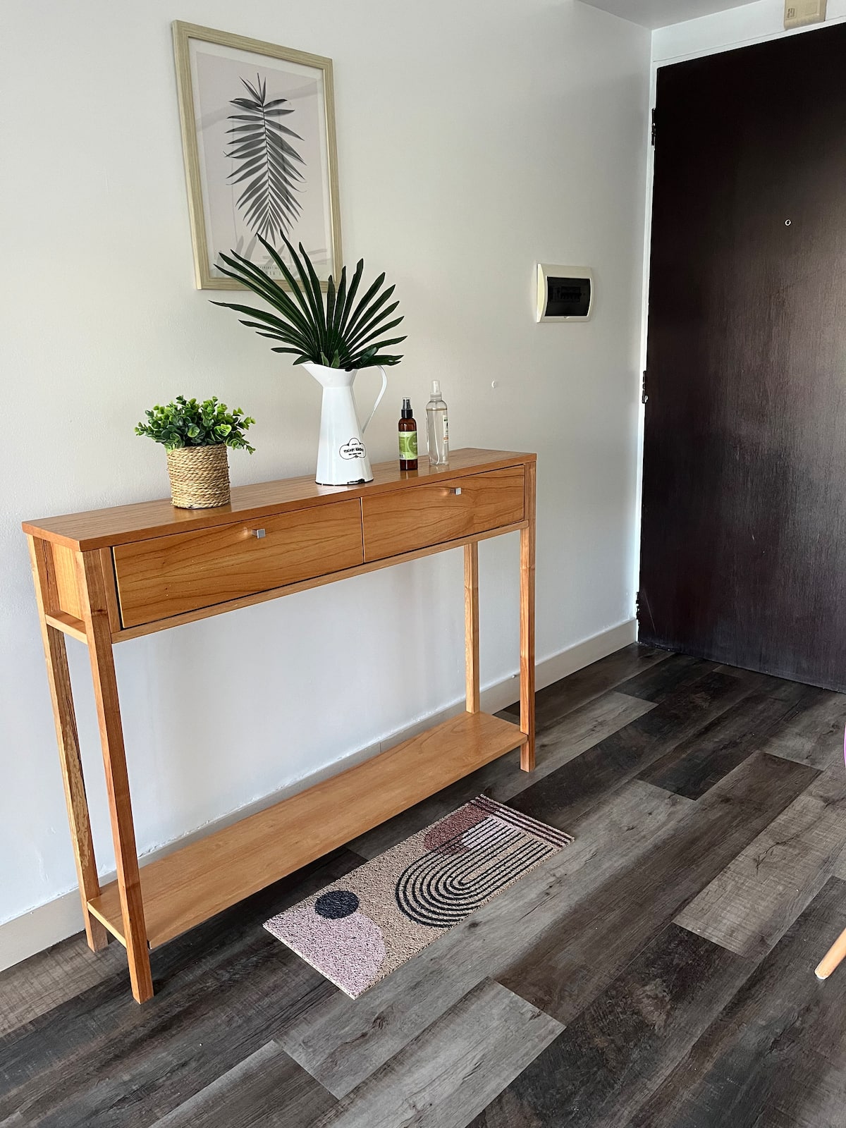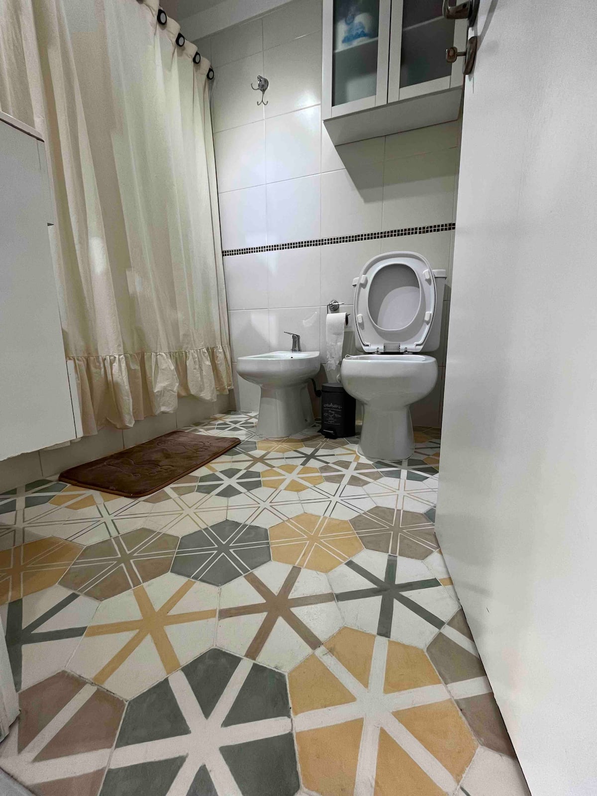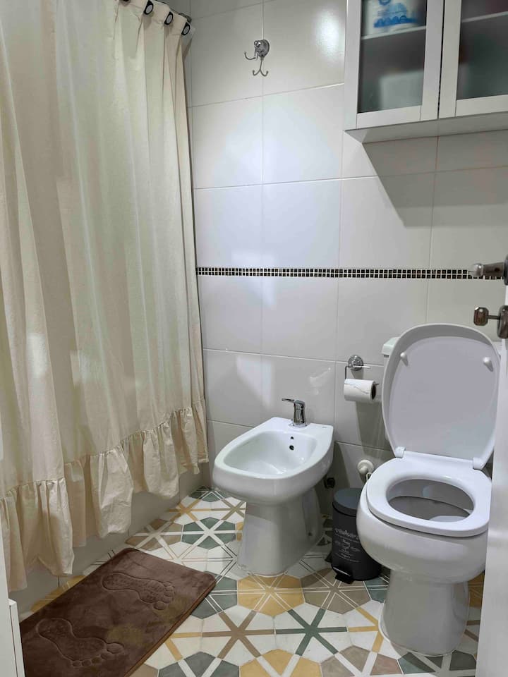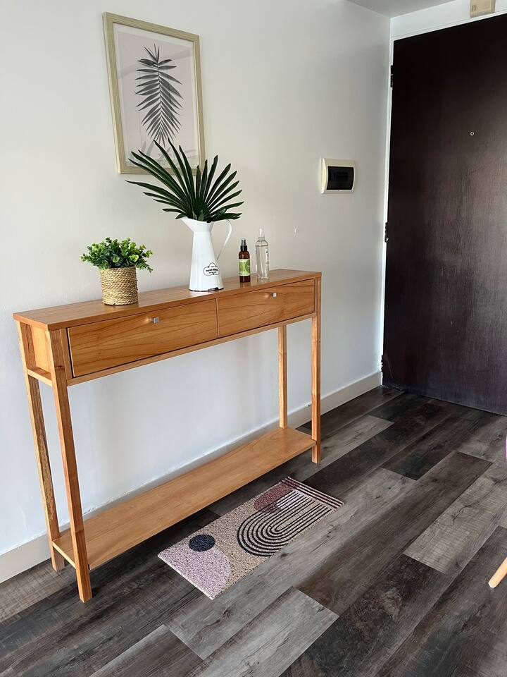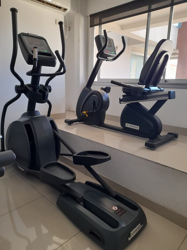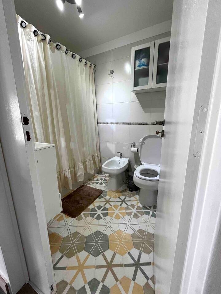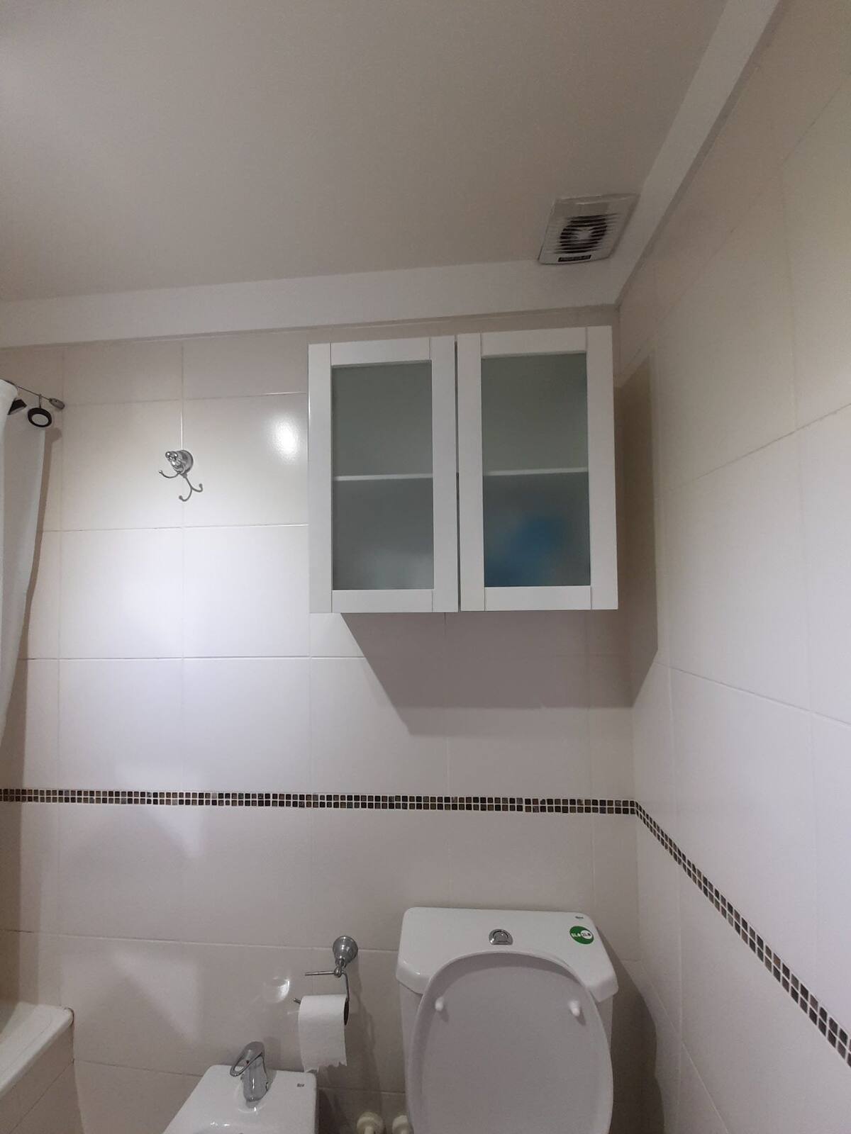 Studio apartment with a double bed, electric stove with 2 burners, oven with grill function, TV, and hot-cold air conditioning. It has electric utilities only (no gas), electricity and water included in the listing description, and a balcony. The building offers 24-hour security, a swimming pool, gym, and laundry; smoking is prohibited and children and pets are not allowed.