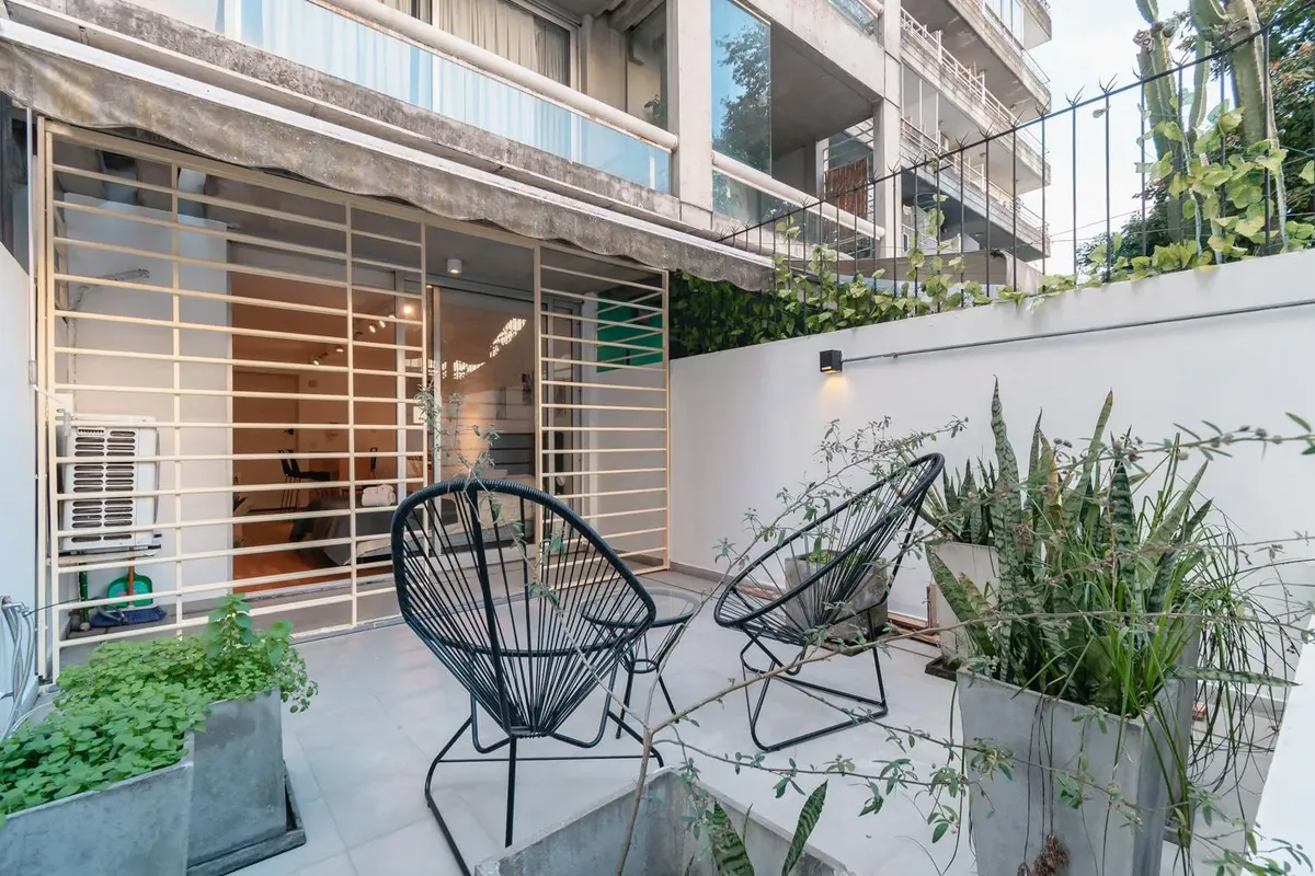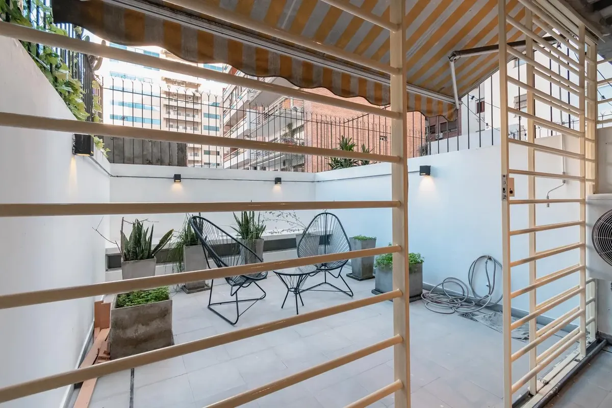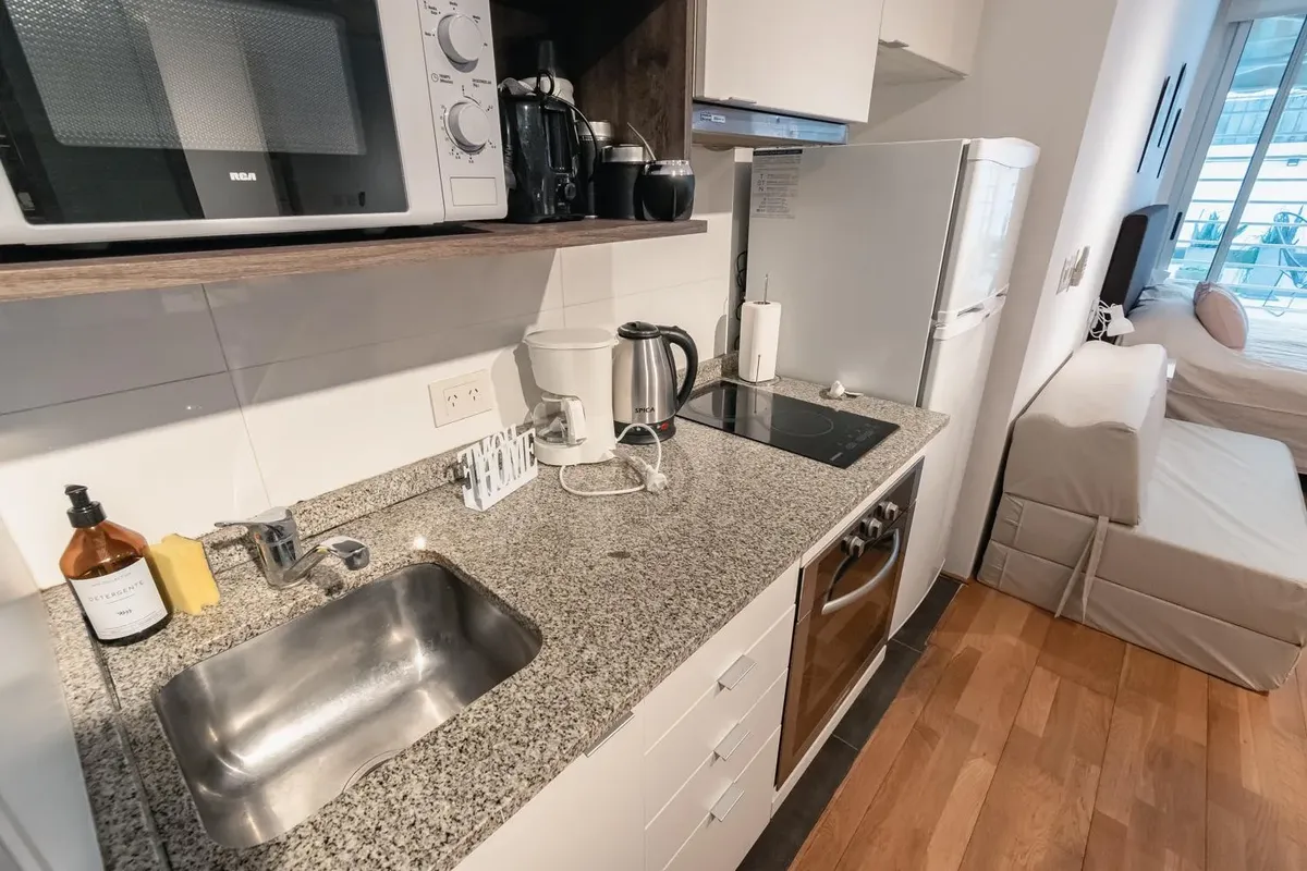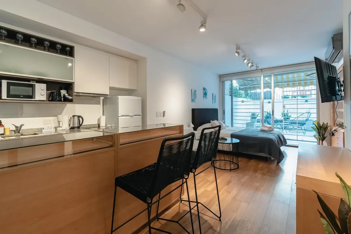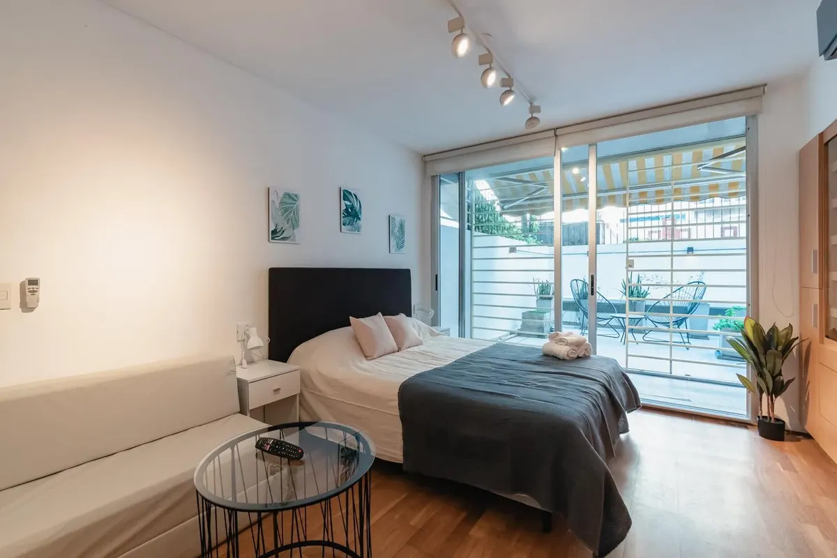 Fully equipped studio apartment in Belgrano. The living area has direct access to a private patio, with a kitchenette with electric hotplates and oven and cabinets below and above the countertop. The bathroom has been newly renovated with a shower. (Assigned) covered parking space in the basement. Building amenities include laundry, communal room, grill, solarium and pool.