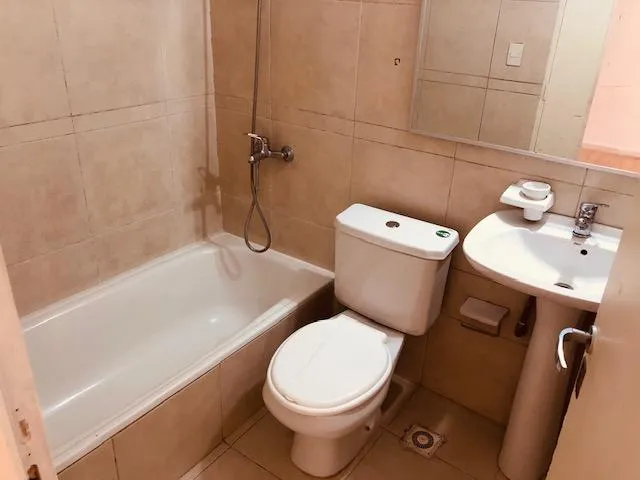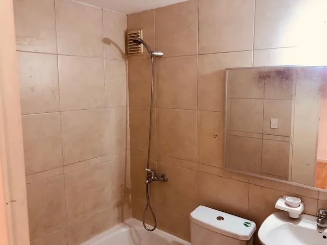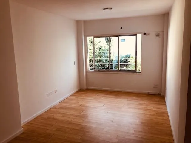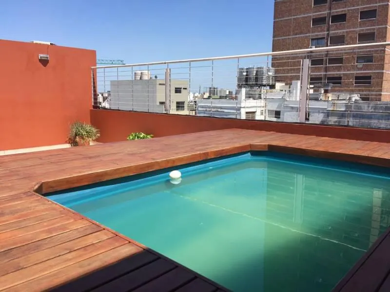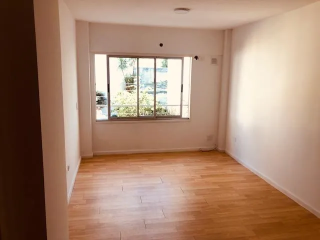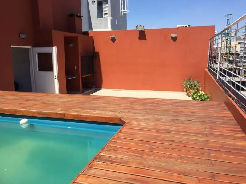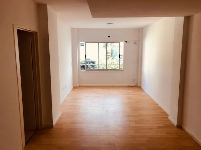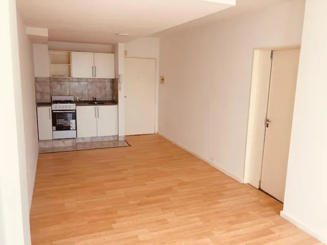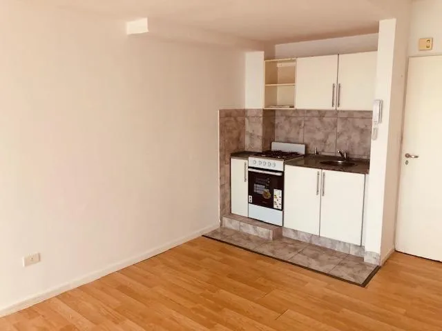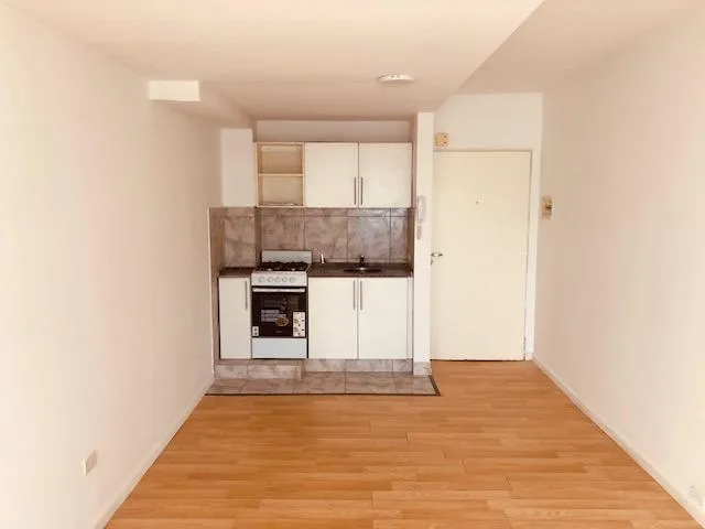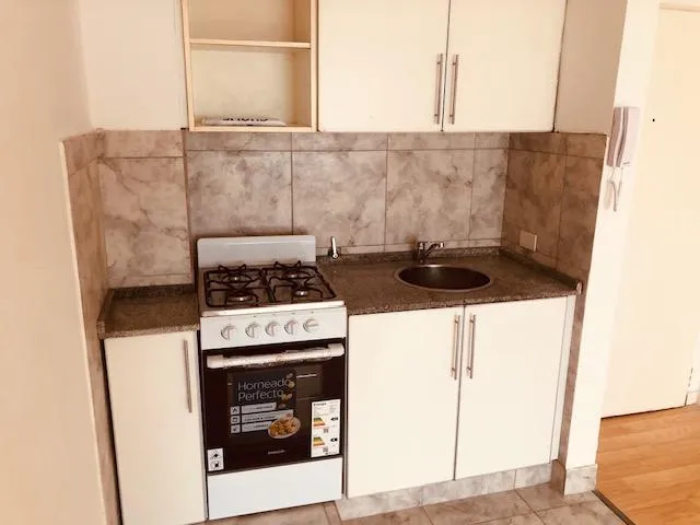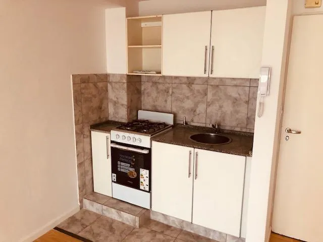 Renovated studio apartment in Belgrano. Open-plan living area with an American kitchen fitted with a gas cooktop and oven, plus upper and base cabinets. Full bathroom; pre-installation for air conditioning and radiant floor heating with central hot water. The building has laundry, pool, BBQ area and a terrace, and the listing states the unit pays no building fees, ABL or water. The apartment has been freshly painted and does not allow pets.