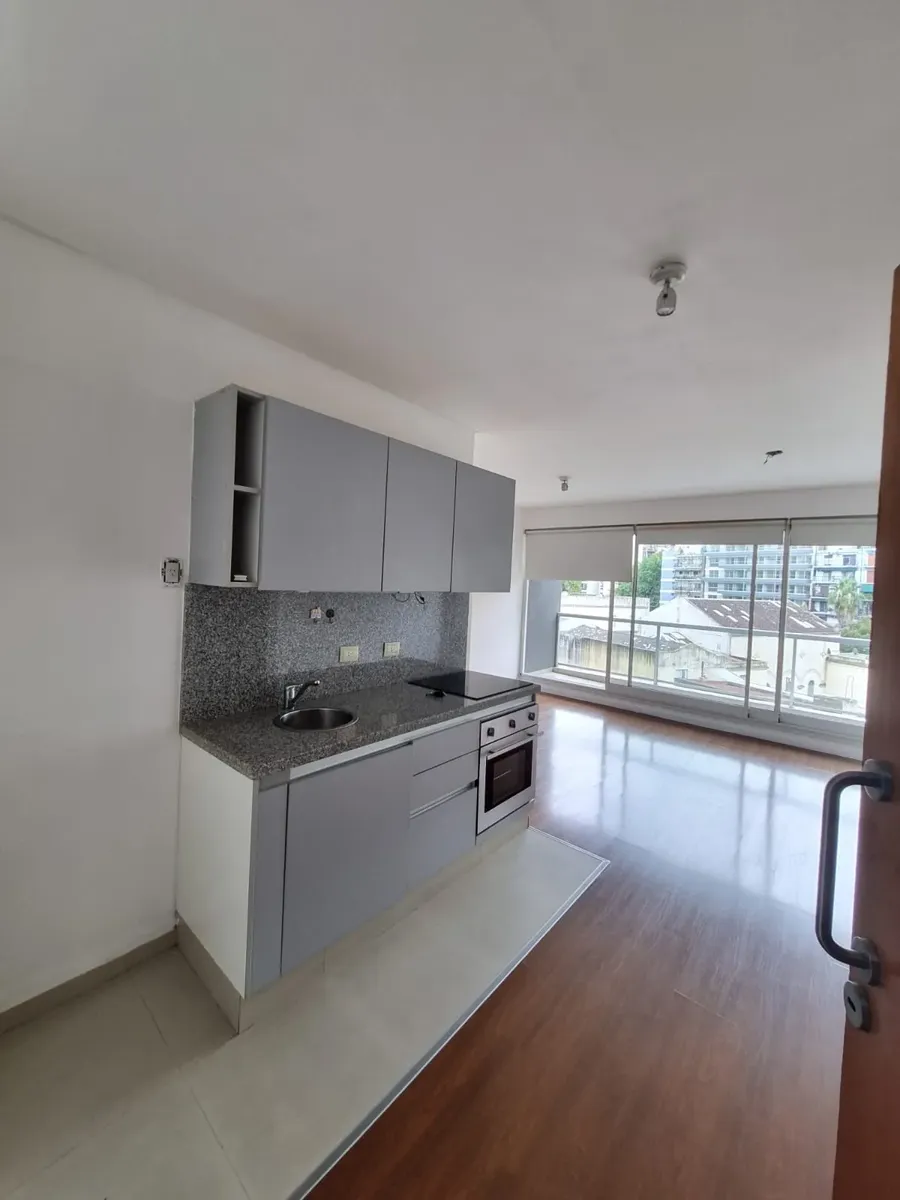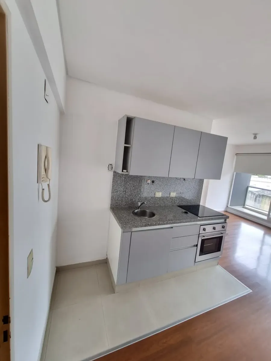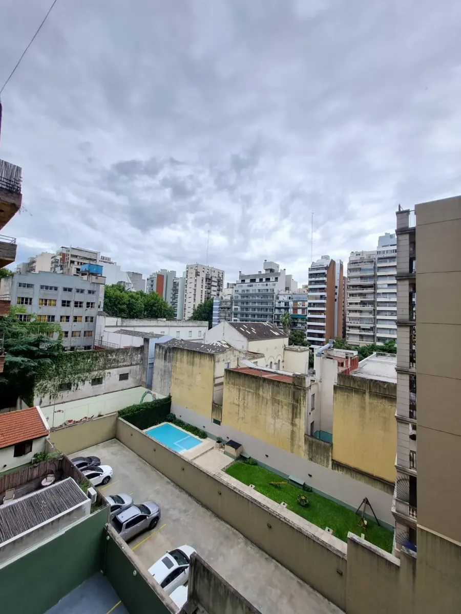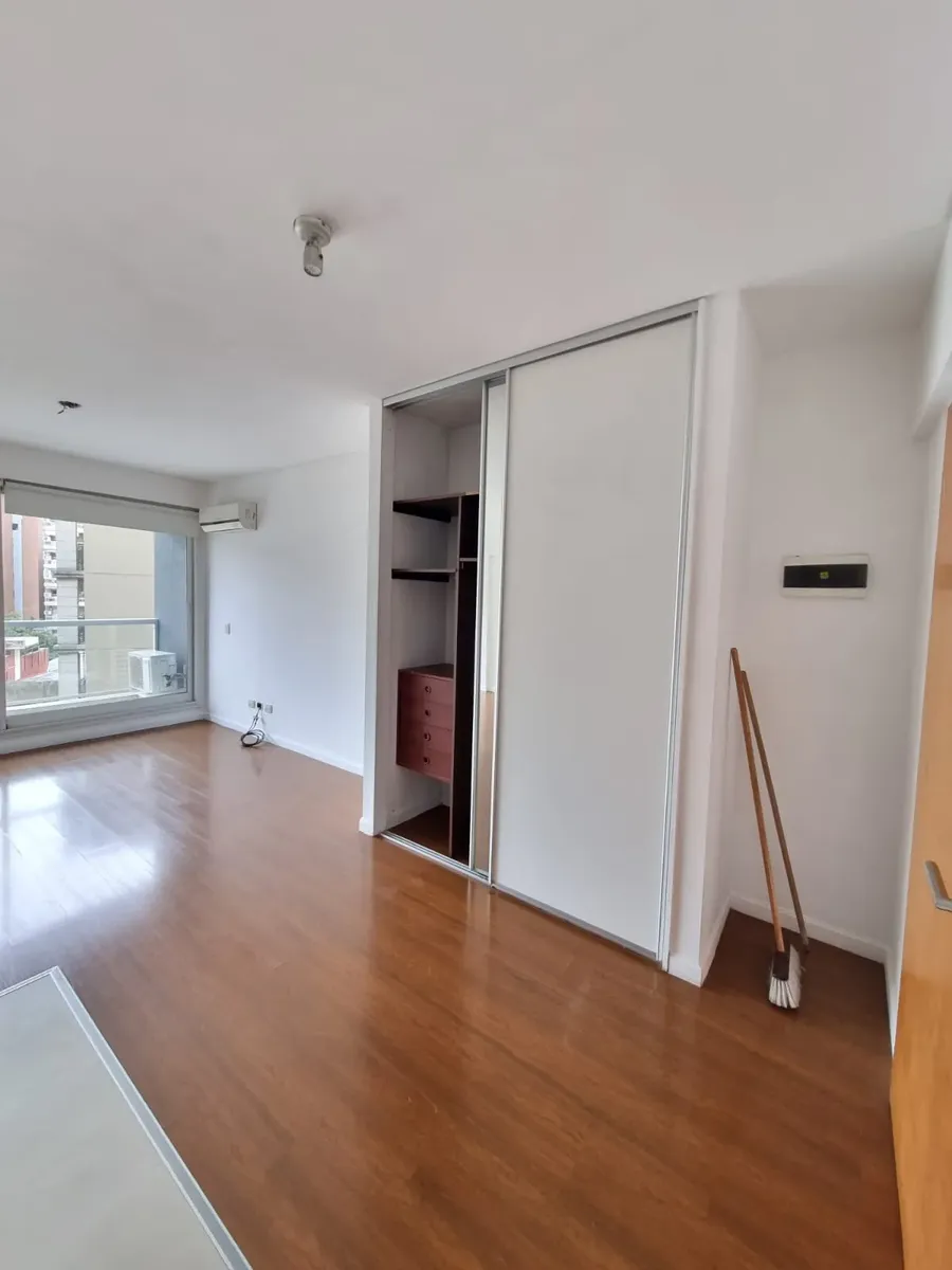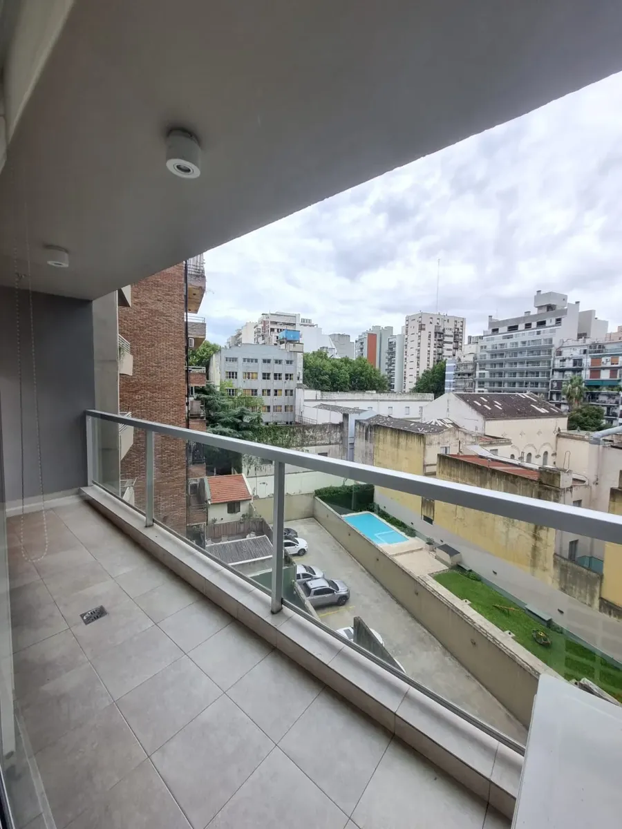 Studio apartment with a long balcony, courtyard-facing (contrafrente). Located in Belgrano and includes all building amenities.