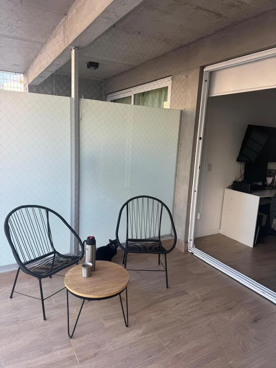 Studio apartment in Belgrano with street-facing frontage on Montañeses between Olazábal and Mendoza. The unit includes a terrace-style balcony with a private grill, east orientation, a full bathroom, a folding bed, and air conditioning (hot/cold). The kitchen has a connection for a washer and the building offers a communal grill and a solarium on the top floor. Building fees are described as low.