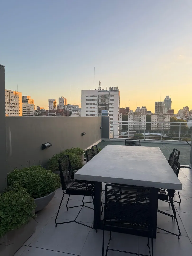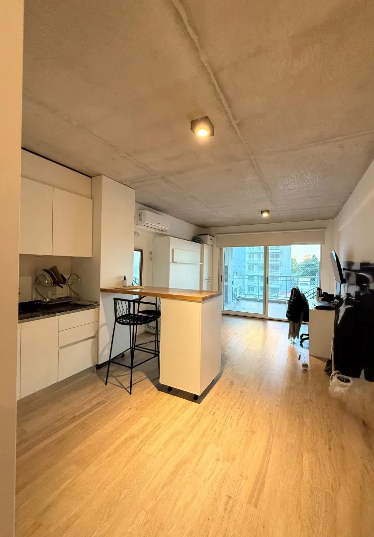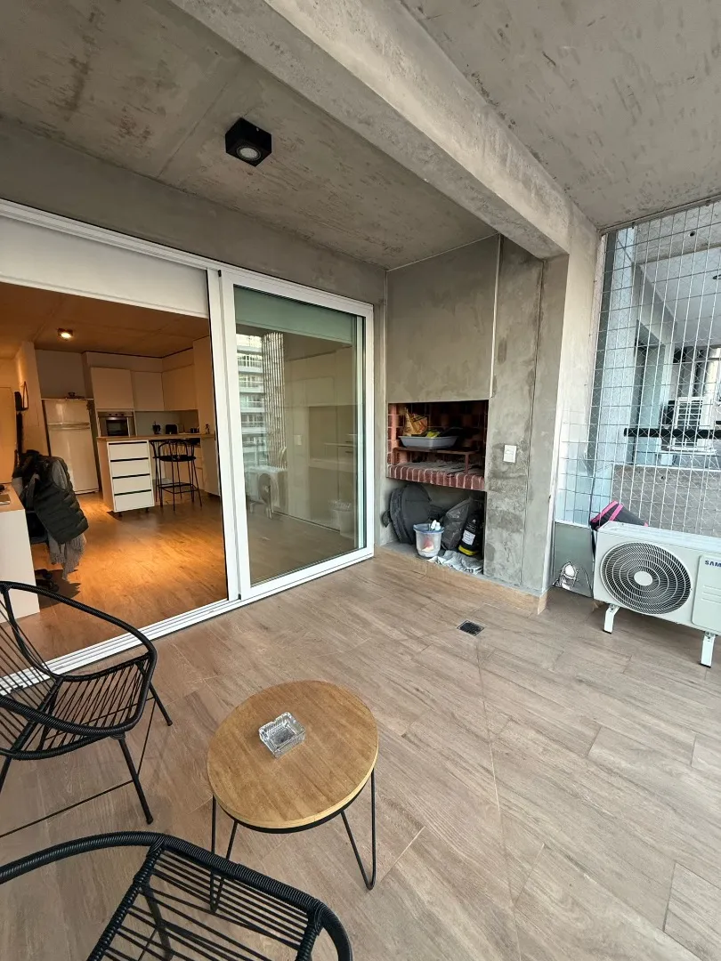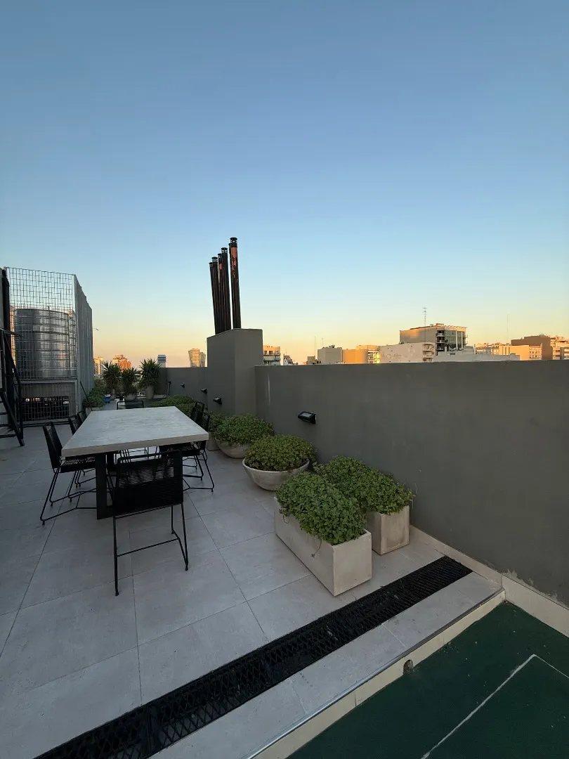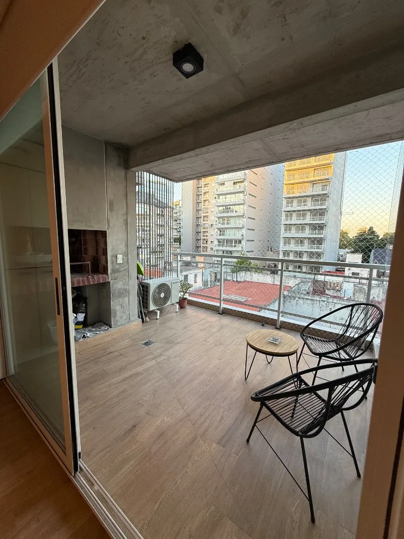Studio apartment with a terrace-style balcony and a private grill in Barrio Chino, Belgrano. The unit is located on Montañeses street and is in excellent condition, 18 months old. It has an all-electric integrated kitchen, a full bathroom with bathtub, and a Murphy bed integrated with the main room; there is also a fitted bar and space in the basement for a bicycle. The building includes a shared terrace with a rest area, outdoor shower, and communal grill and meeting area. Available from 1/05;