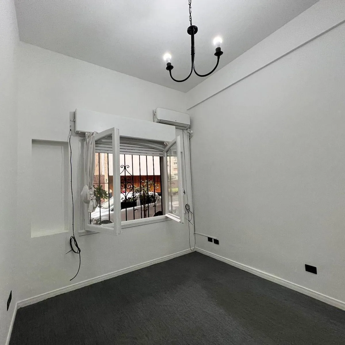 Studio apartment on the ground floor, street-facing, with a front window featuring wrought-iron bars and a shutter. The studio has a built-in wardrobe and carpet flooring and includes new hot-and-cold air conditioning. It has a full bathroom and a small, separate kitchen with a gas cooker and space for a fridge.