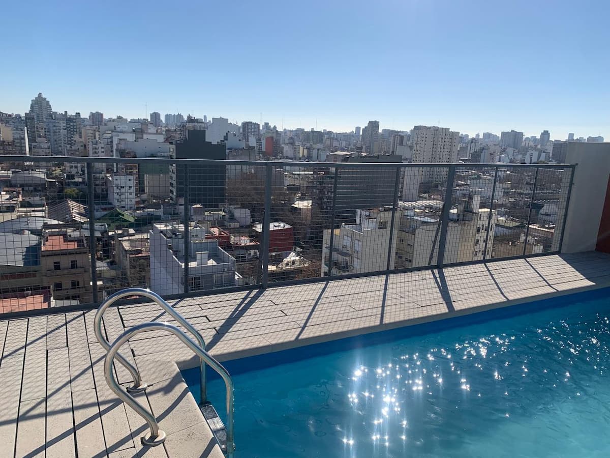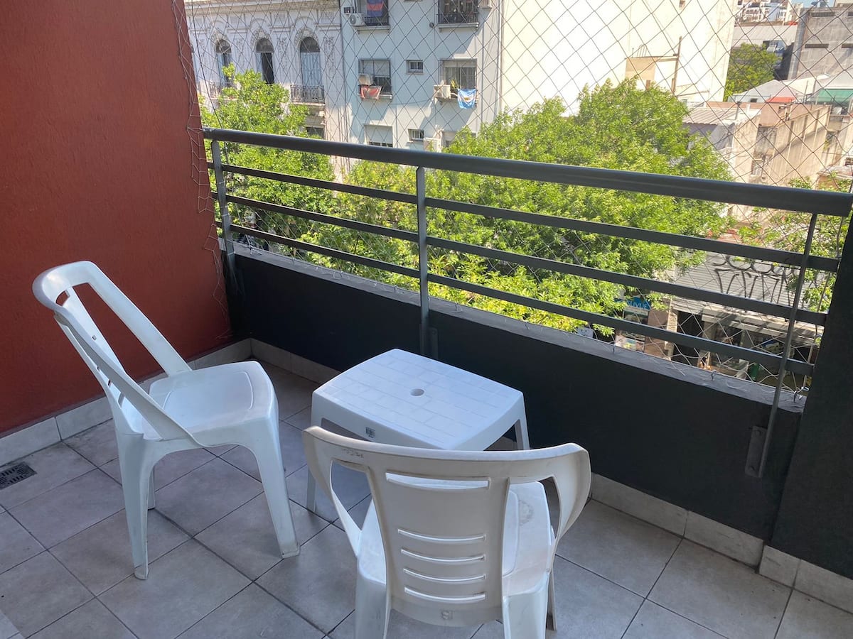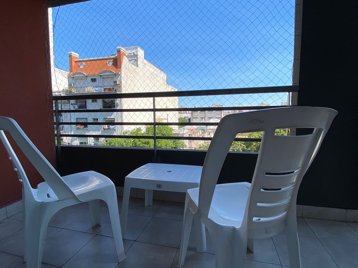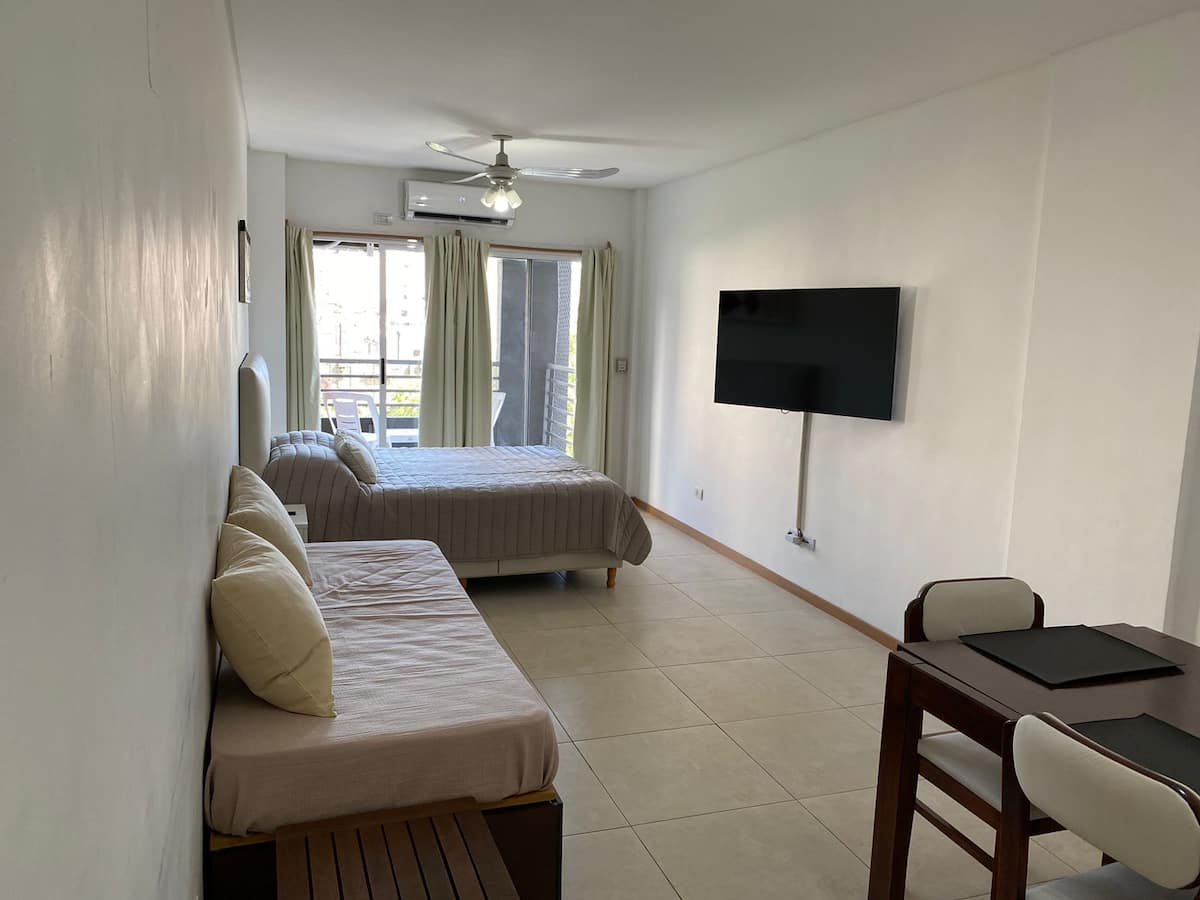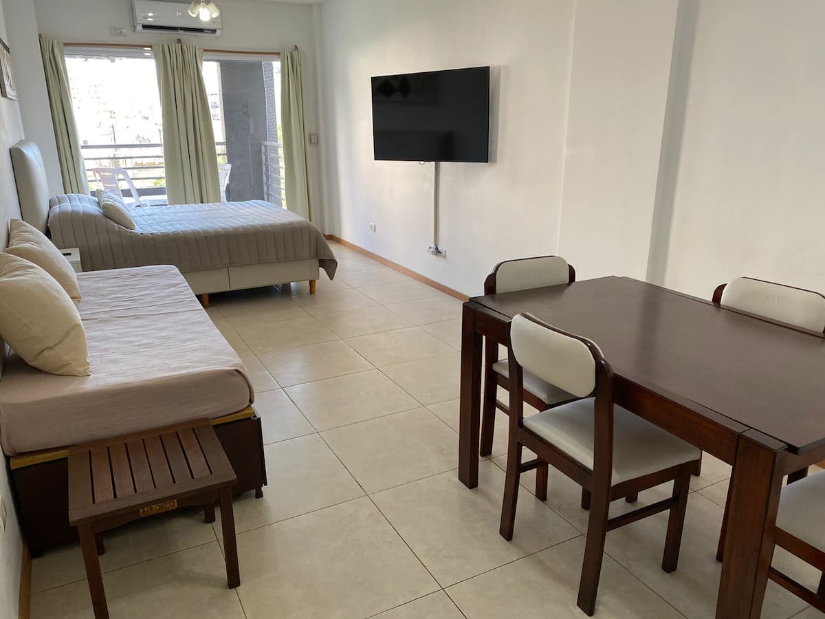 Studio apartment with balcony in Boedo. Fully equipped for up to 4 people, with a double bed in the bedroom area, a sofa bed in the living area, and a dining table with 4 chairs. Kitchen includes a stove, oven, microwave, a full-size refrigerator, and an espresso machine; the unit has a Smart LED TV and high-speed Wi‑Fi. The building has a swimming pool.