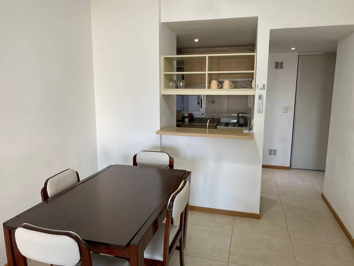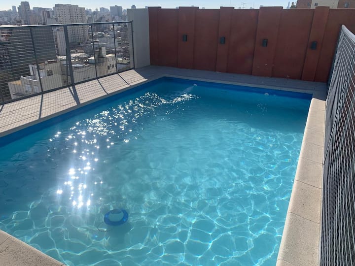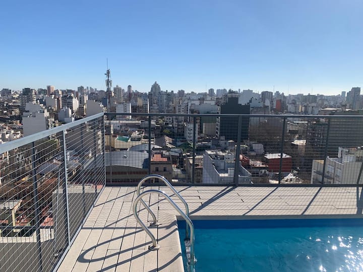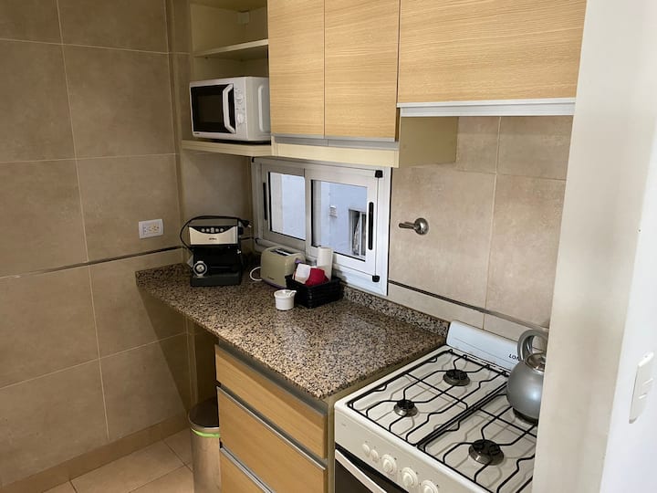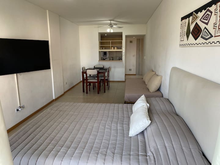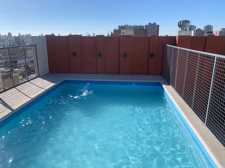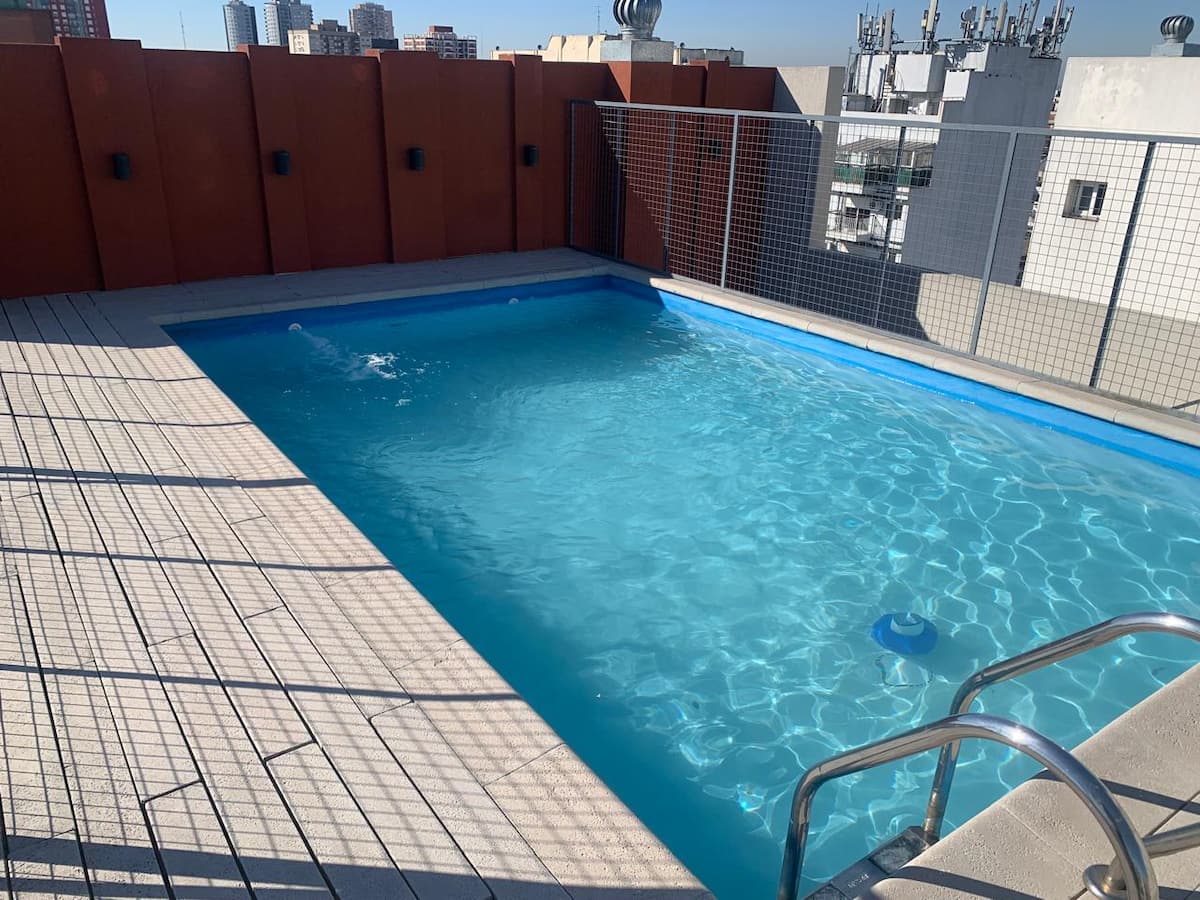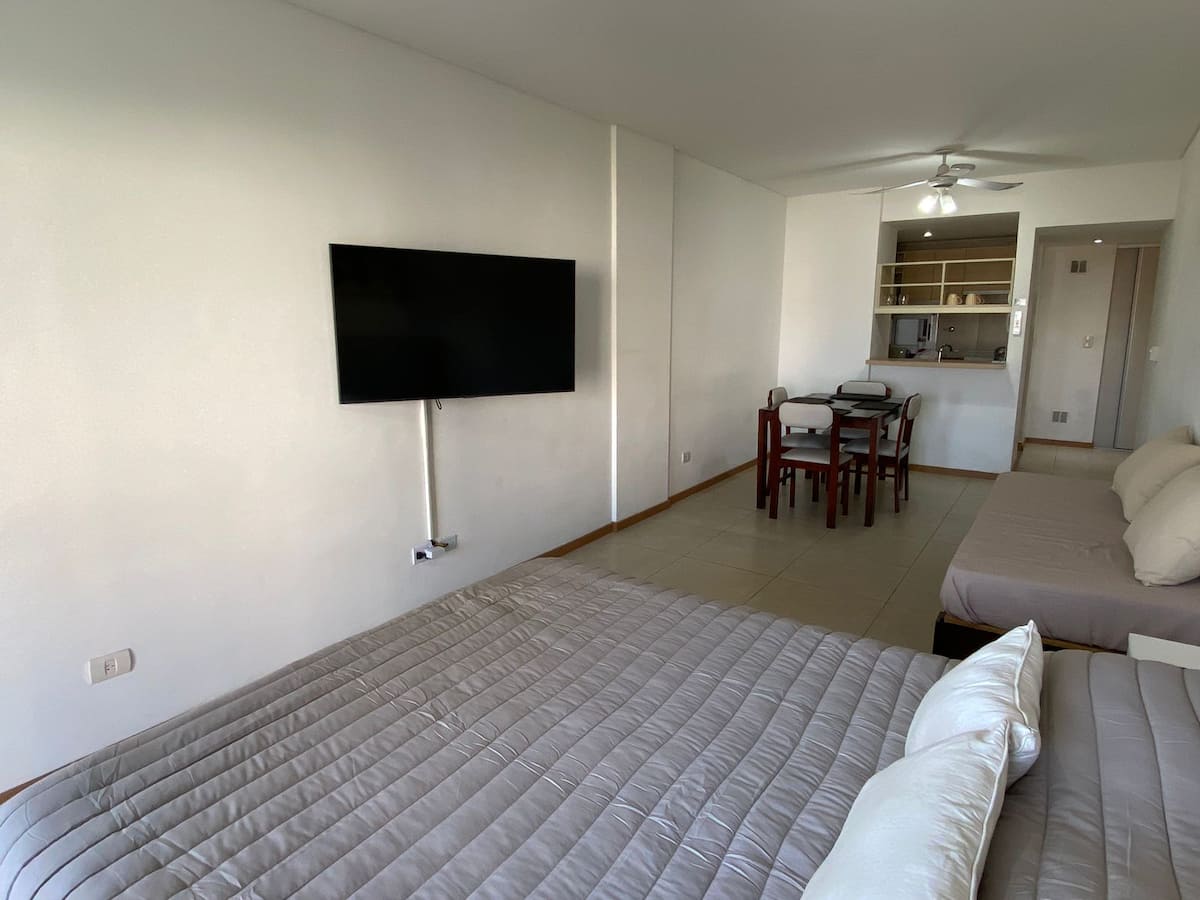 Studio apartment with balcony in Boedo. Fully equipped for up to 4 people, with a double bed in the bedroom area, a sofa bed in the living area, and a dining table with 4 chairs. Kitchen includes a stove, oven, microwave, a full-size refrigerator, and an espresso machine; the unit has a Smart LED TV and high-speed Wi‑Fi. The building has a swimming pool.