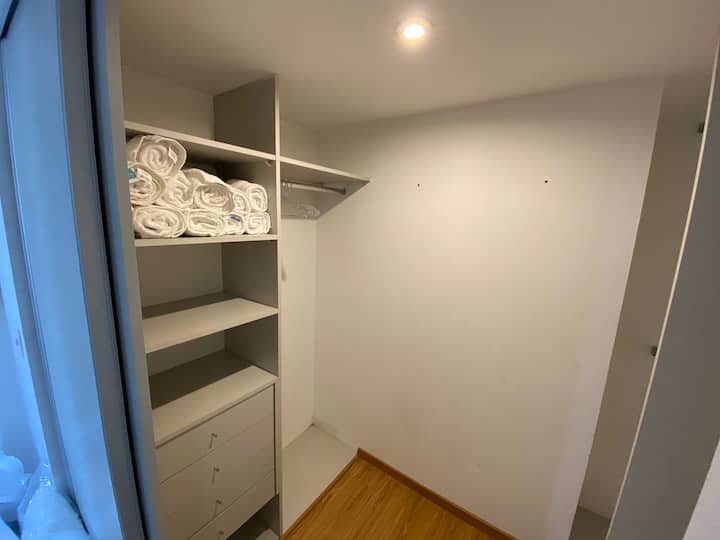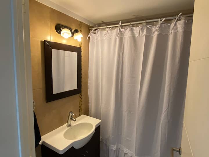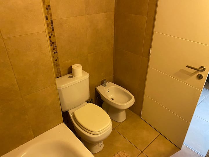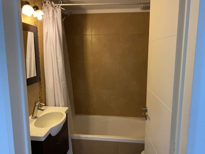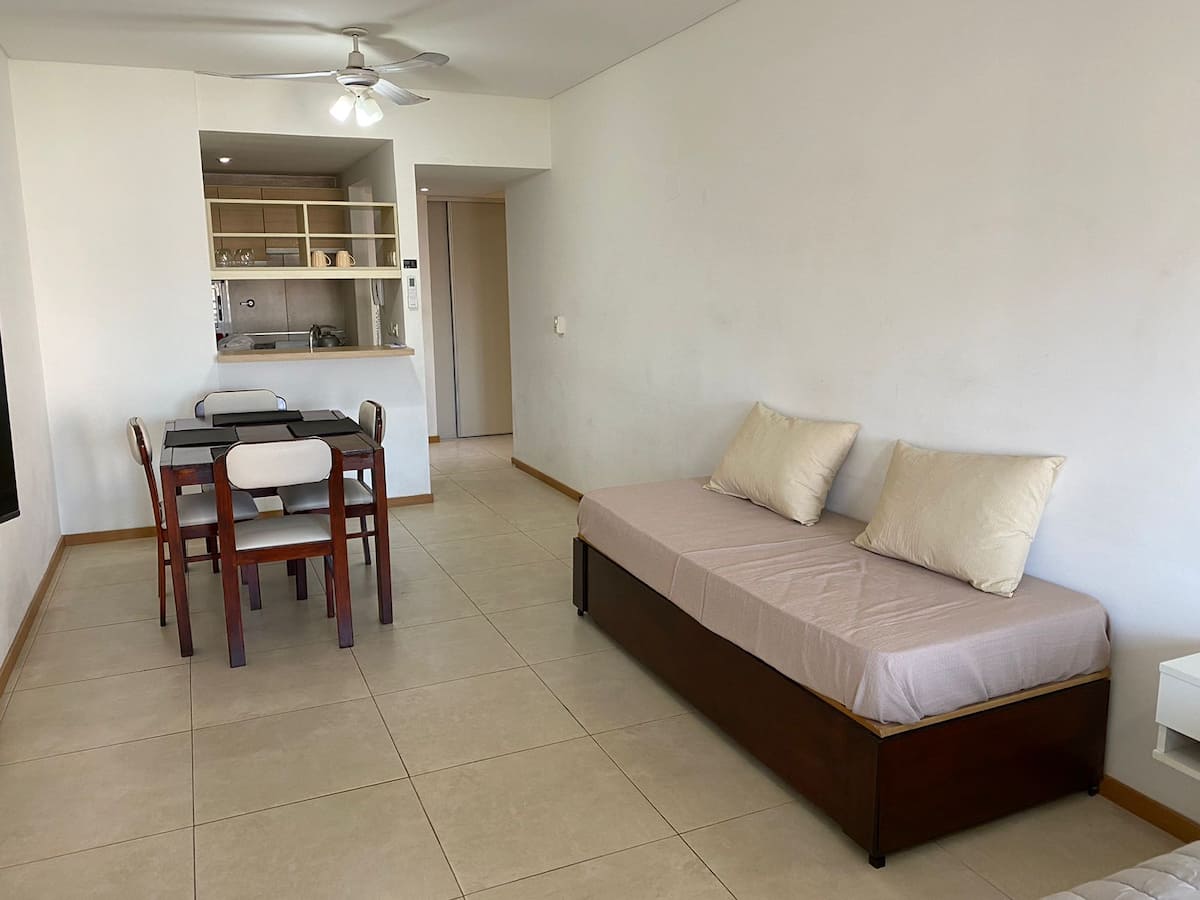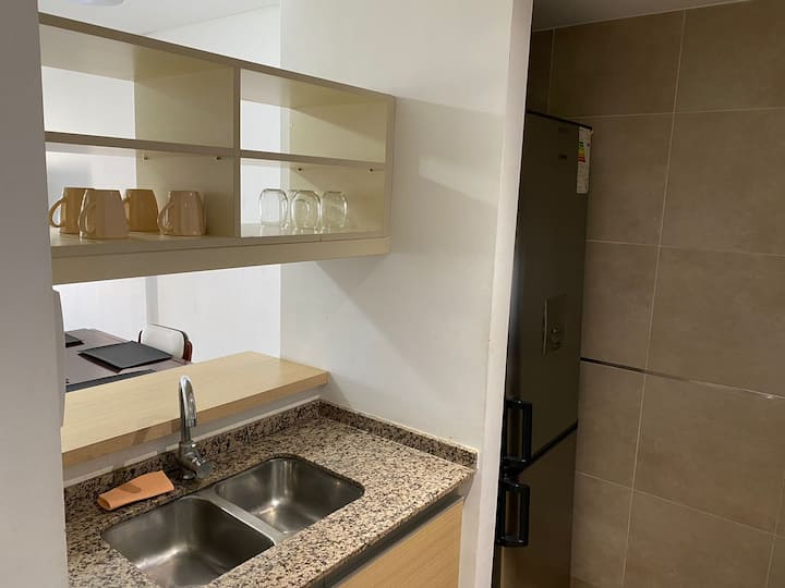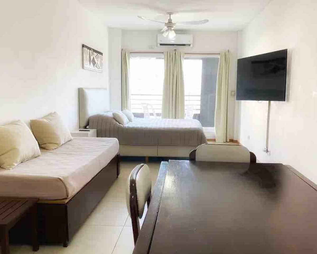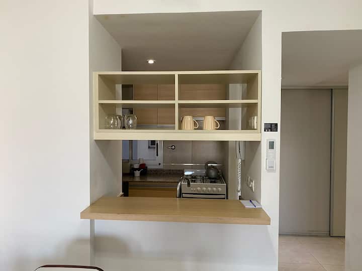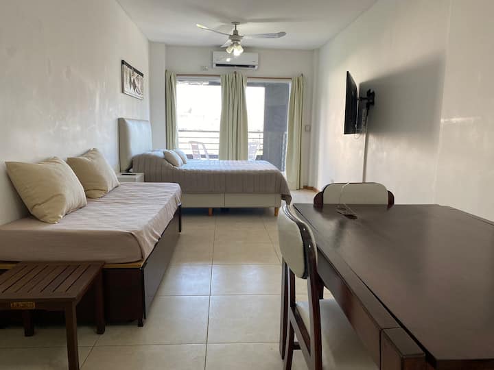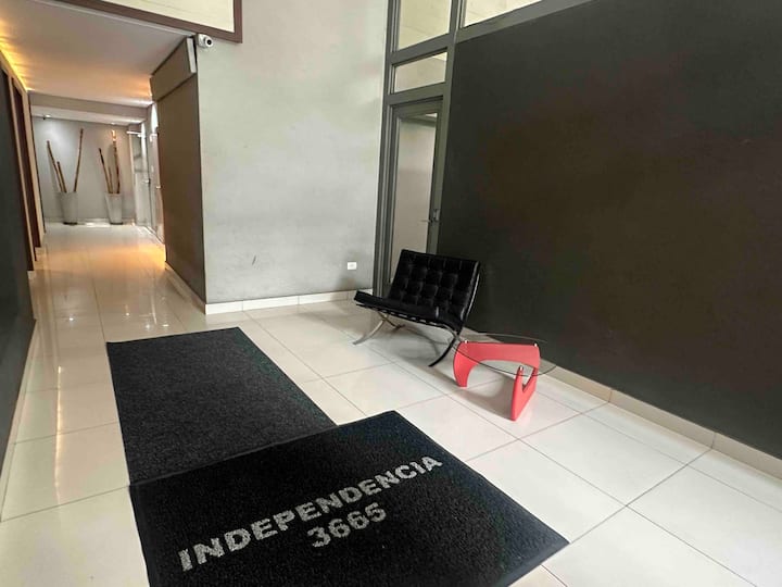 Studio apartment with balcony in Boedo. Fully equipped for up to 4 people, with a double bed in the bedroom area, a sofa bed in the living area, and a dining table with 4 chairs. Kitchen includes a stove, oven, microwave, a full-size refrigerator, and an espresso machine; the unit has a Smart LED TV and high-speed Wi‑Fi. The building has a swimming pool.