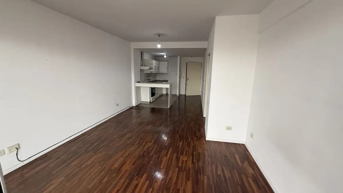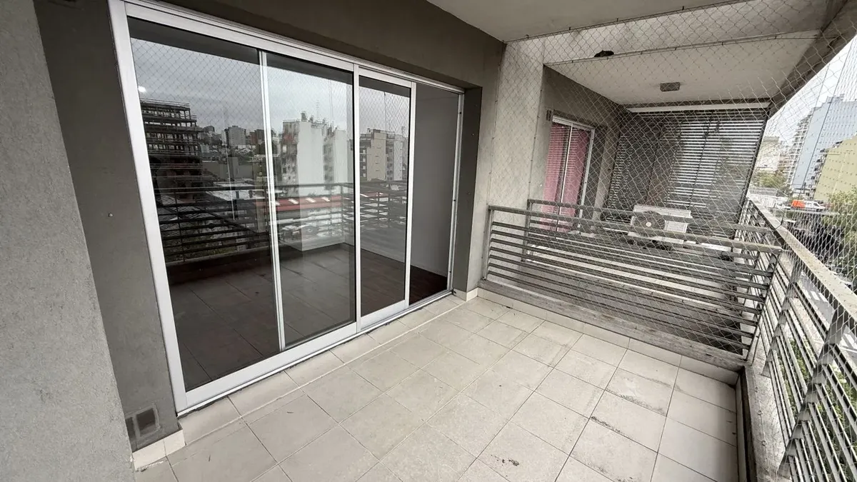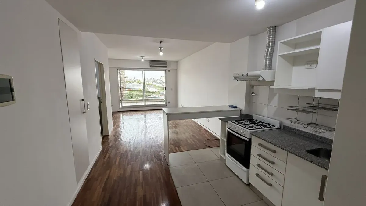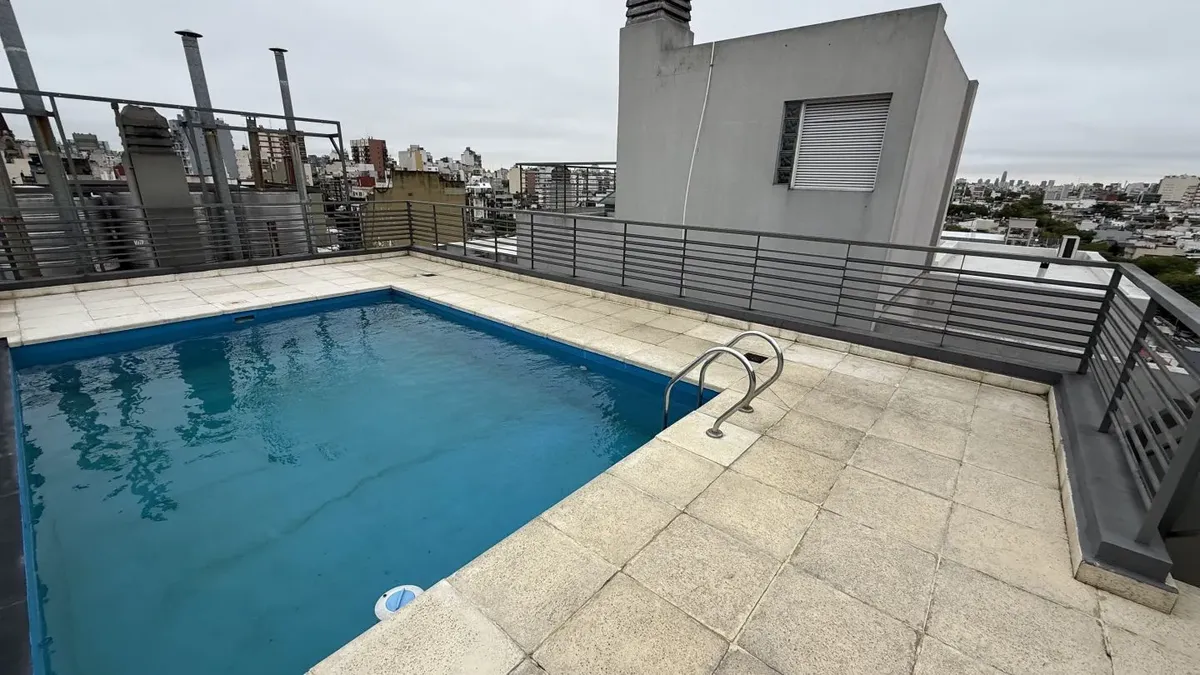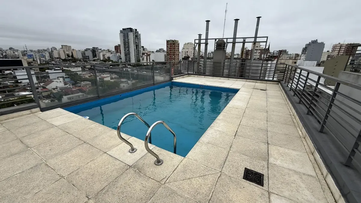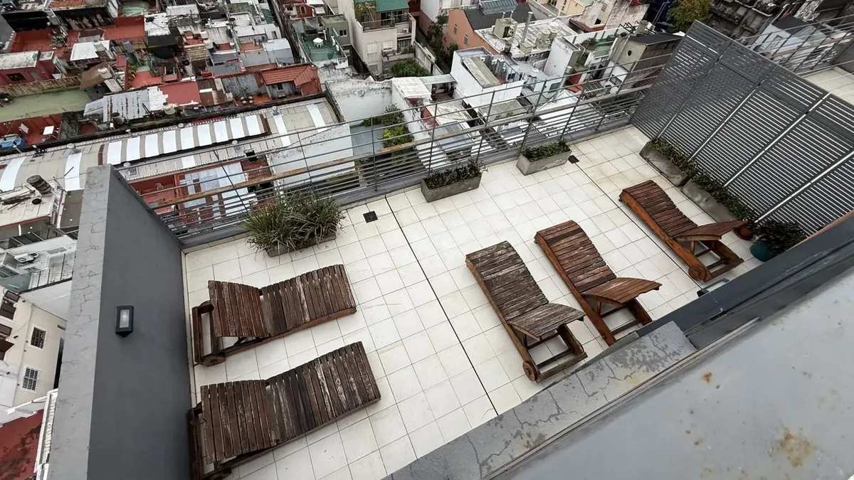 Studio or one-room apartment of approximately 40 m² total, 7th floor, street-facing, in Parque Chacabuco, Buenos Aires. Approx. 32 m² covered plus a front terrace balcony measuring approximately 3 x 2.30 m. Integrated gas kitchen, full bathroom with bathtub, built-in wardrobe, parquet floors in the main room and ceramic tiles in the kitchen and bathroom; split air conditioning; hot water via the building’s central boiler. The building offers terrace pool with solarium, locker rooms, laundry, gym