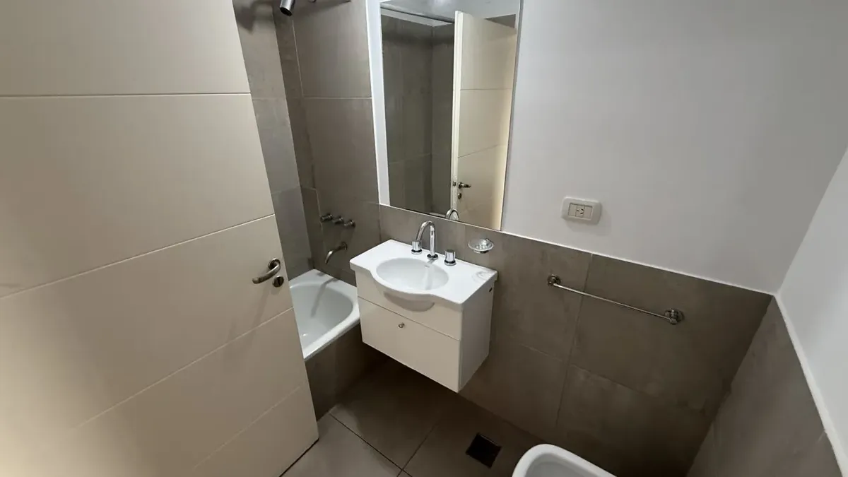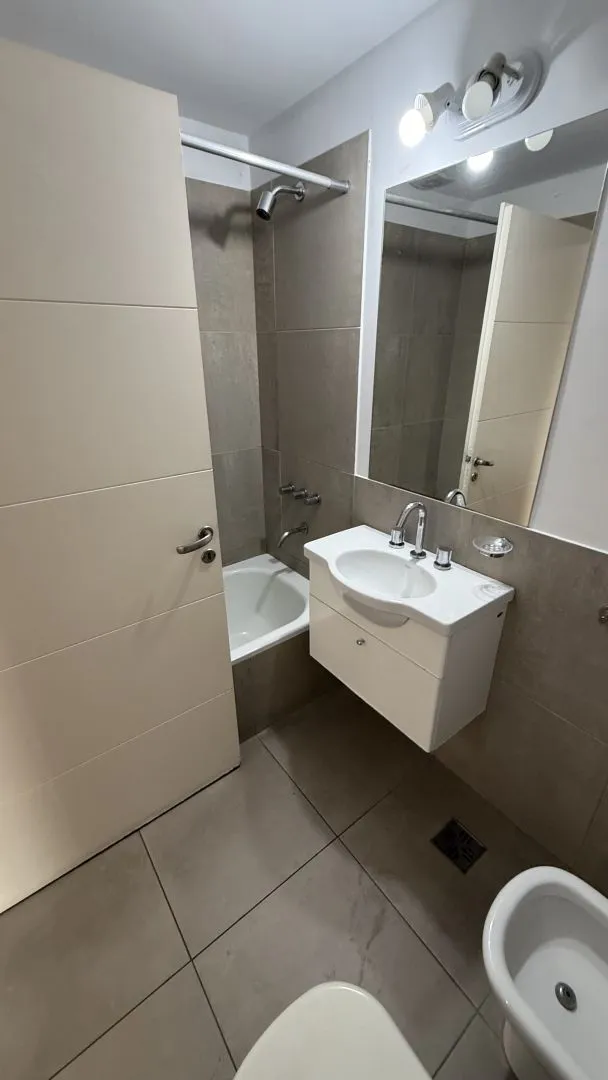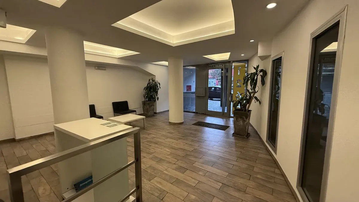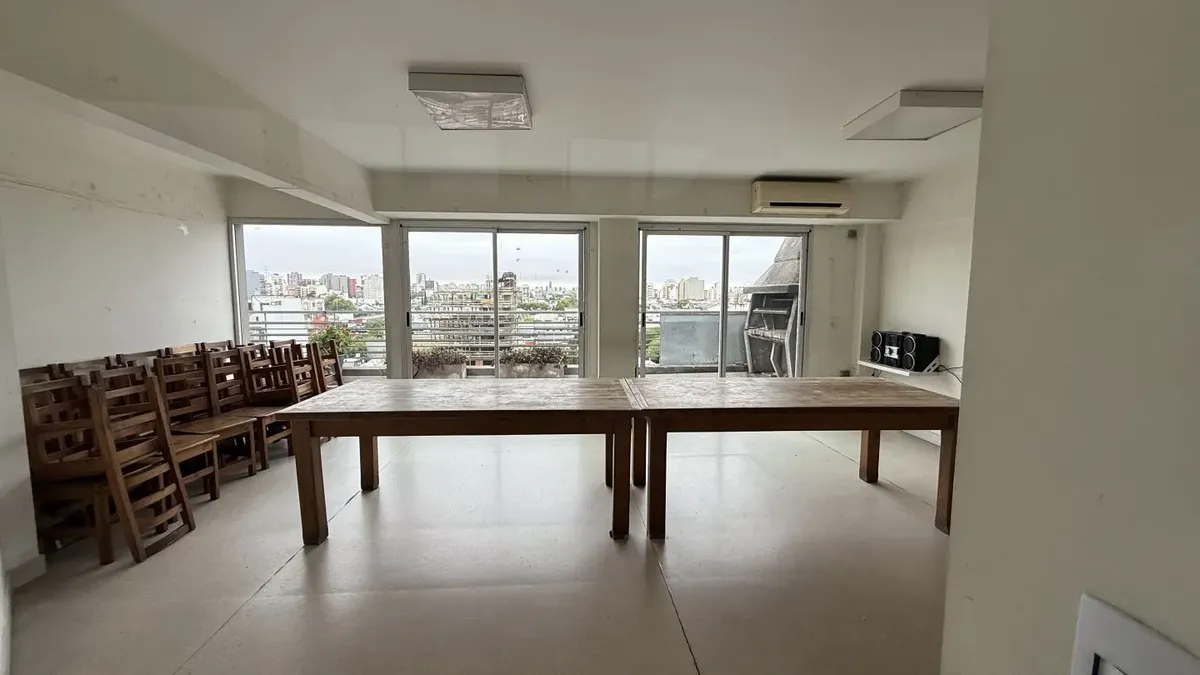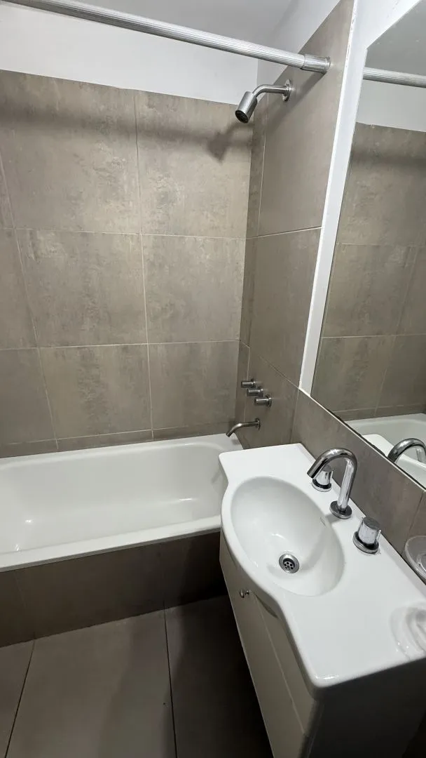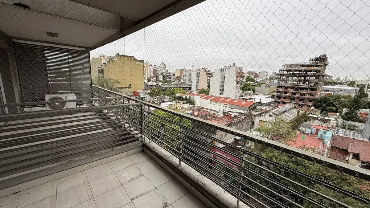 Studio or one-room apartment of approximately 40 m² total, 7th floor, street-facing, in Parque Chacabuco, Buenos Aires. Approx. 32 m² covered plus a front terrace balcony measuring approximately 3 x 2.30 m. Integrated gas kitchen, full bathroom with bathtub, built-in wardrobe, parquet floors in the main room and ceramic tiles in the kitchen and bathroom; split air conditioning; hot water via the building’s central boiler. The building offers terrace pool with solarium, locker rooms, laundry, gym