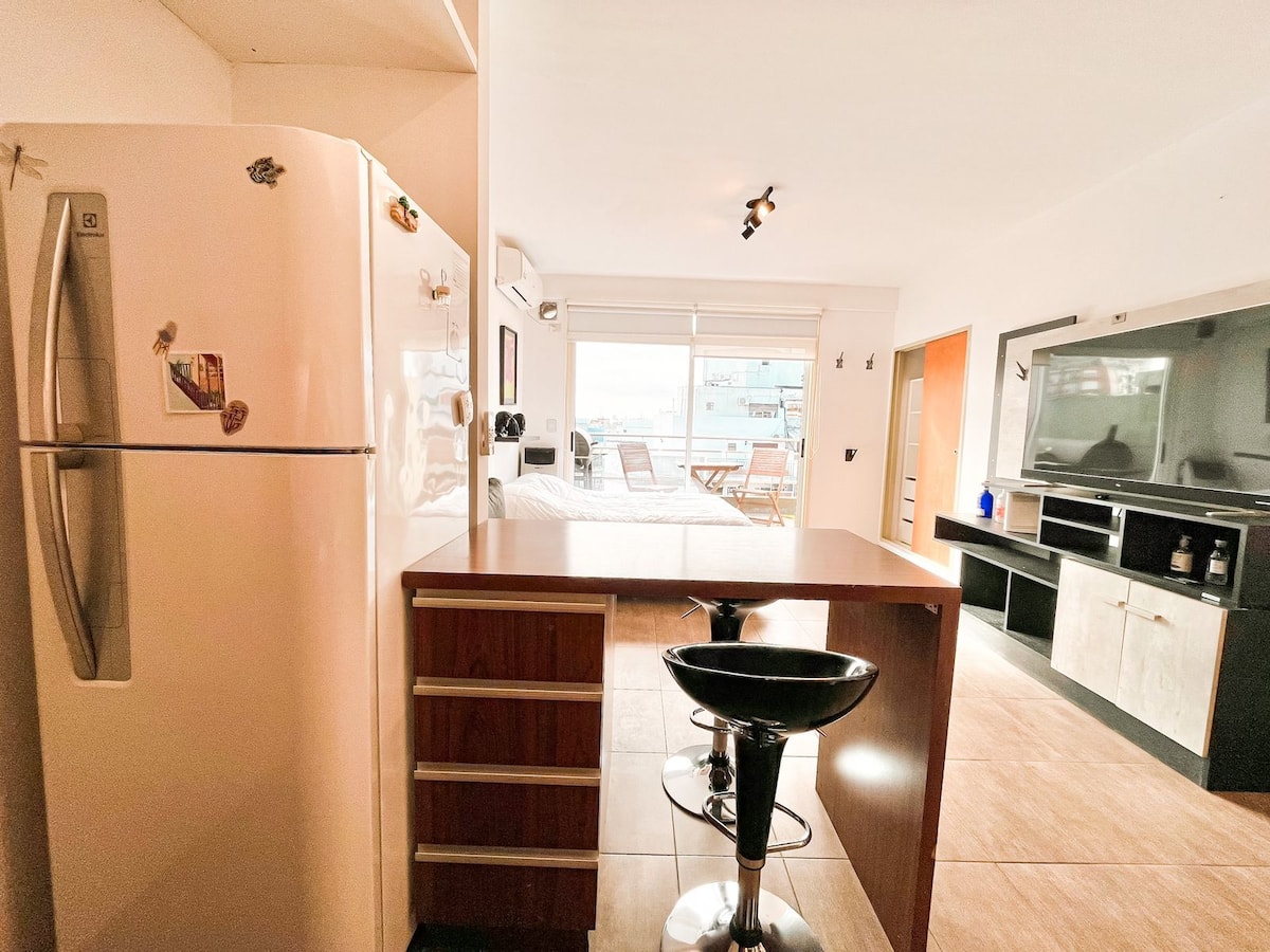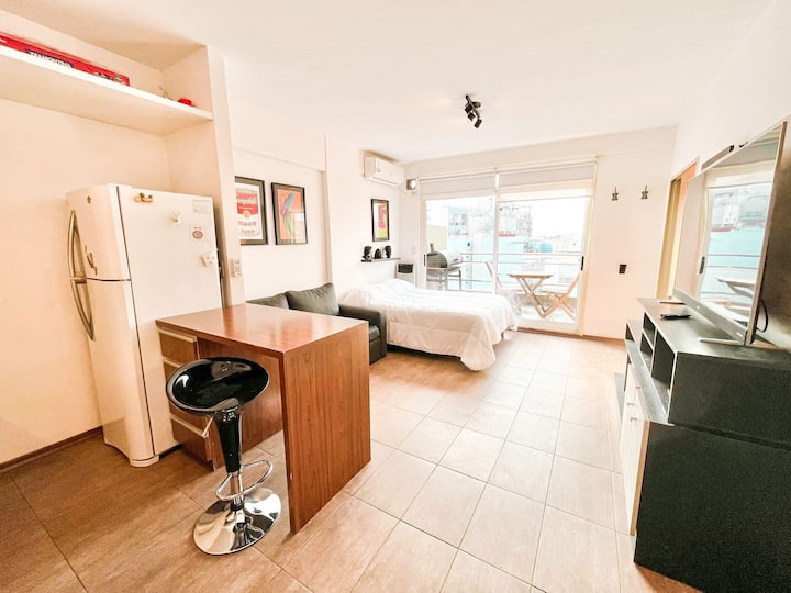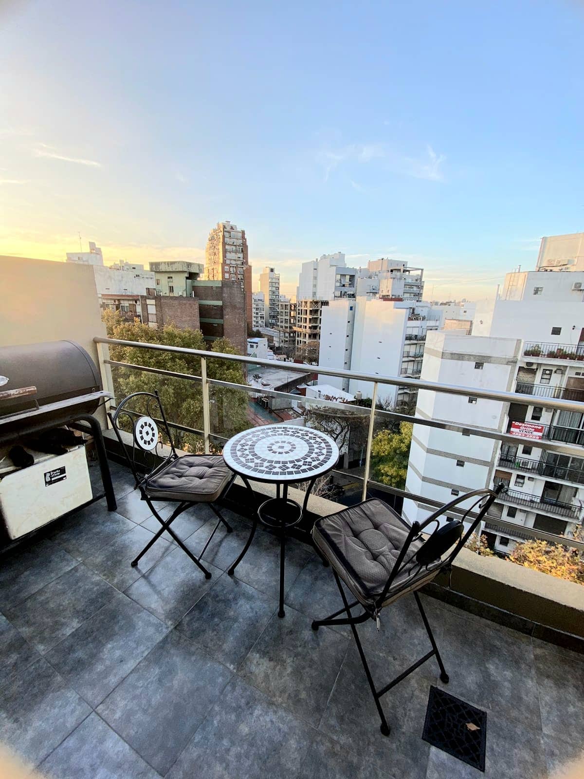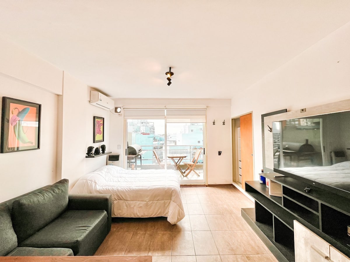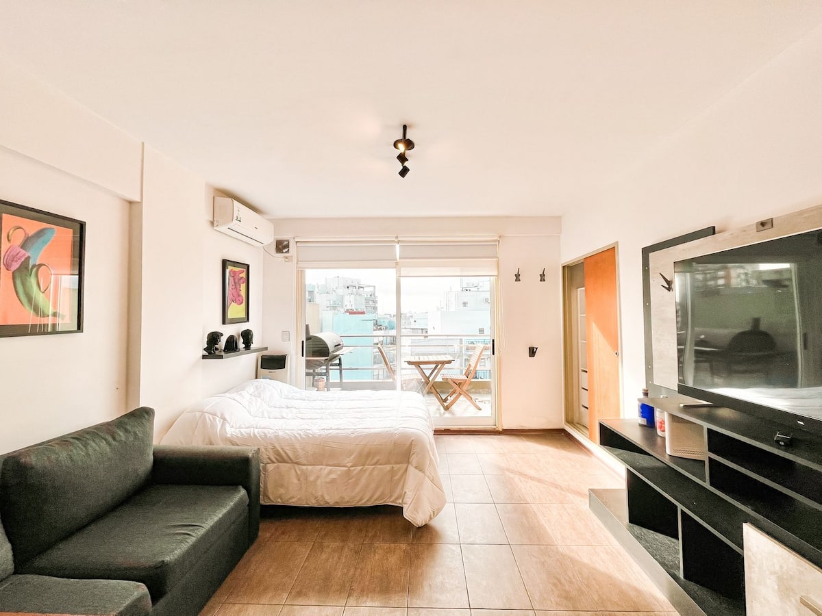 Top-floor studio apartment in Caballito with a private balcony and an exclusive grill. The property is furnished and equipped. Electricity consumption is subject to an additional charge for stays of 20 days or more if usage exceeds 500 kWh. Self check-in is available, and entry requires advance identification for all passengers to be registered with the building.