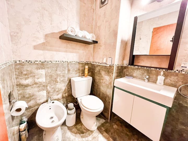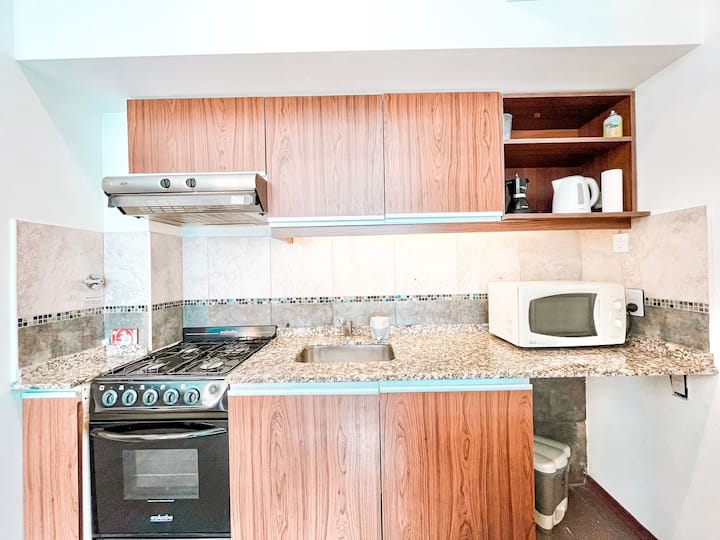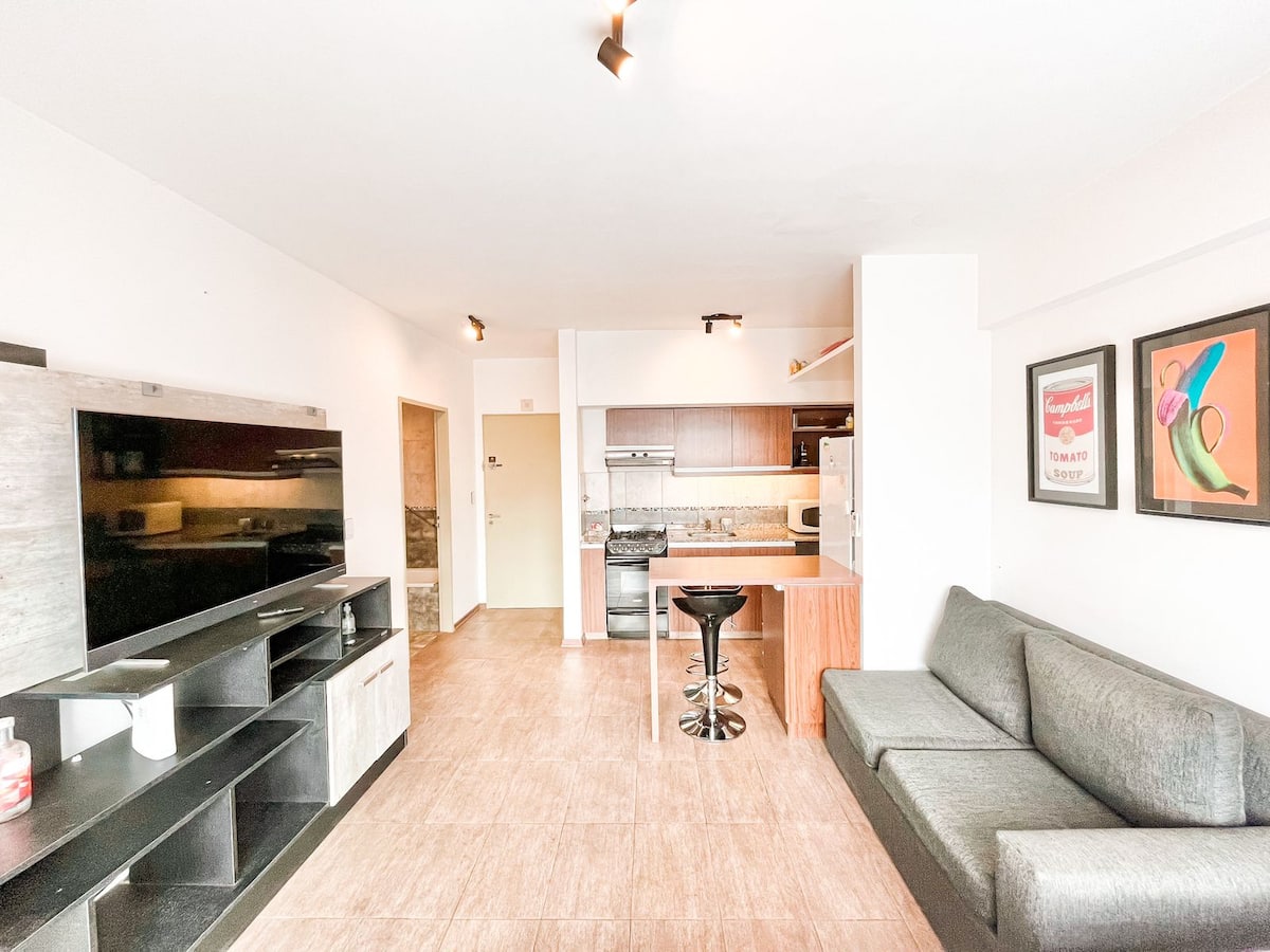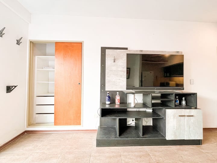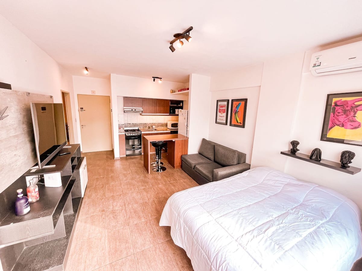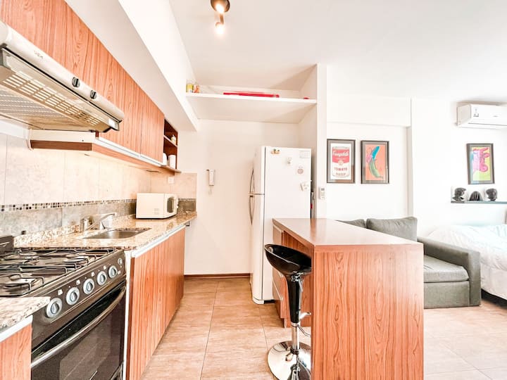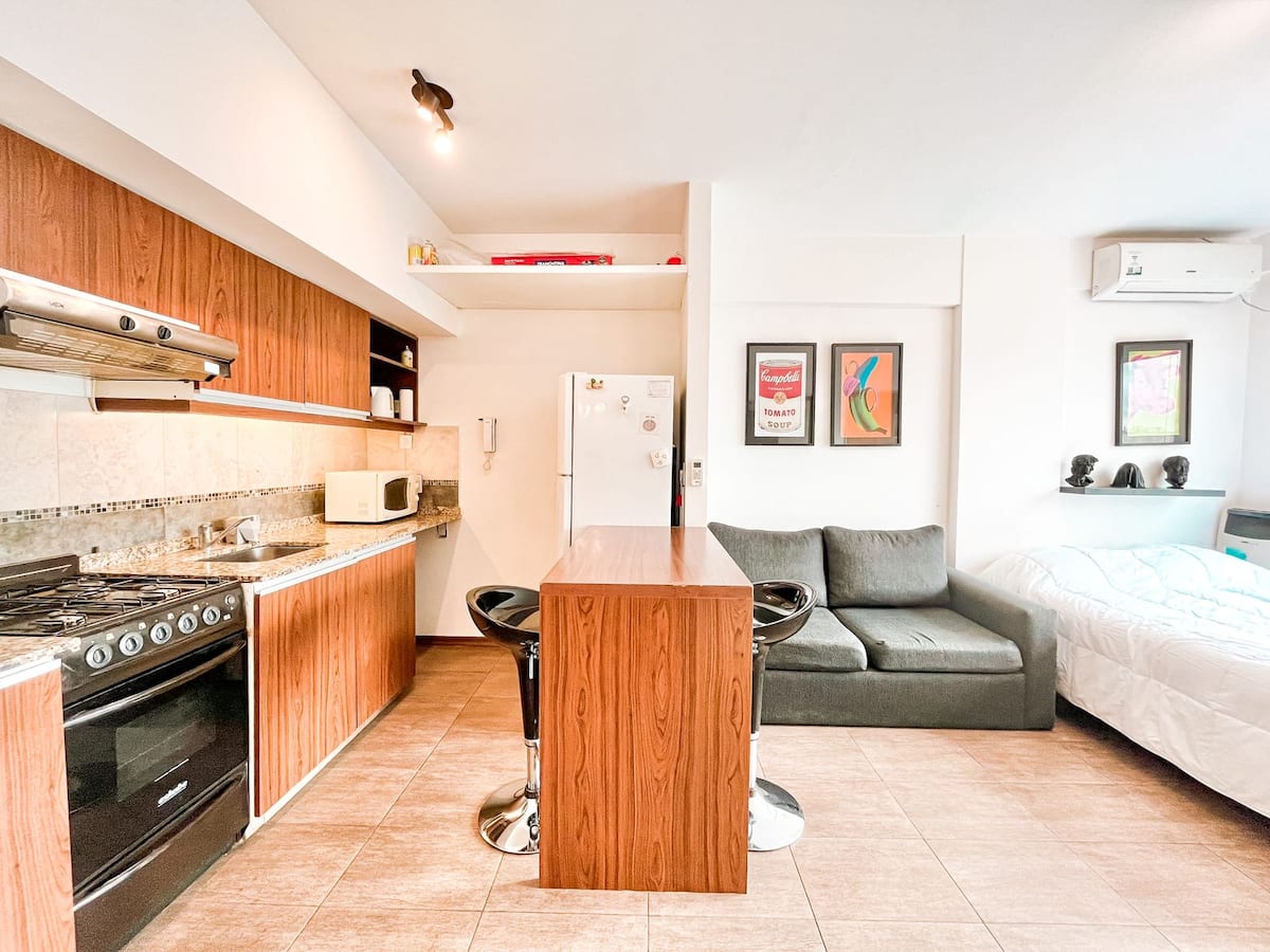 Top-floor studio apartment in Caballito with a private balcony and an exclusive grill. The property is furnished and equipped. Electricity consumption is subject to an additional charge for stays of 20 days or more if usage exceeds 500 kWh. Self check-in is available, and entry requires advance identification for all passengers to be registered with the building.